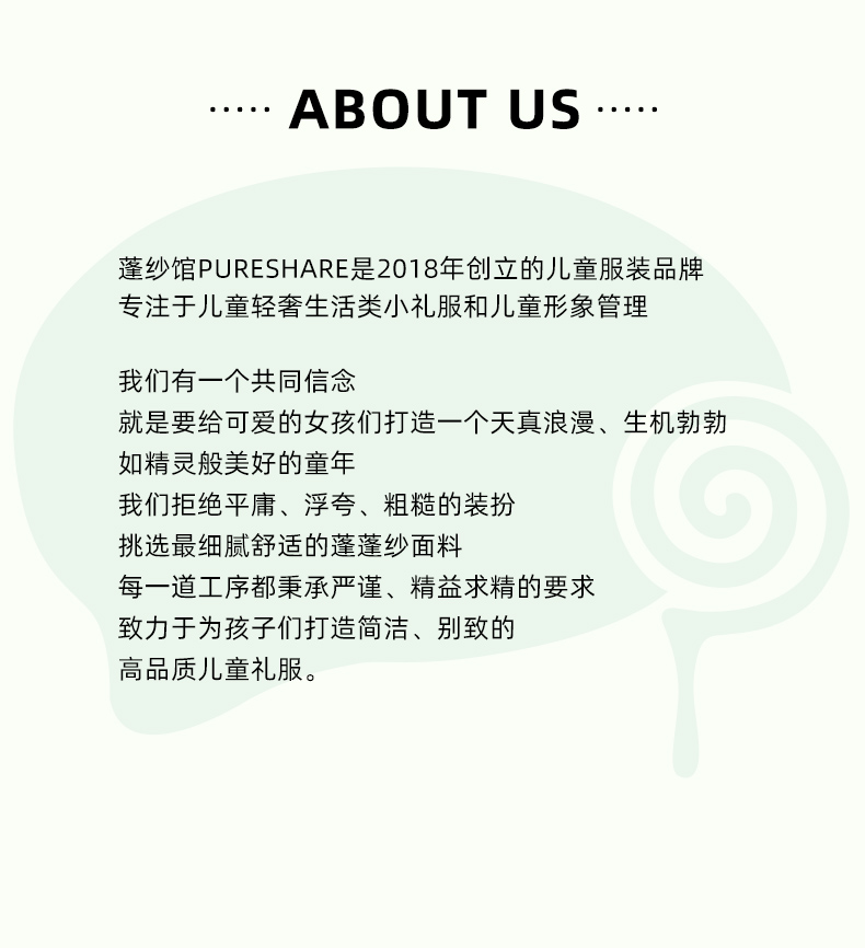 PureShare蓬纱馆,2018年创立的儿童服装品牌,专注于儿童轻奢生活类小礼服,主张“让孩子做最独特的自己”的品牌理念,为孩子们提供时尚简洁、优雅而又不失童真的生活类礼服。