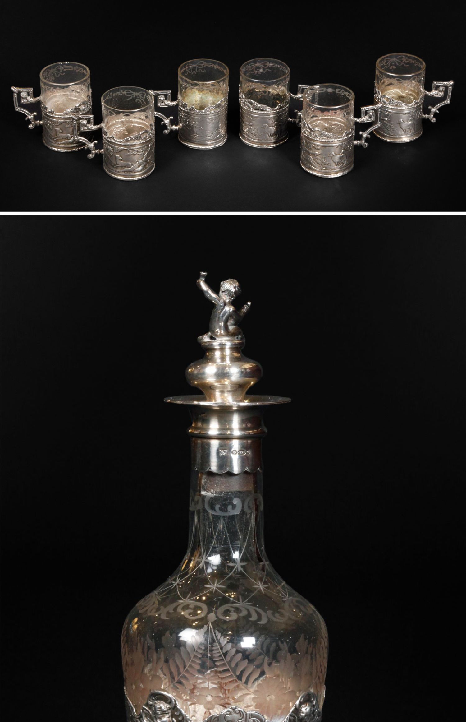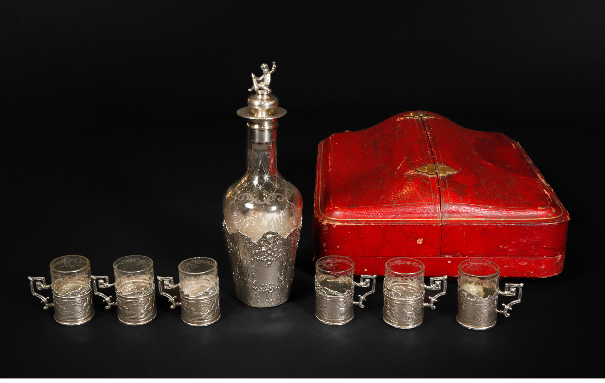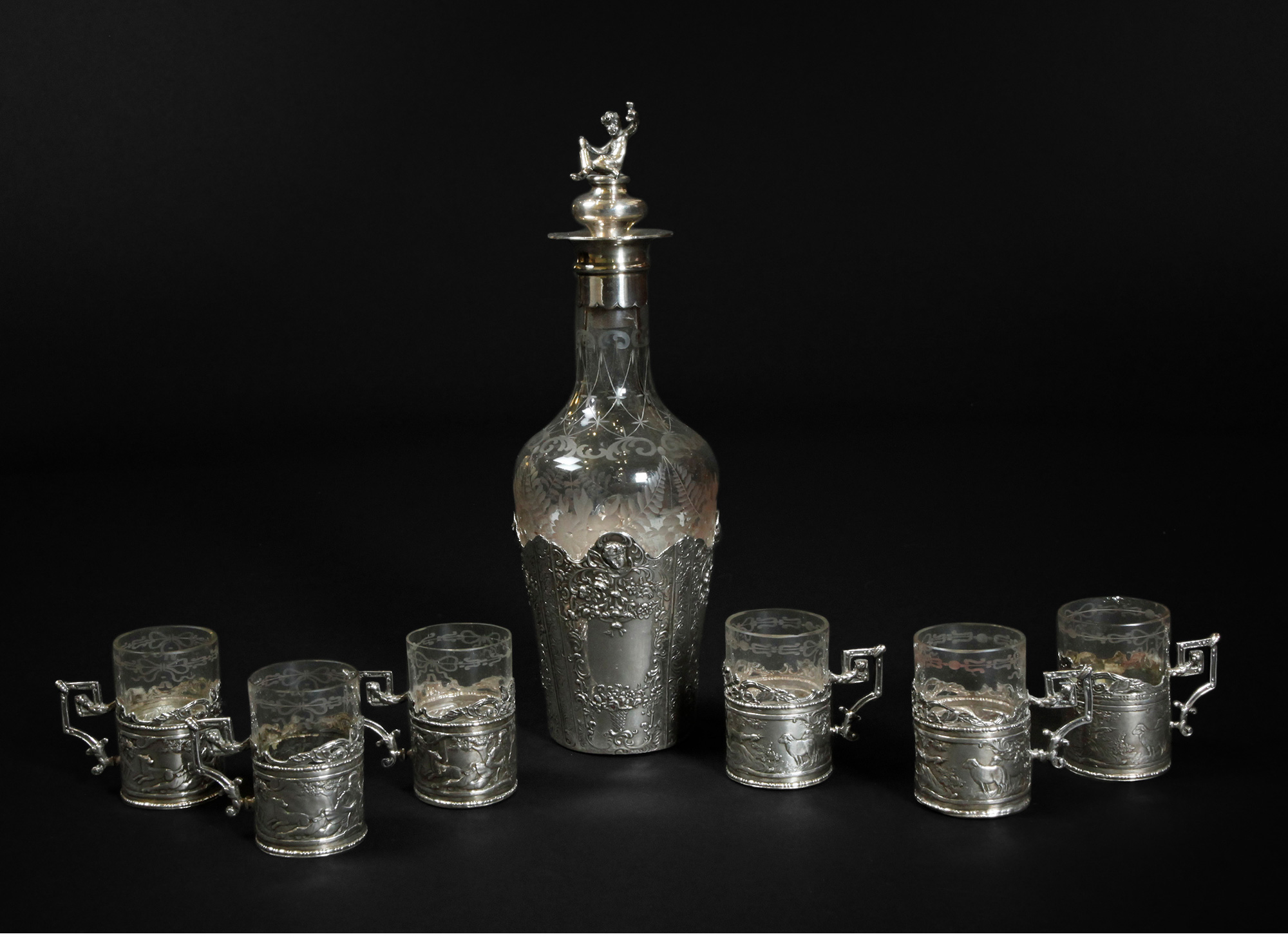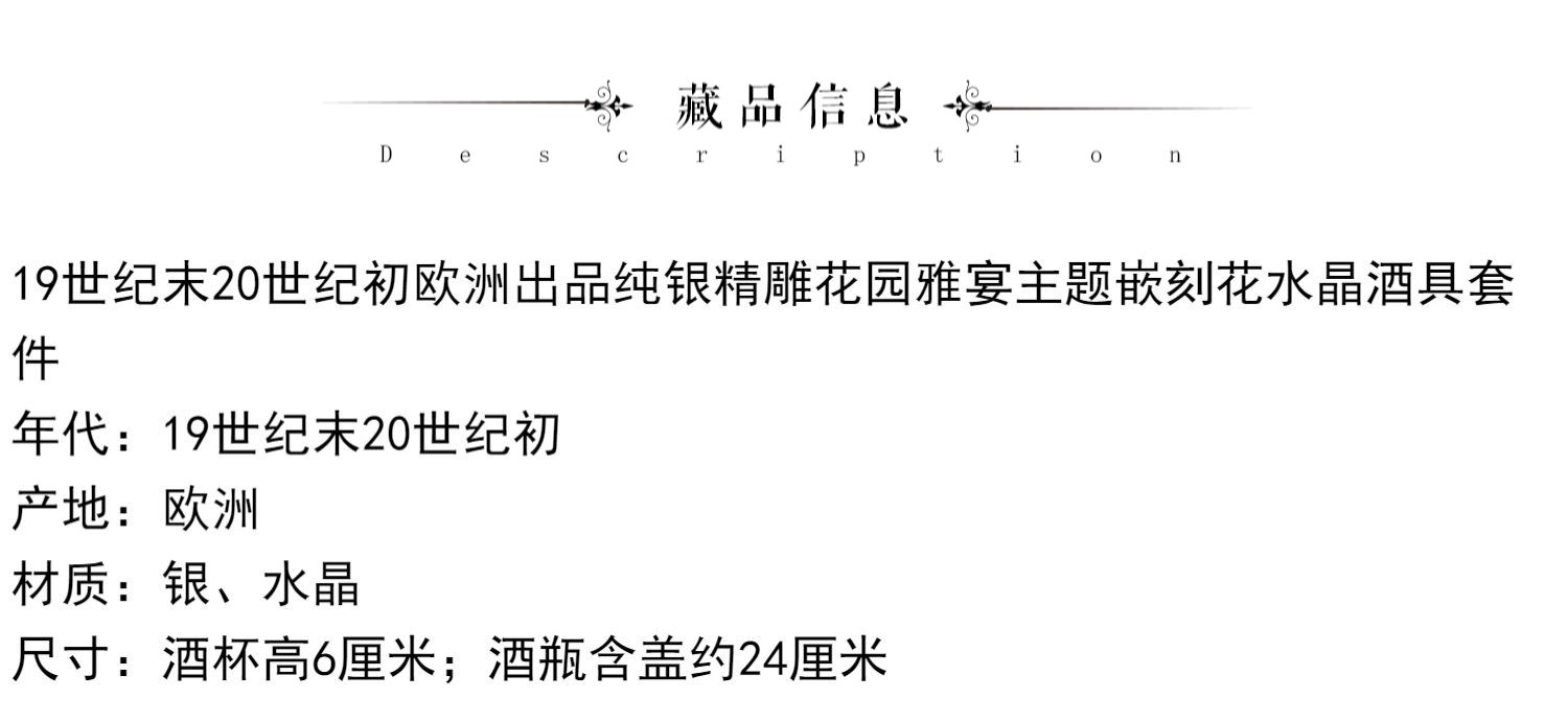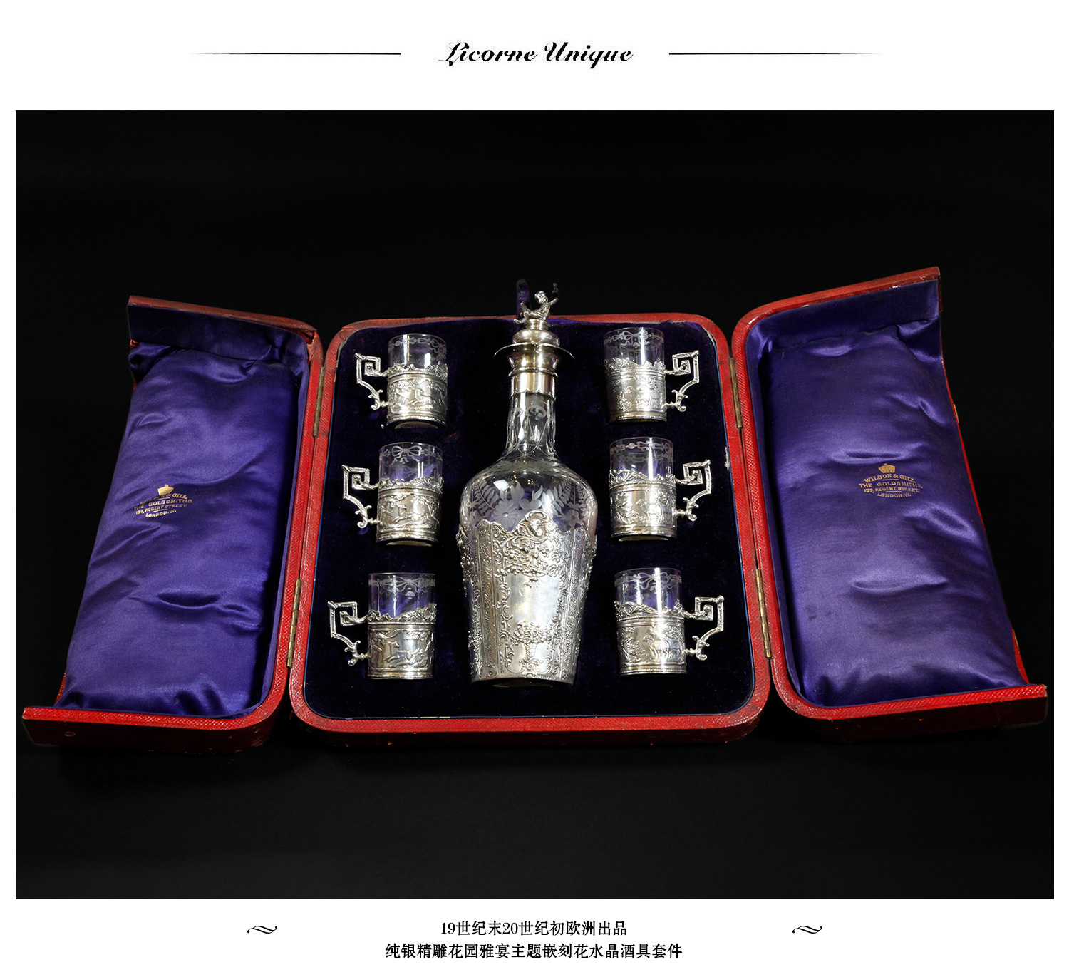 独角鹿西洋古董欧洲纯银精雕花园雅宴主题嵌刻花水晶酒具套装