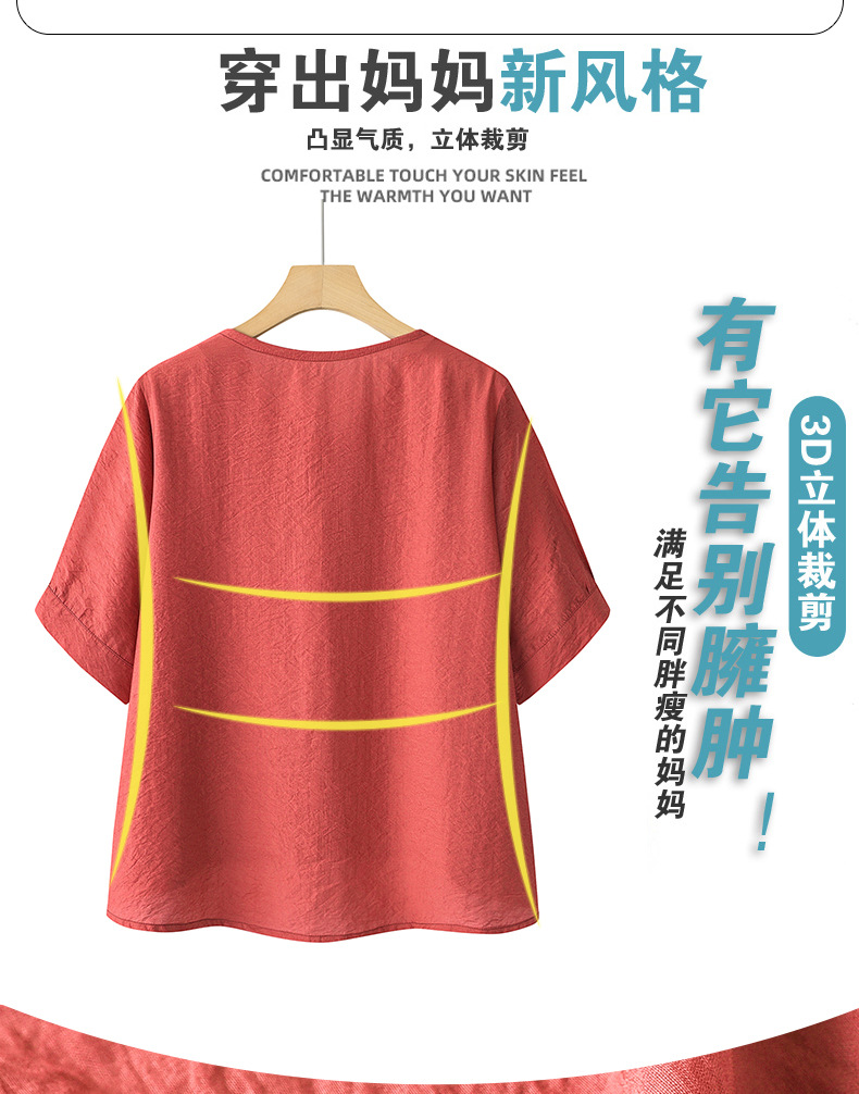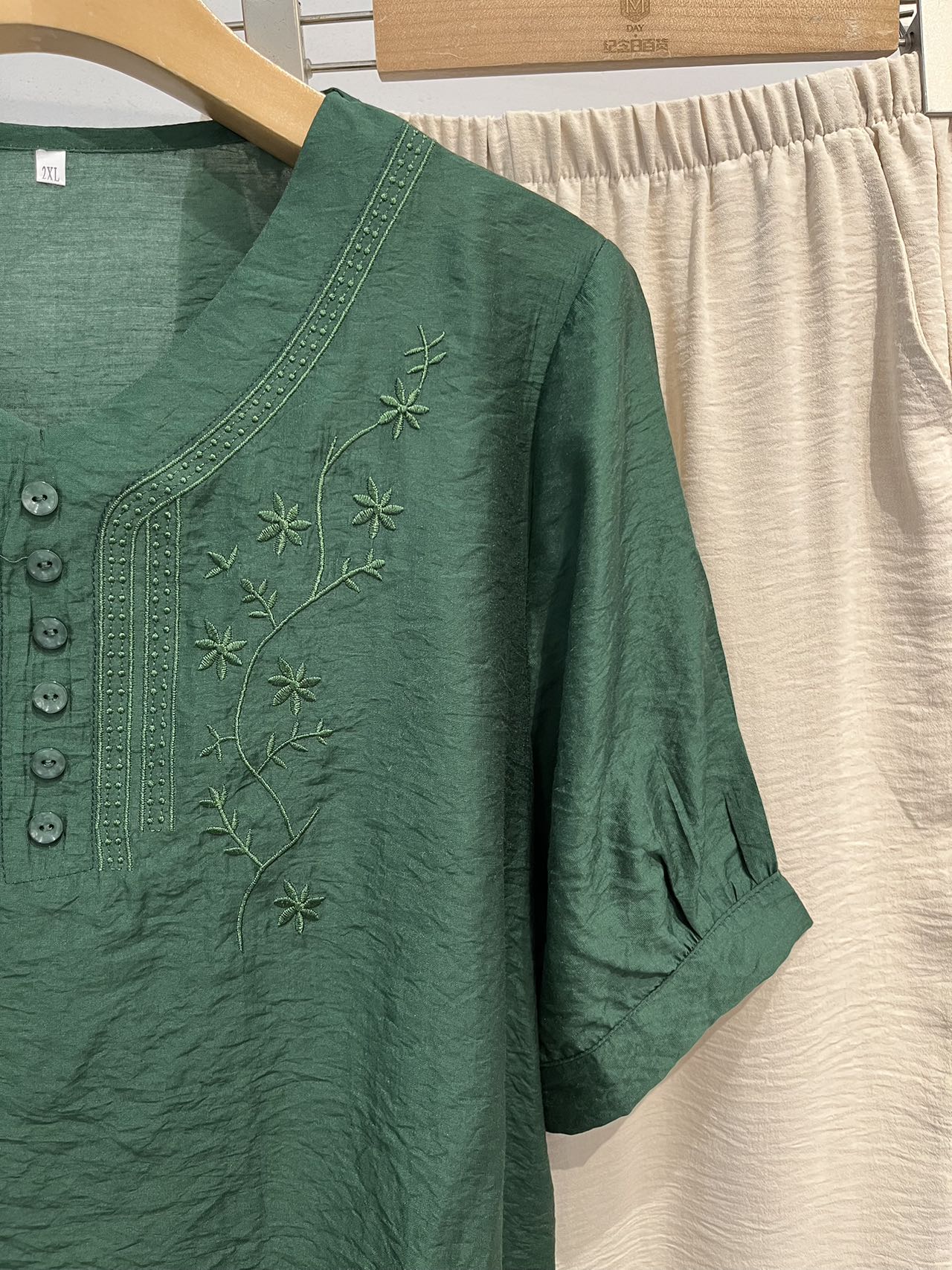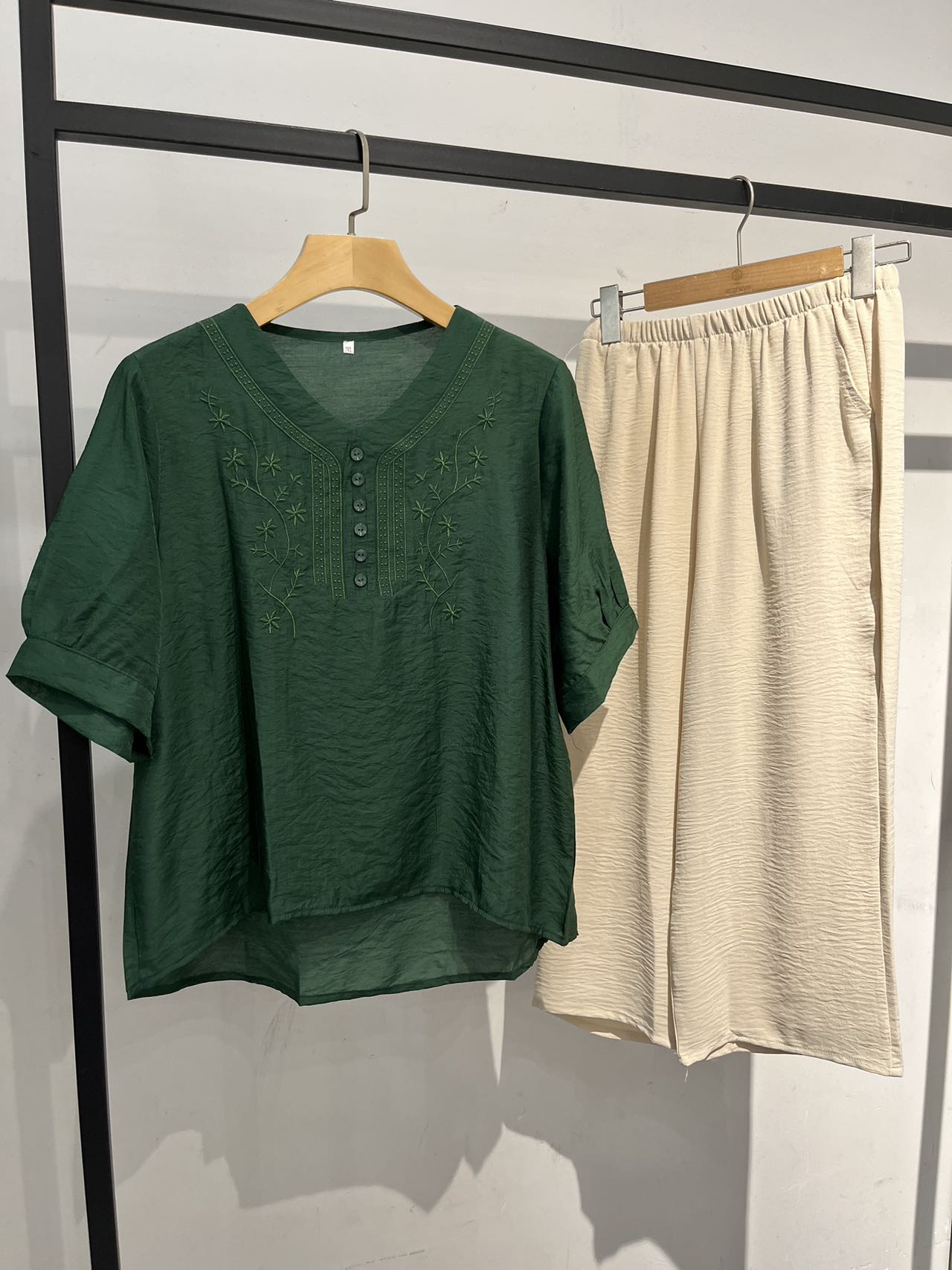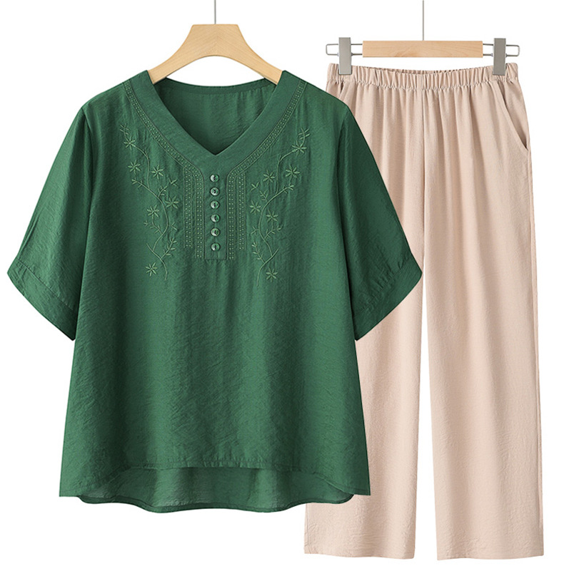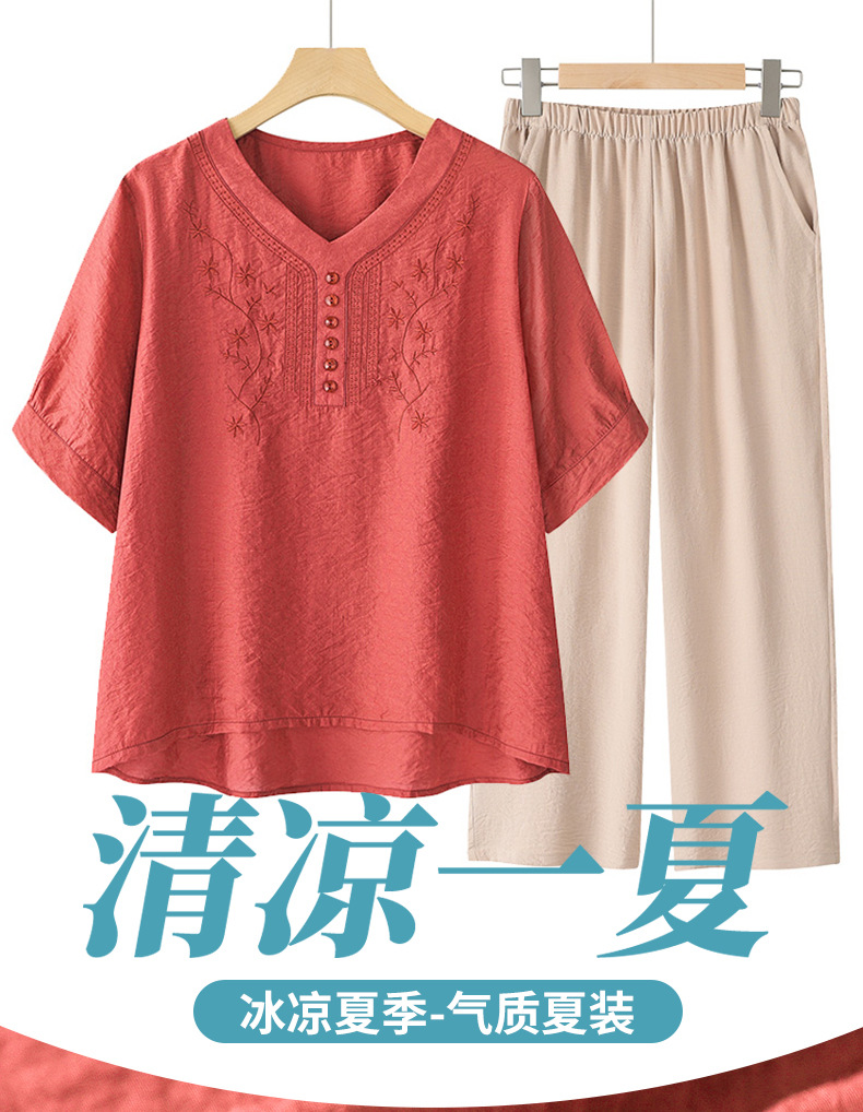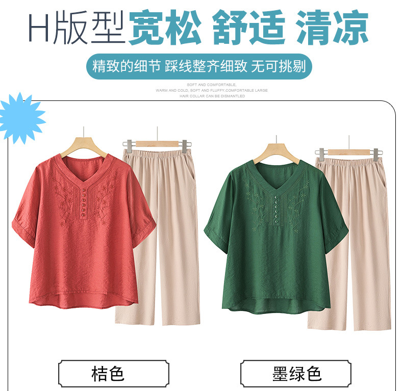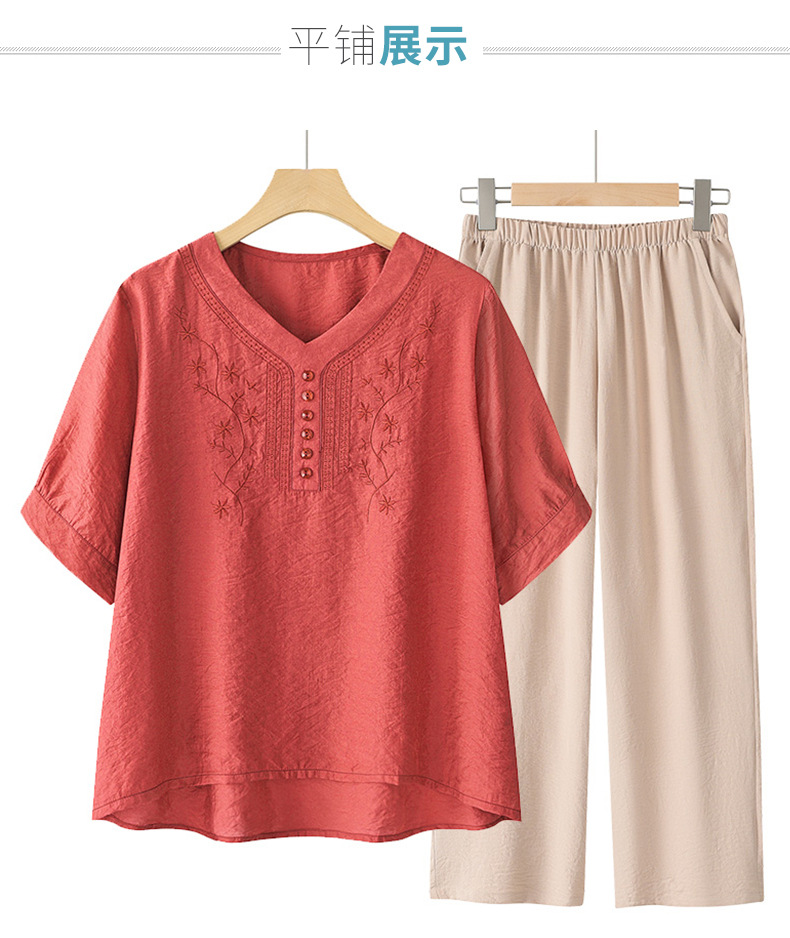 【YW】无忧购中年妈妈百搭刺绣上衣+裤子休闲舒适透气天丝麻套装623(截单后7天发货)