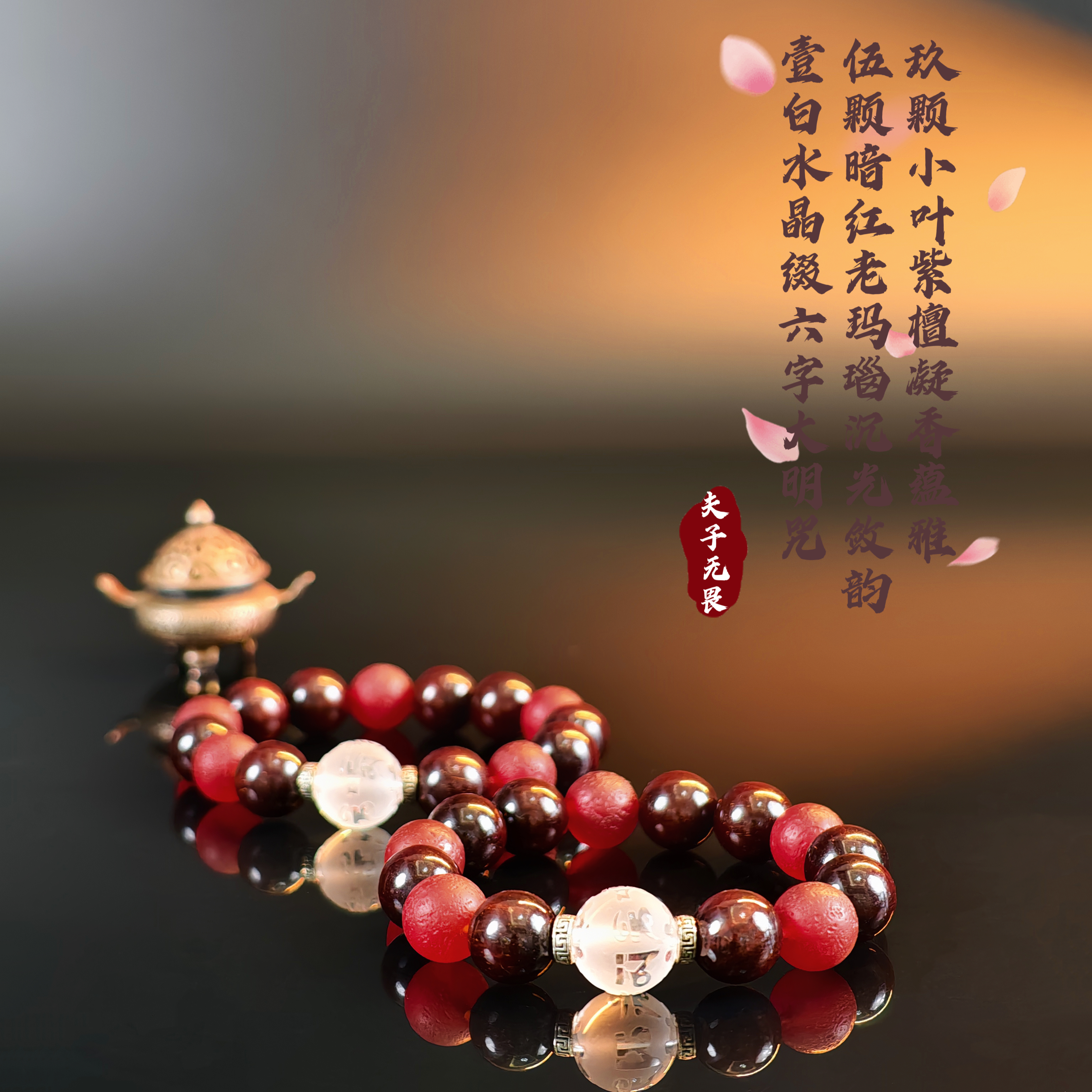 第一款:九颗小叶紫檀配五颗暗红老玛瑙+一颗白水晶主珠