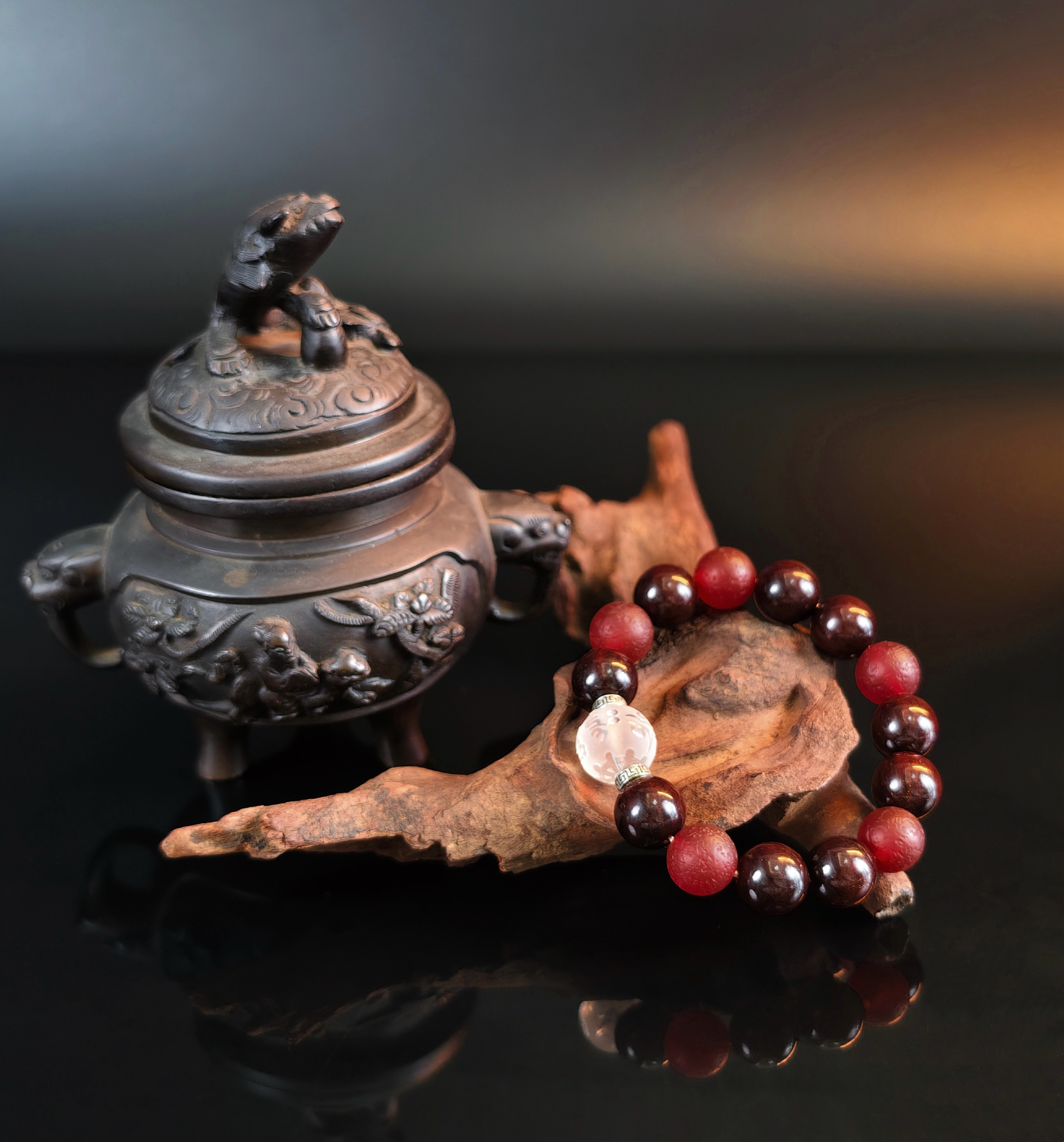 第二款:9颗降真珠配5颗战国红缠丝玛瑙+一颗白水晶主珠