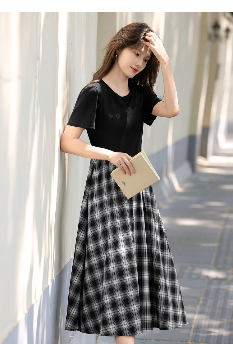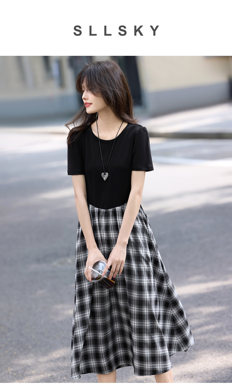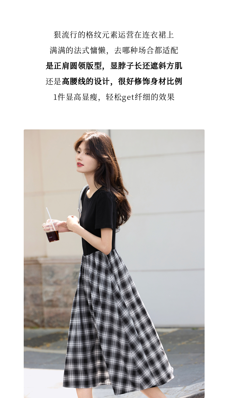 【周四狂欢价】熙世界设计感复古风黑色圆领拼接假两件格纹连衣裙女2025夏天新款