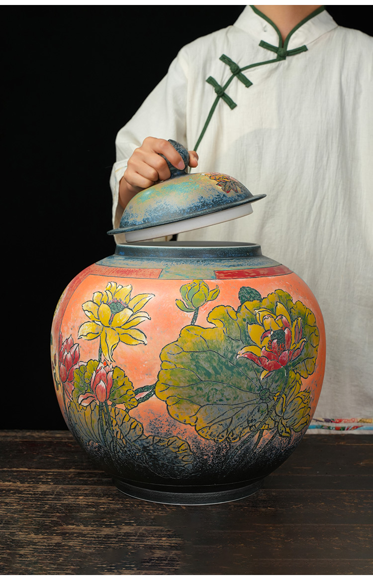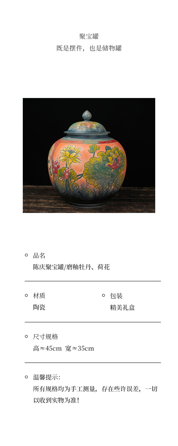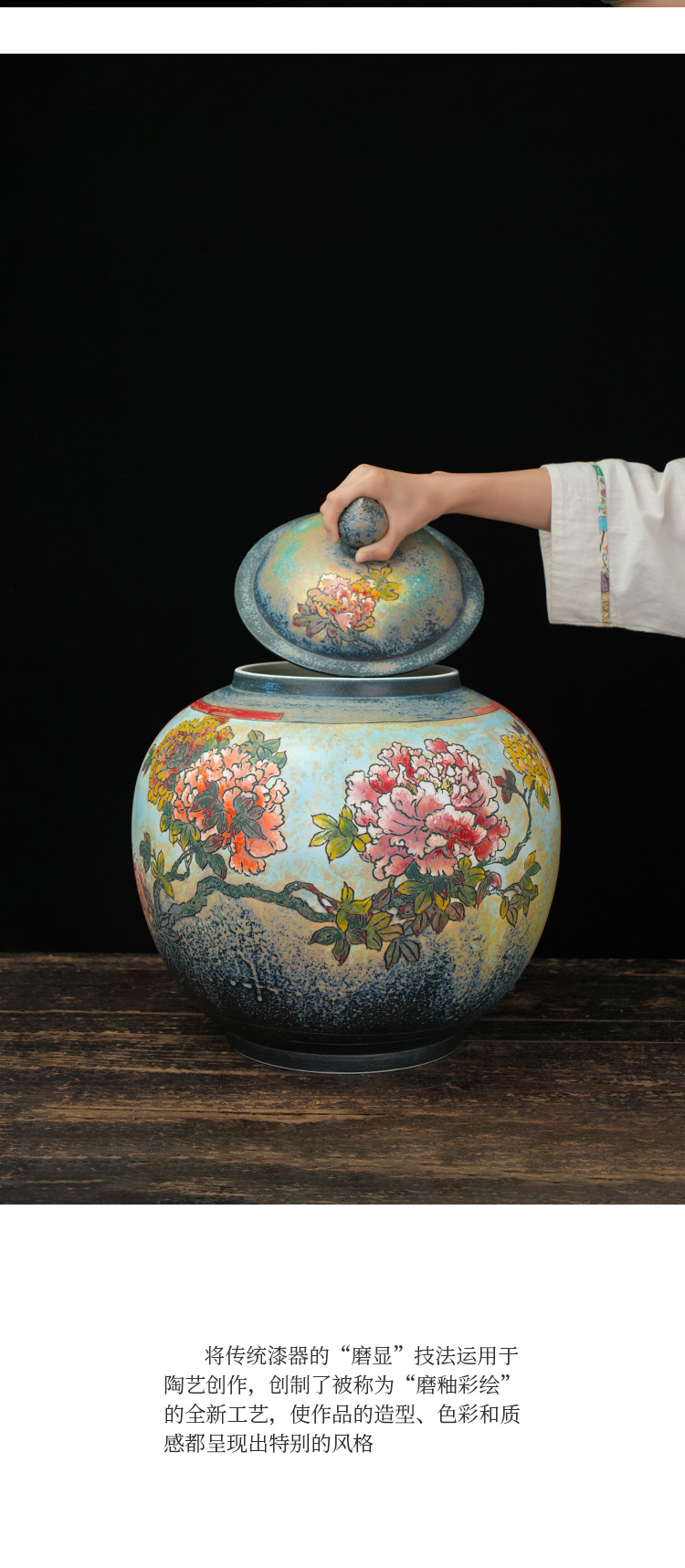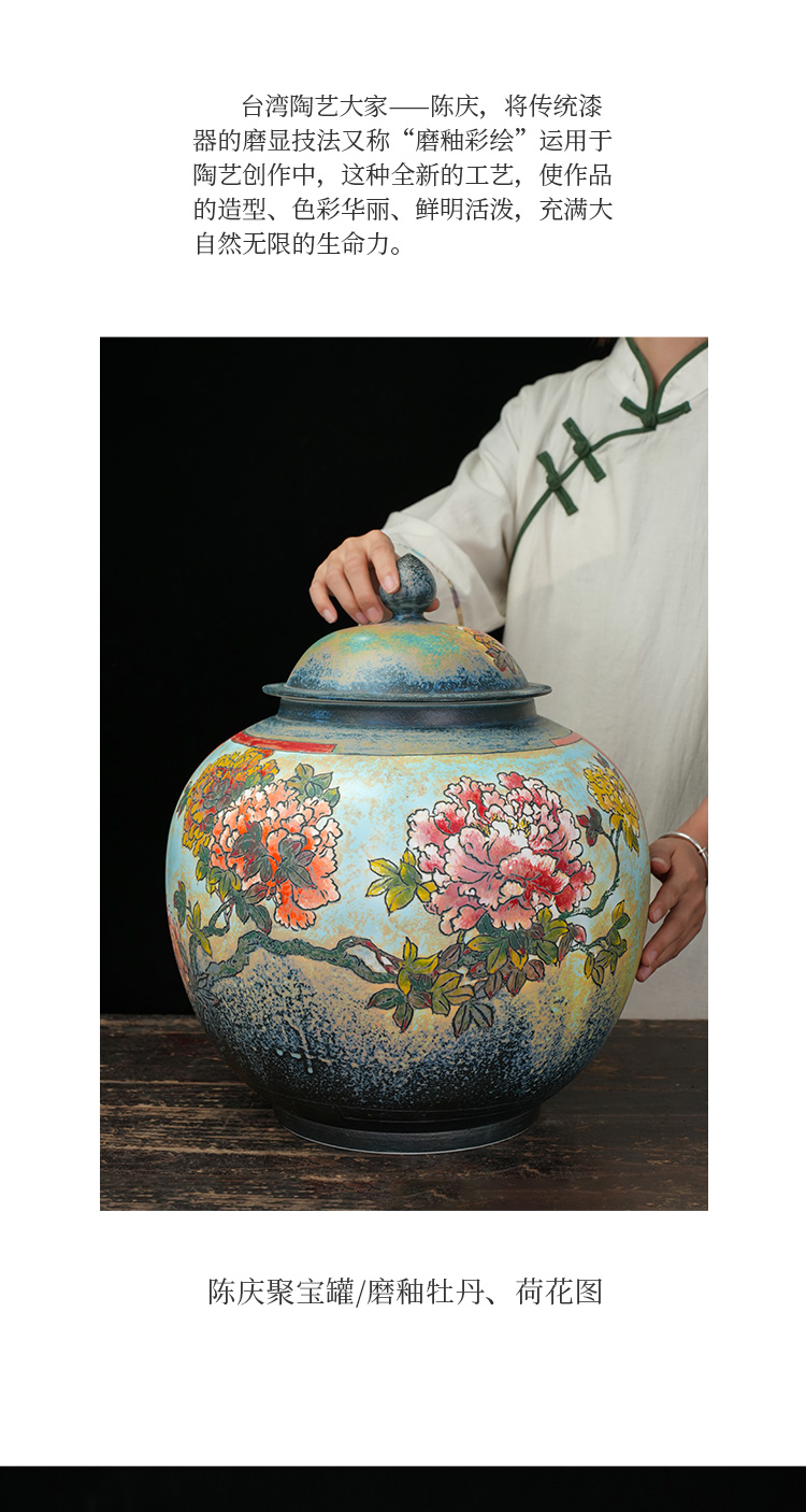 台湾陶艺大家 陈庆 聚宝罐 磨釉牡丹、荷花招财大摆件家用办公室风水罐客厅店铺大容量储存罐