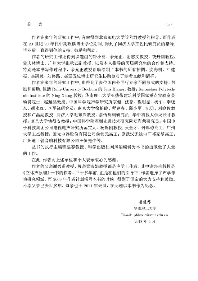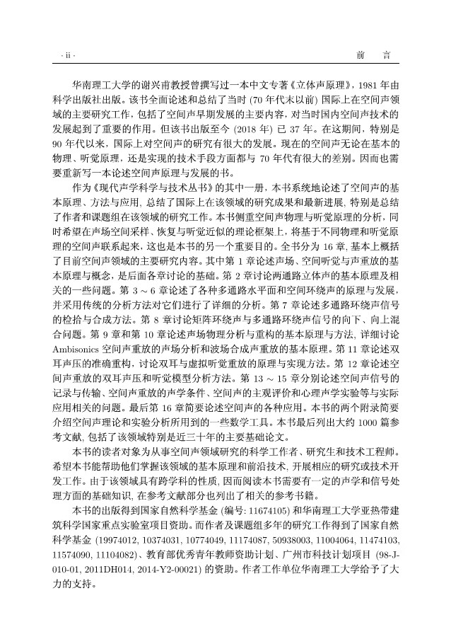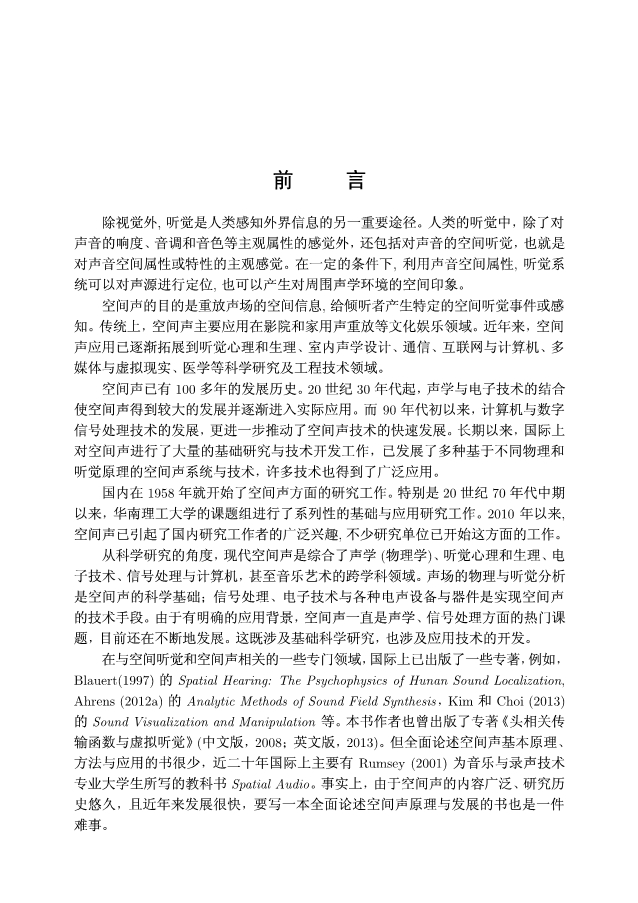 《空间声原理》系统地论述了空间声的基本原理、方法与应用,总结了国际上在该领域的研究成果和新进展,特别是总结了作者及其课题组在该领域的研究工作。《空间声原理》共16章,内容涵盖声场与空间听觉,各种空间声系统的原理与分析方法,包括两通路立体声、多通路水平面与空间环绕声、Ambisonics与波场合成、双耳与虚拟听觉重放、空间声信号的检拾与合成、记录与传输、空间声客观分析与主观评价、空间声的应用等。《空间声原理》最后列出大约1000篇参考文献,包括了该领域的主要基础论文。