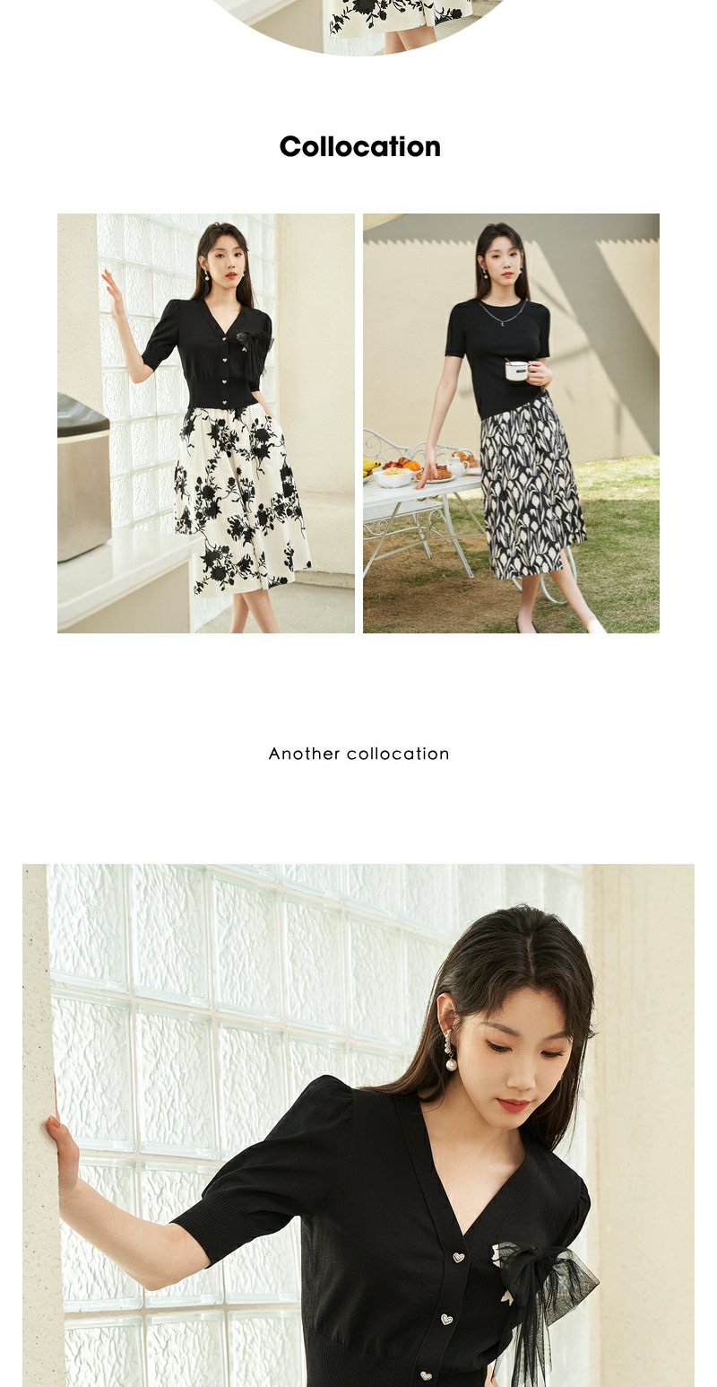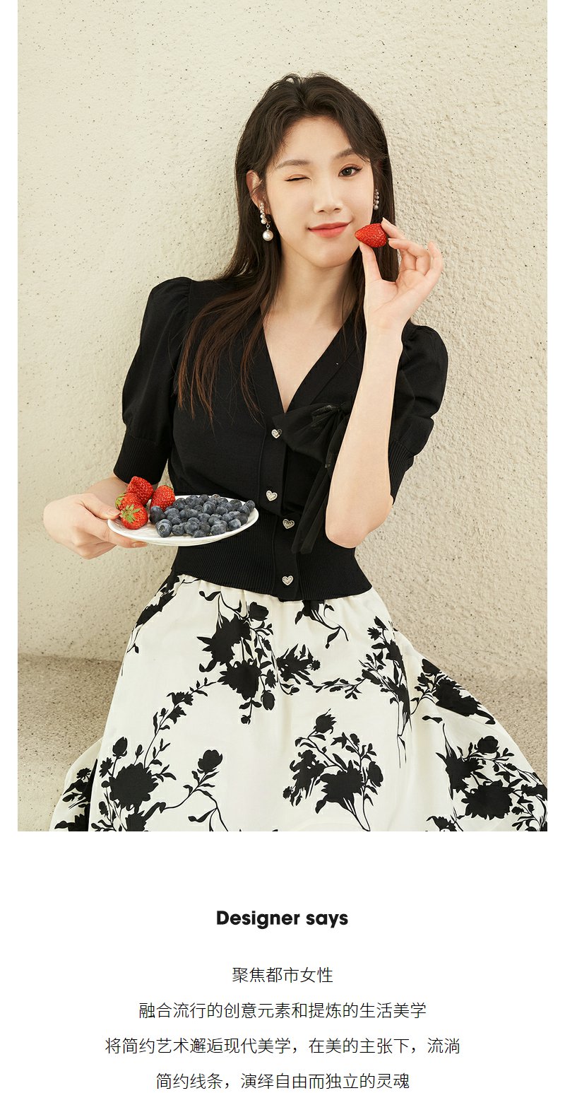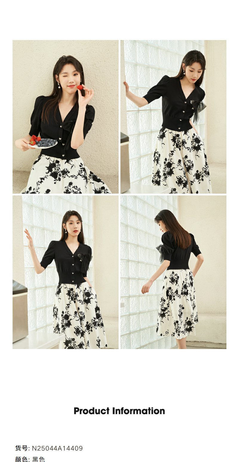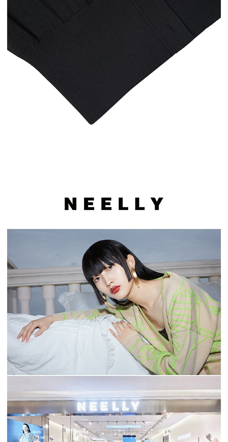 NEELLY纳俪商场同款夏季新款V领显瘦短袖针织衫女黑色修身上衣N25044A14409