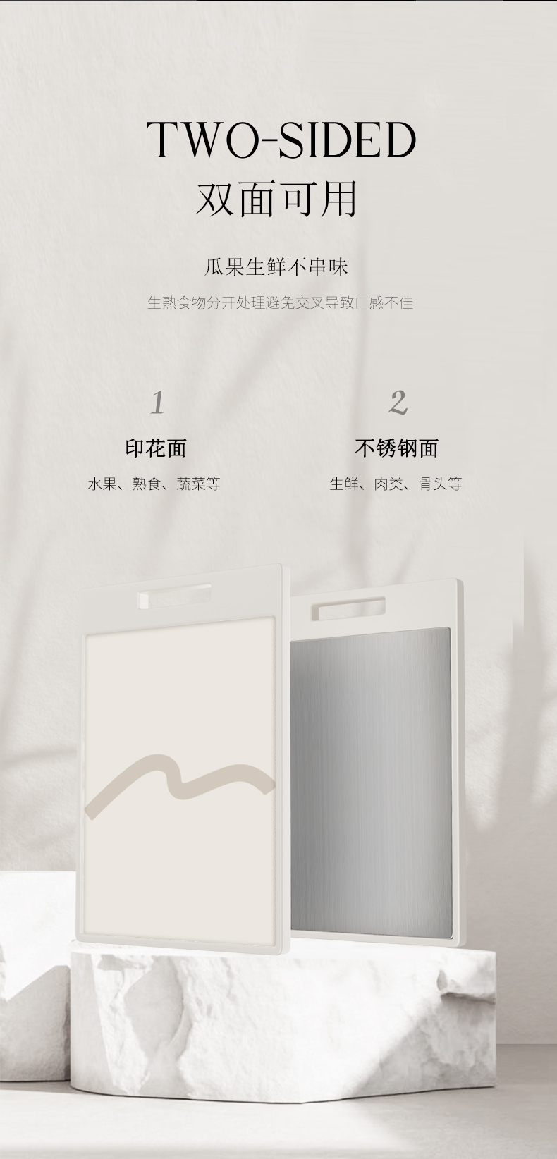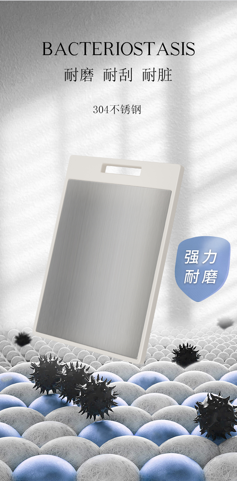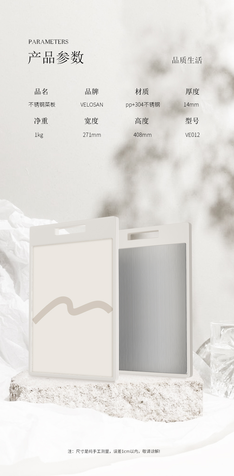 耐刮、耐脏、不发霉【双面 不锈钢实心菜板】PP+304不锈钢材质,厚度14mm,宽度271mm,高度408mm,重量1kg