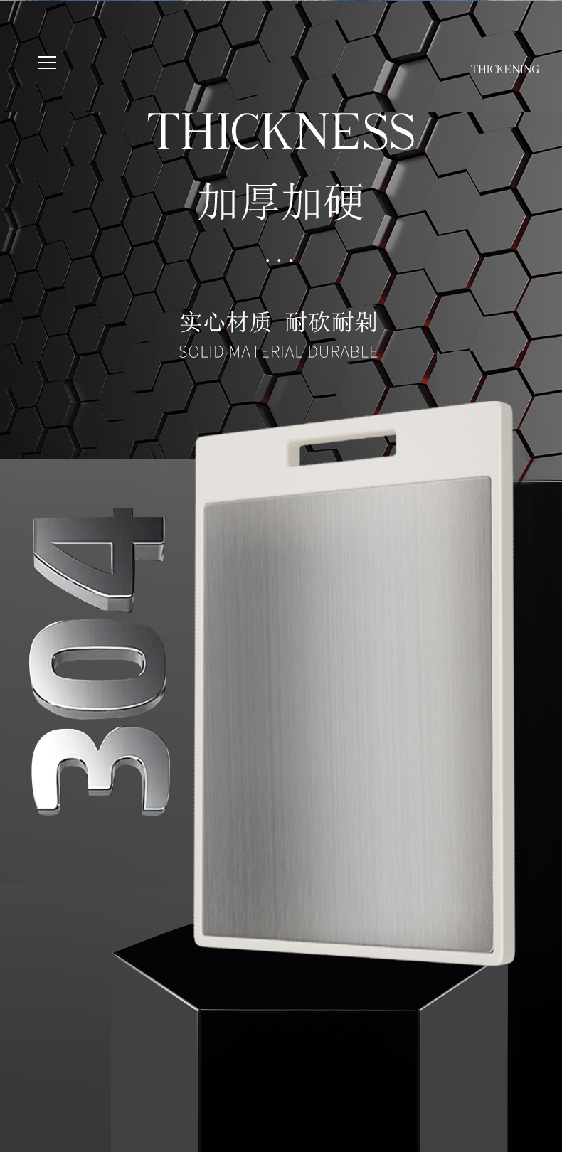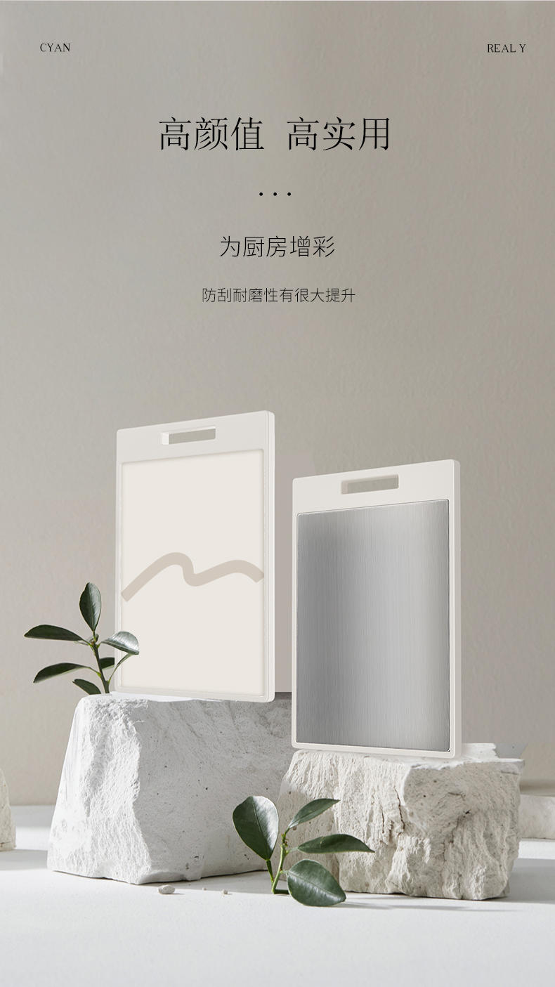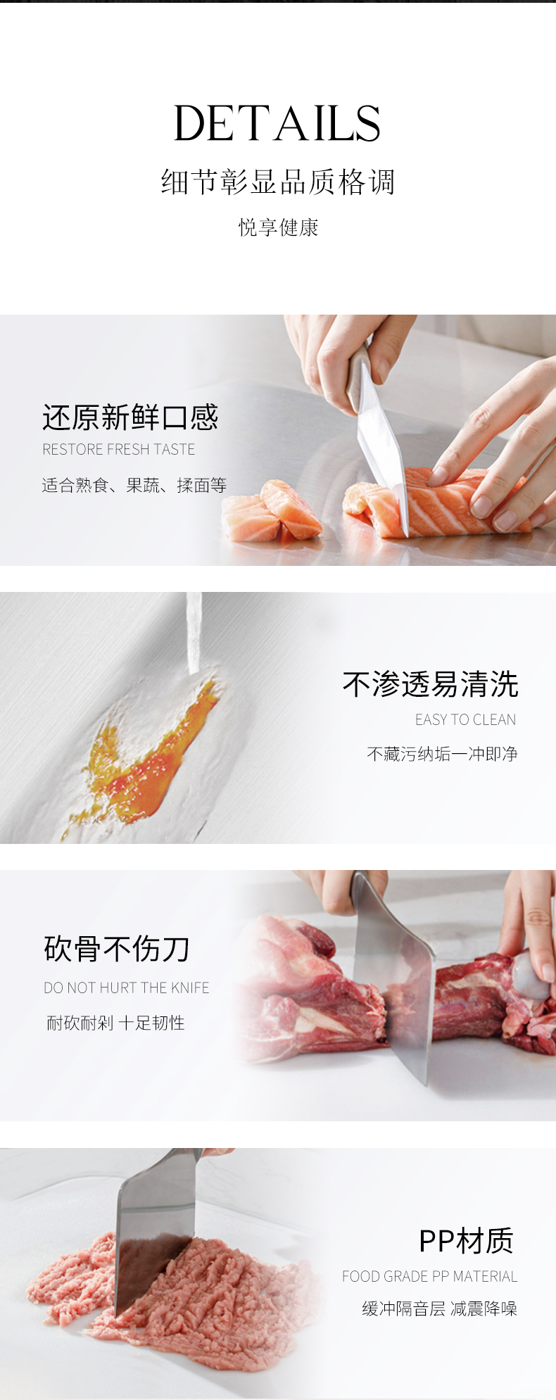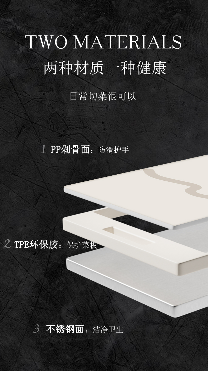 耐刮、耐脏、不发霉【双面 不锈钢实心菜板】PP+304不锈钢材质,厚度14mm,宽度271mm,高度408mm,重量1kg