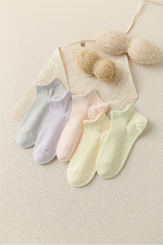 女款 选色清新温雅 苎麻船袜!真的相见恨晚,穿上就不想脱下来~ 爱美的姐妹肯定懂,夏天穿小皮鞋、运动鞋,普通袜子总是又闷又热,还容易磨脚。这款苎麻船袜完美解决这些问题! 它的透气性超绝,穿上就像给脚敷了一层冰膜,时刻保持清爽。而且苎麻天然抗菌,能有效抑制细菌滋生,再也不用担心脱鞋尴尬啦!