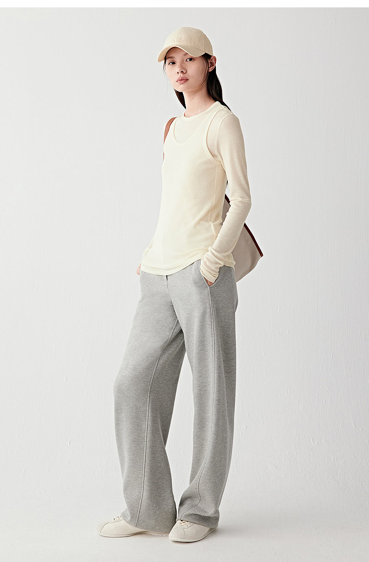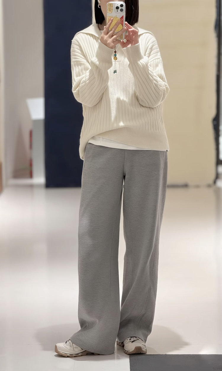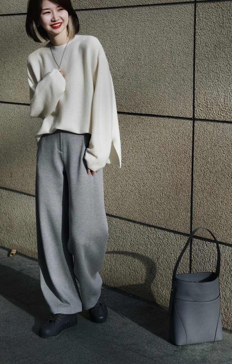 针织衫自带慵懒暖意,搭配垂坠感十足的浅灰阔腿裤,整体色调柔和干净,既保留了通勤的利落感,又充满日常休闲的松弛氛围,舒适又时髦。