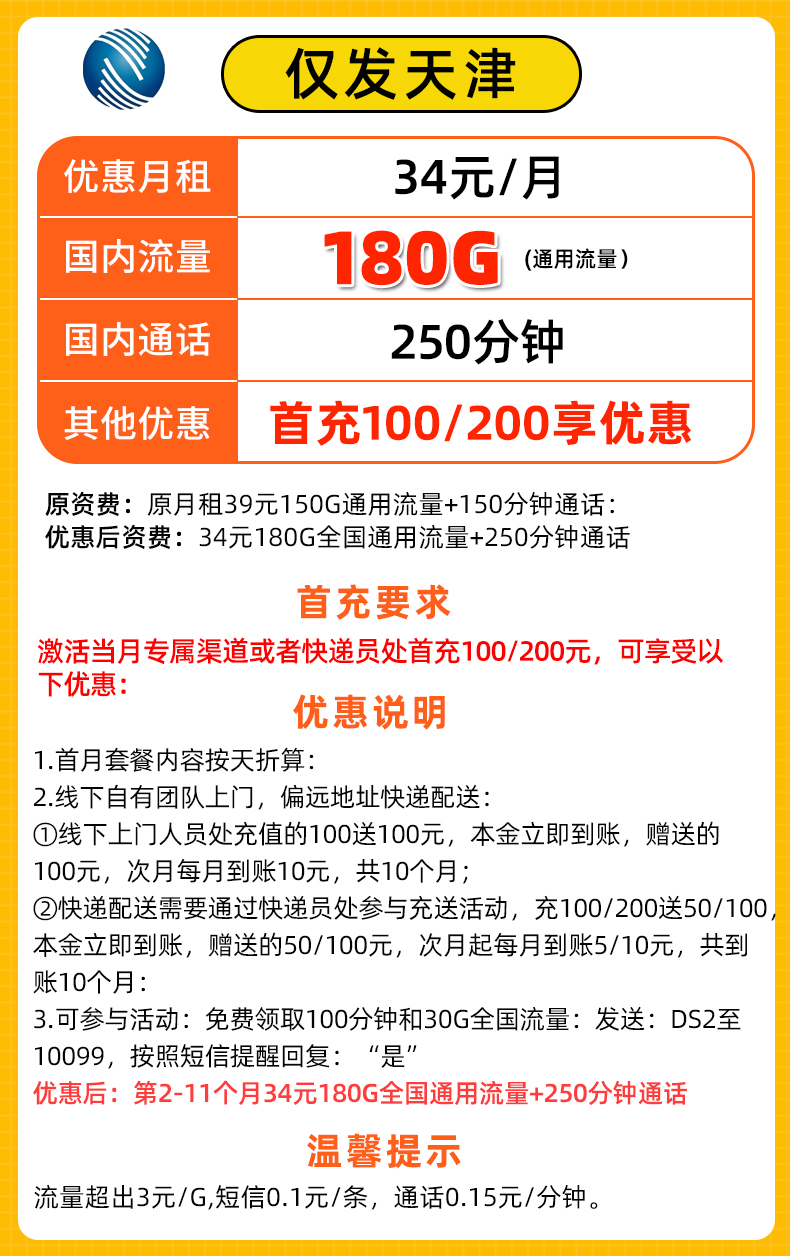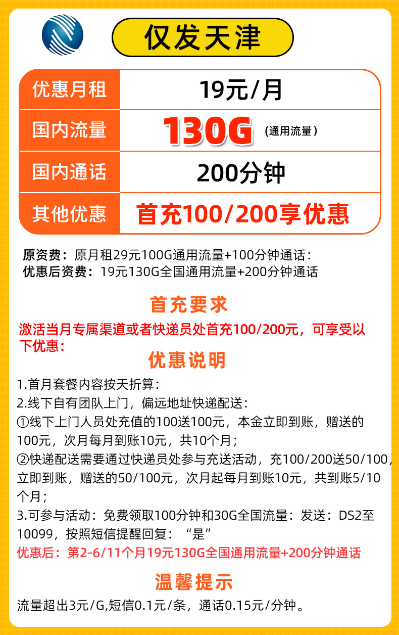 【仅发天津】广电19元130G全国通用流量+200分钟、 34元180G全国通用流量+250分钟