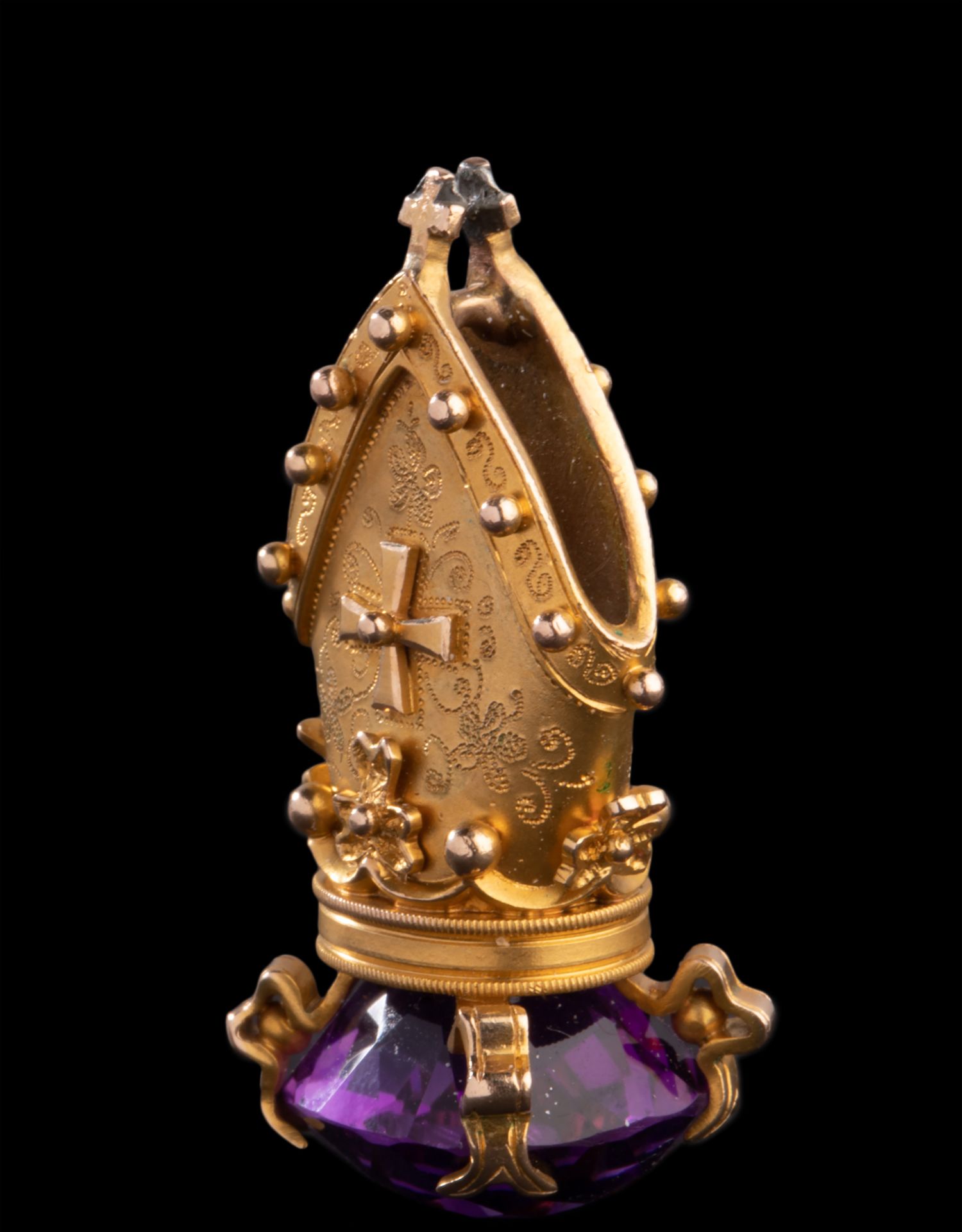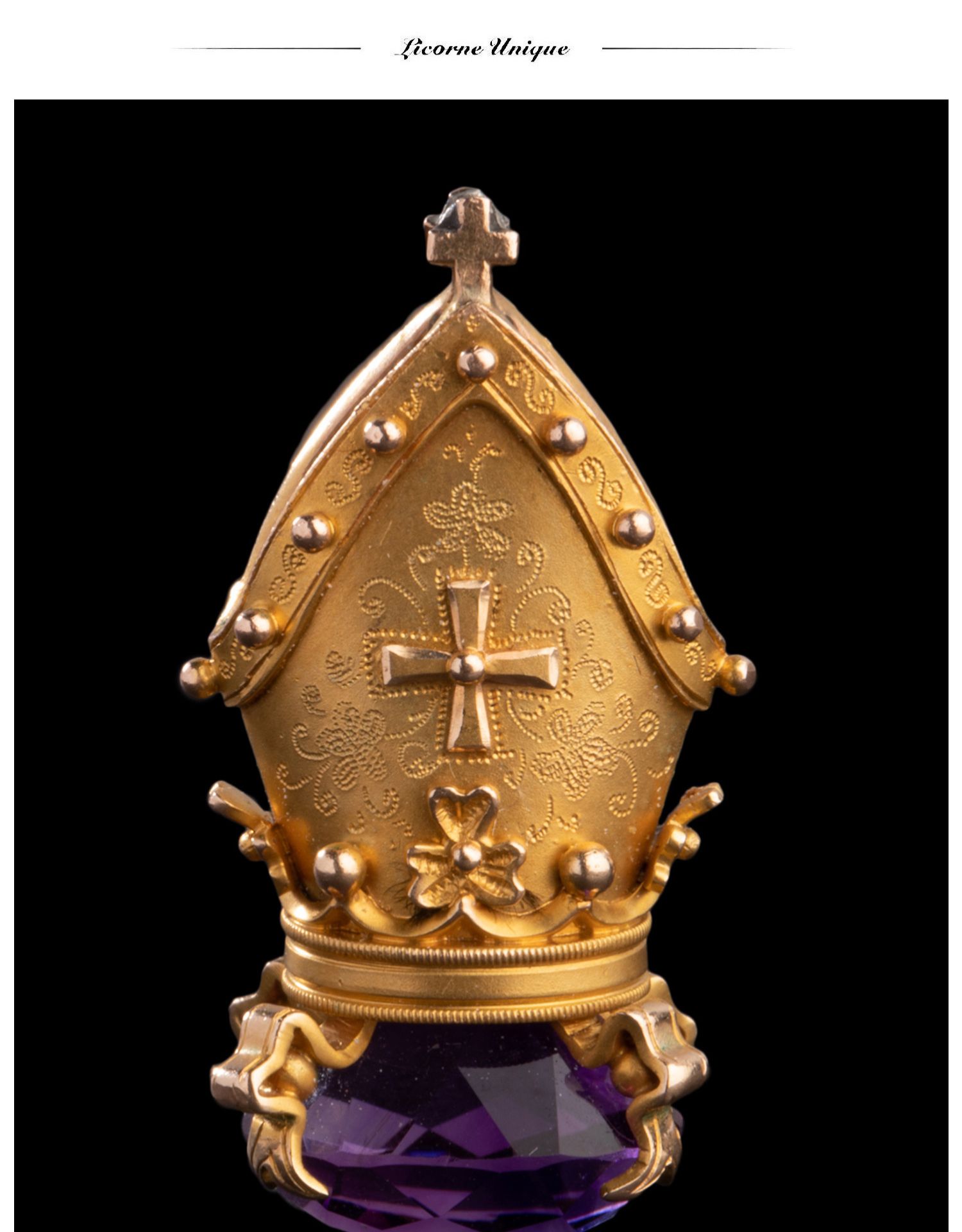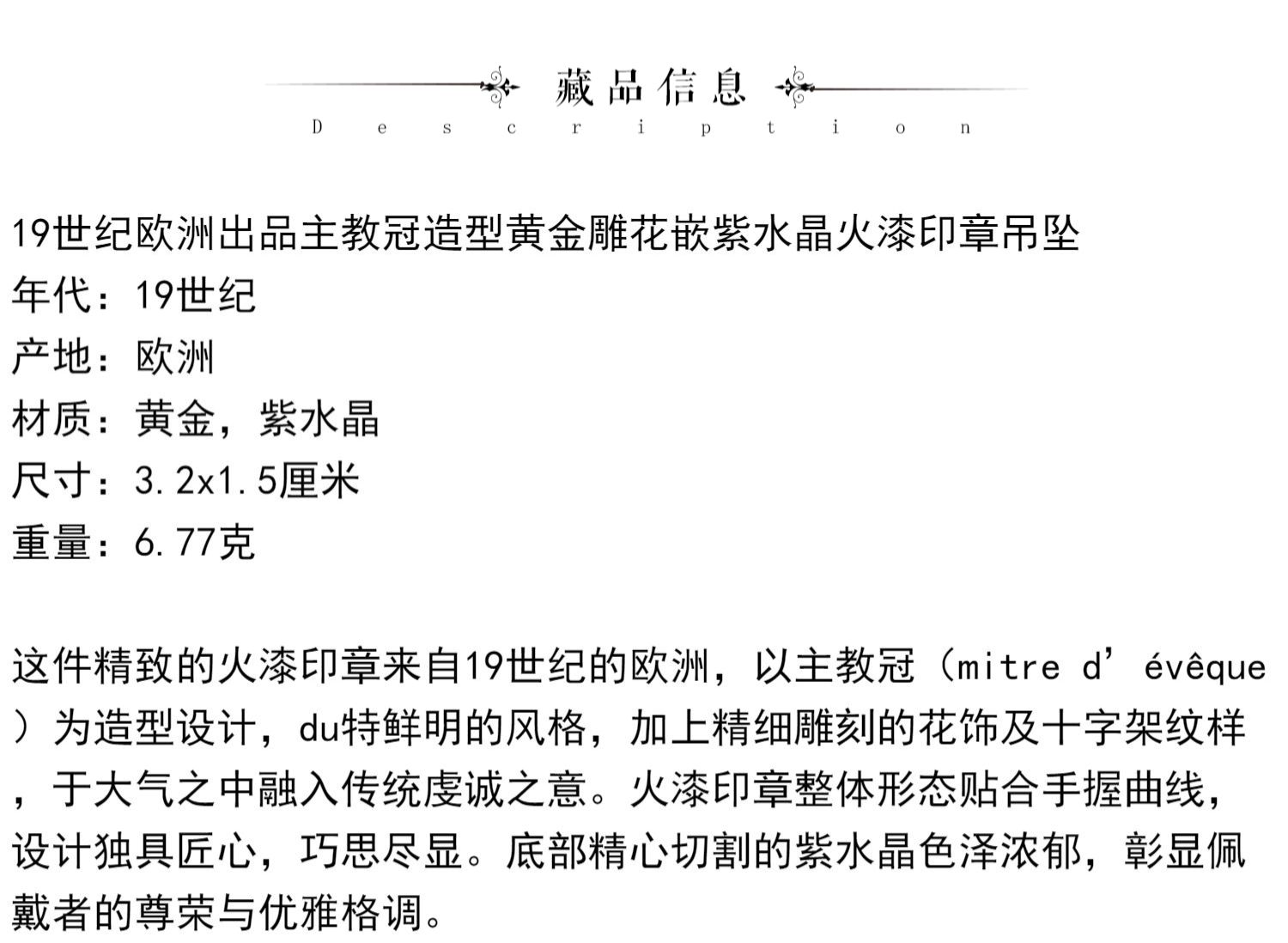 独角鹿西洋古董欧洲主教冠造型黄金雕花嵌紫水晶火漆印章吊坠