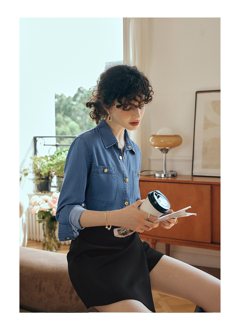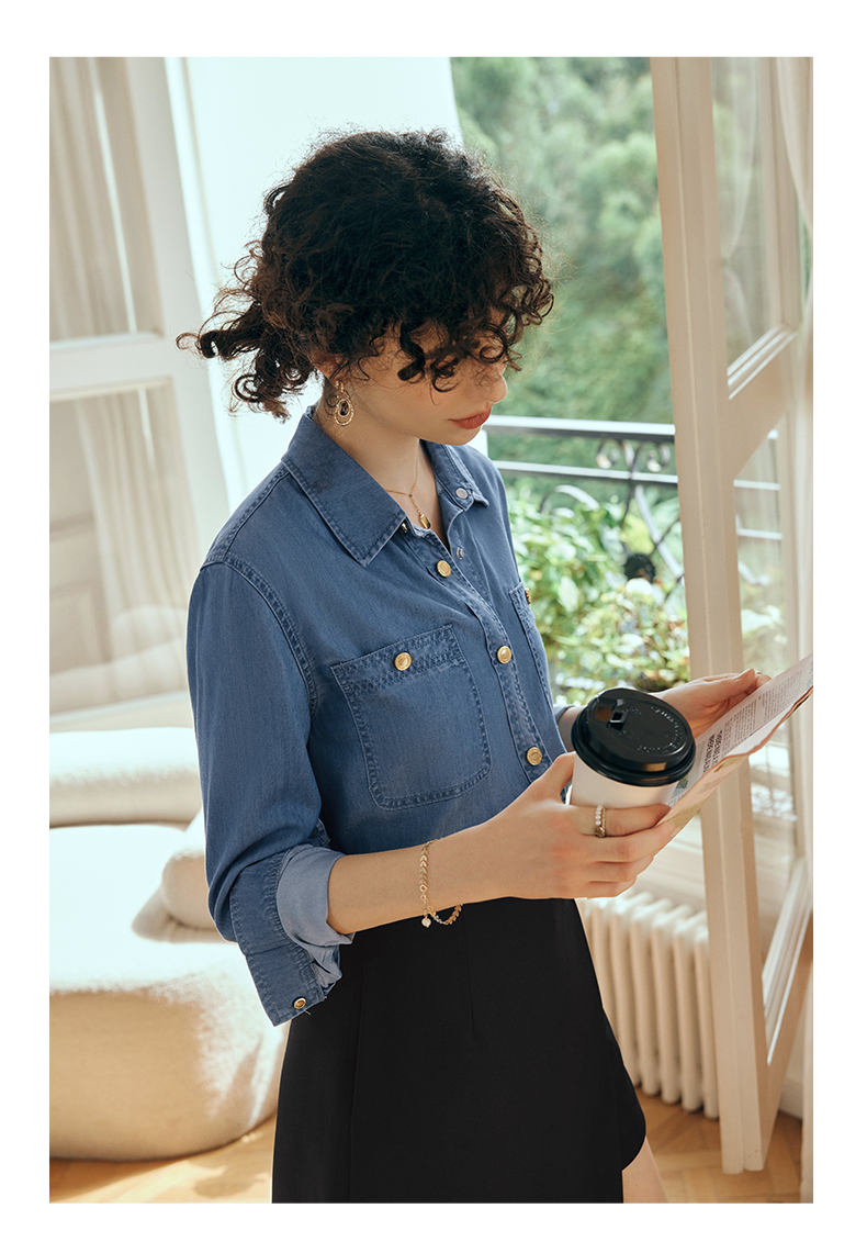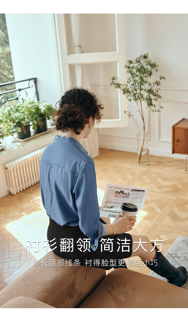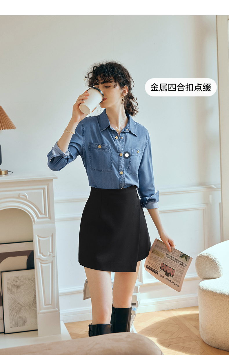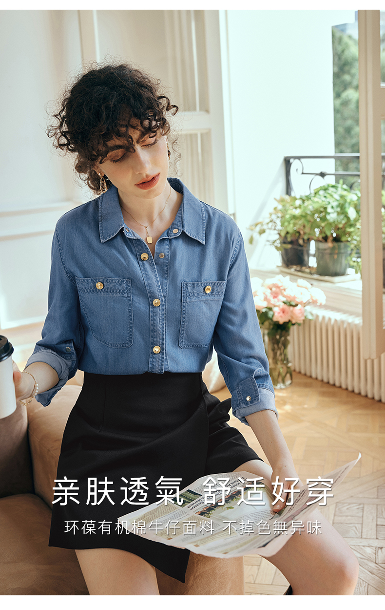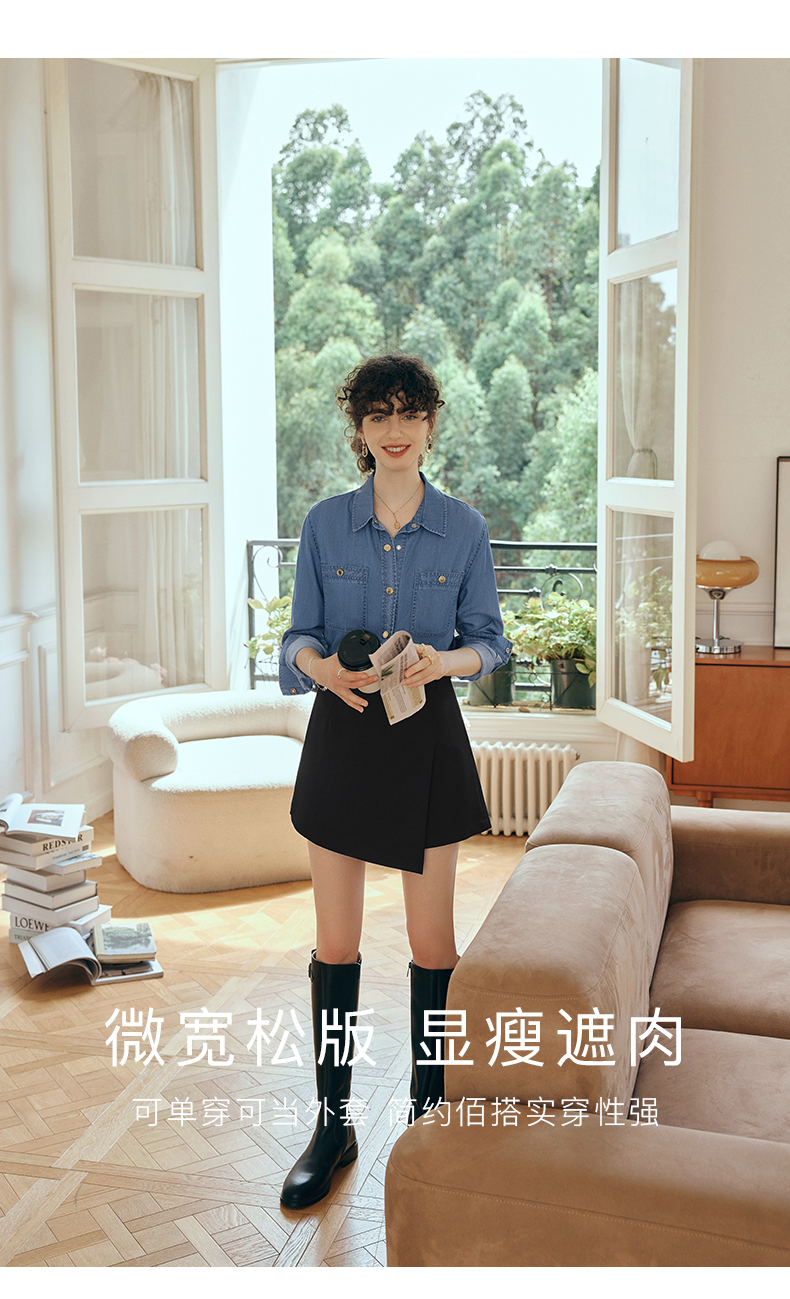 OLrain欧芮儿长袖牛仔衬衫女初秋2023年新款宽松时尚口袋休闲衬衣