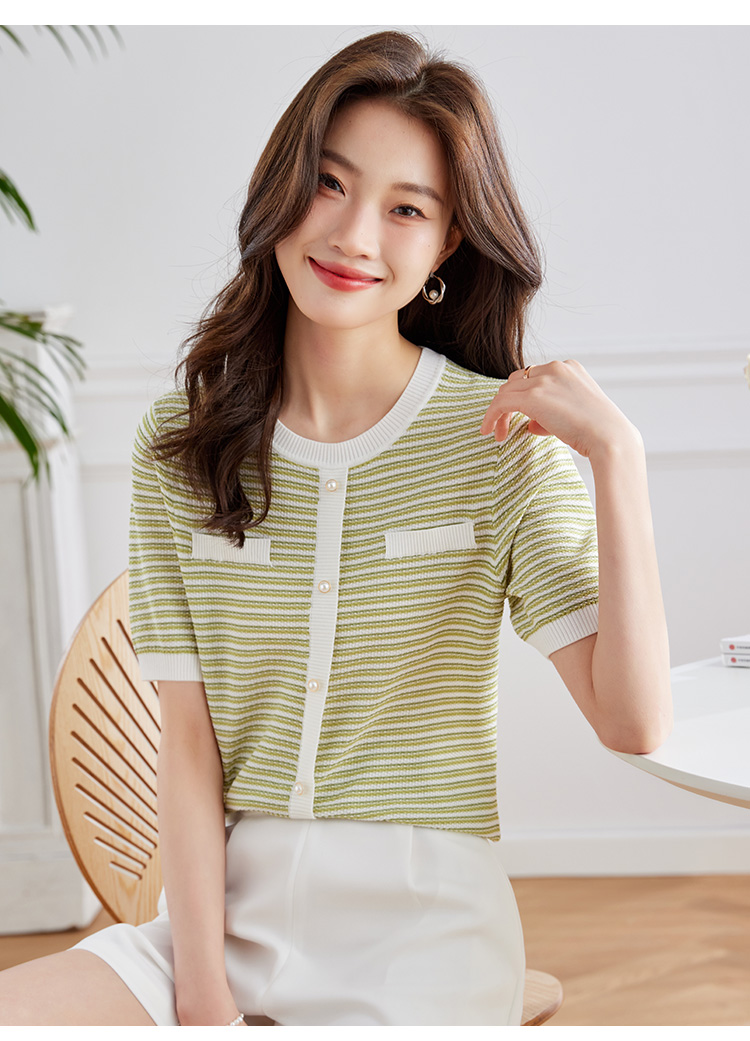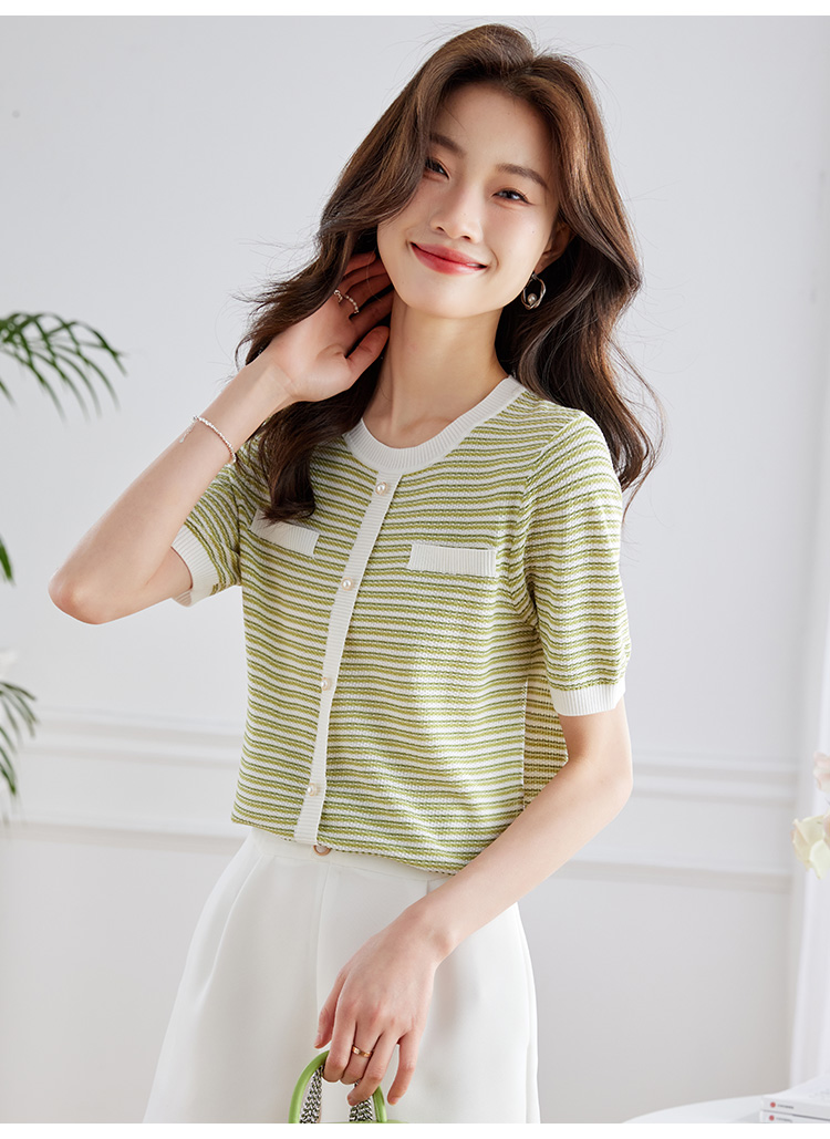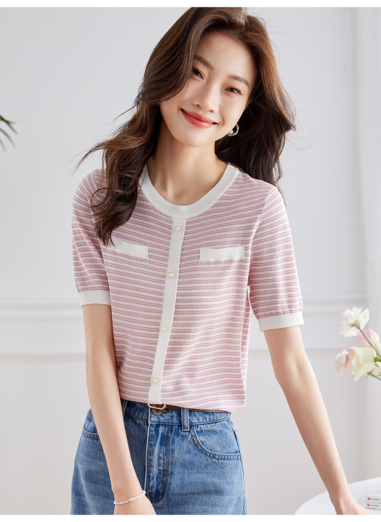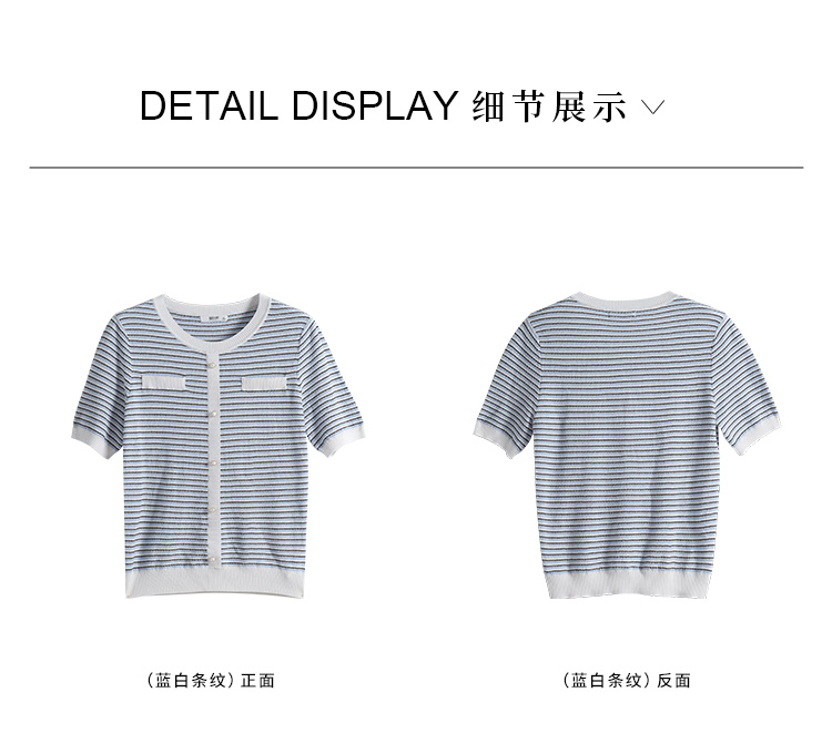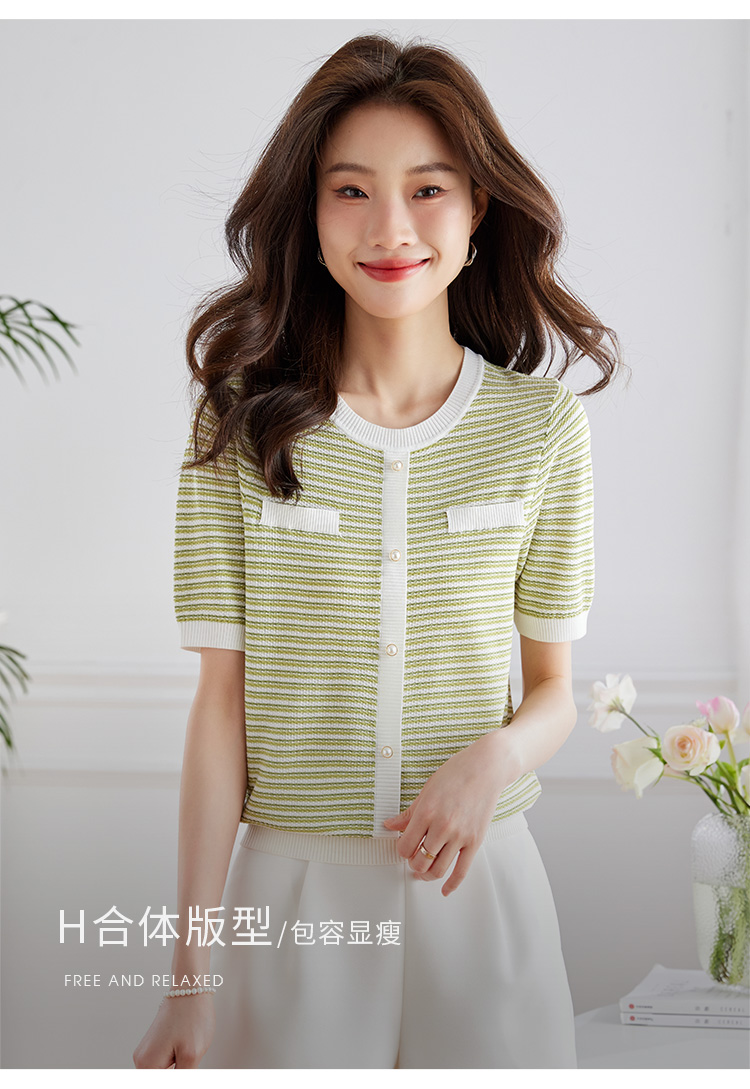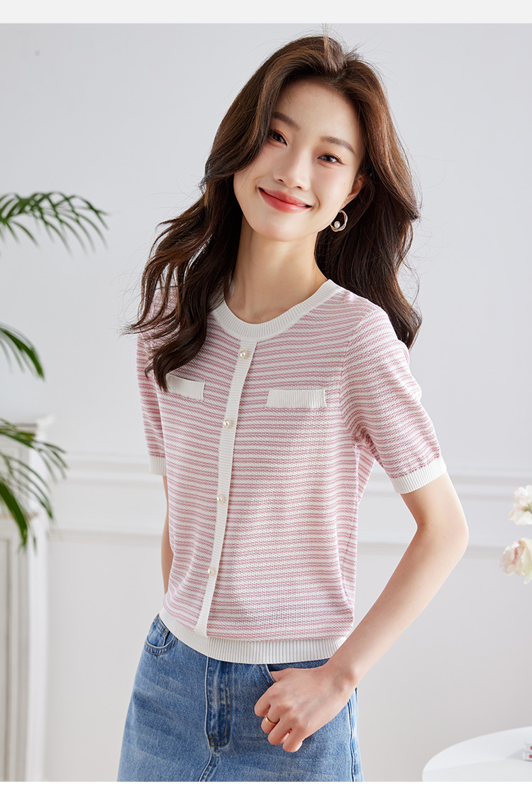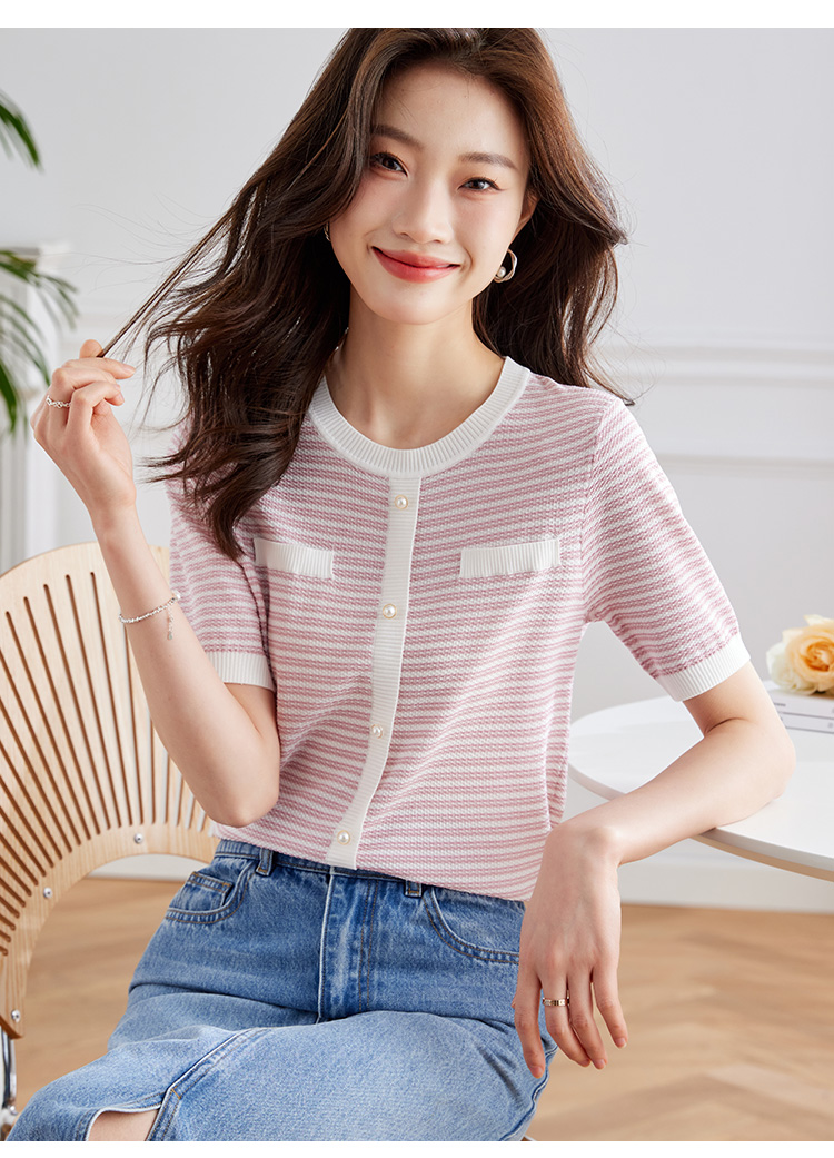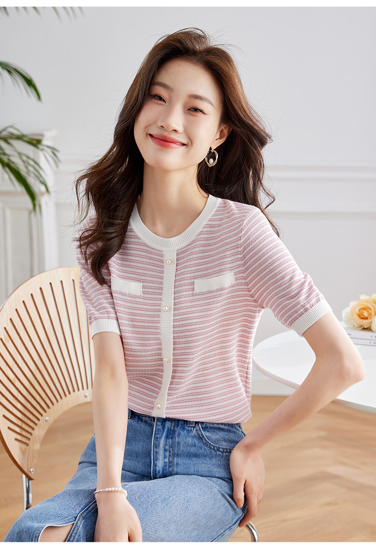 【专属特价】熙世界2025夏装新款小香风条纹针织衫薄款短袖宽松显瘦冰丝上衣