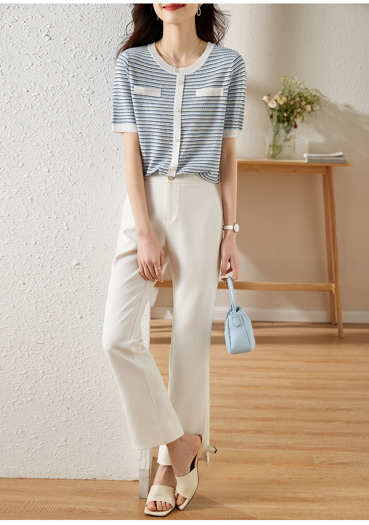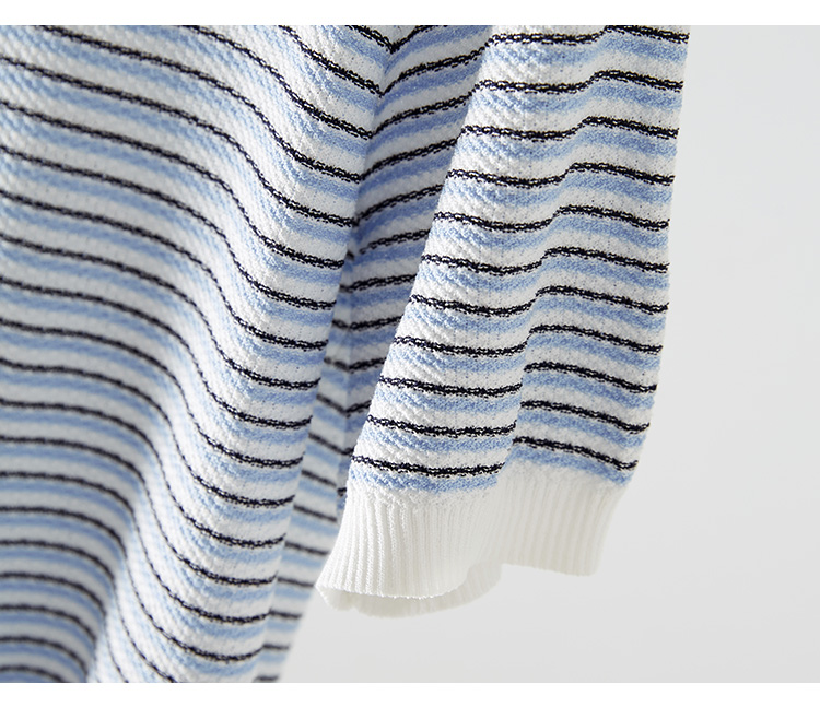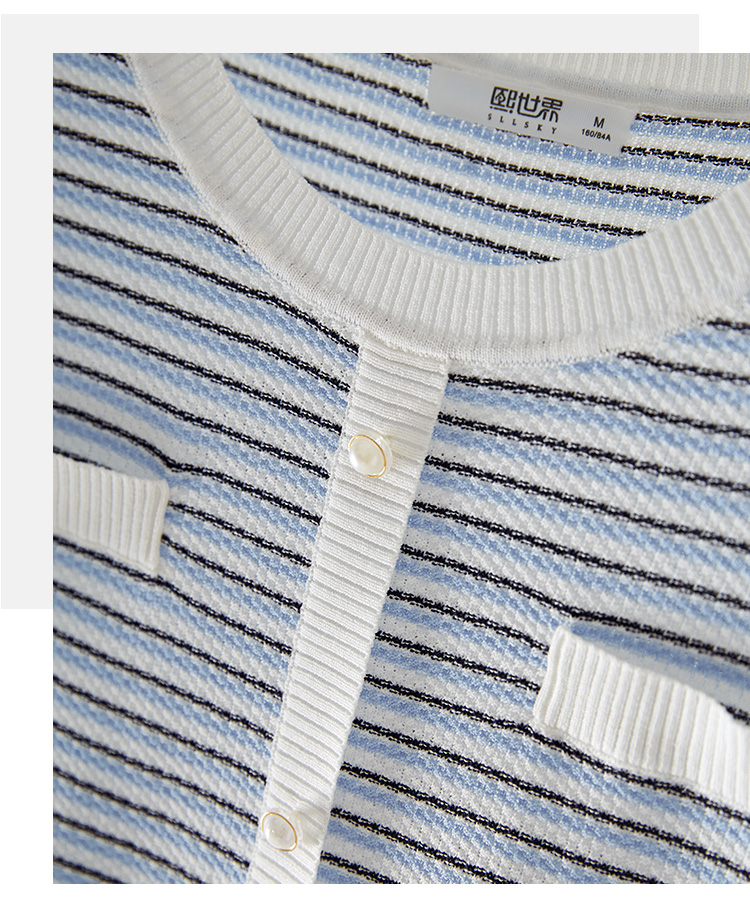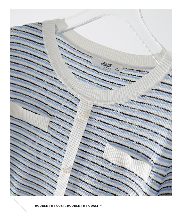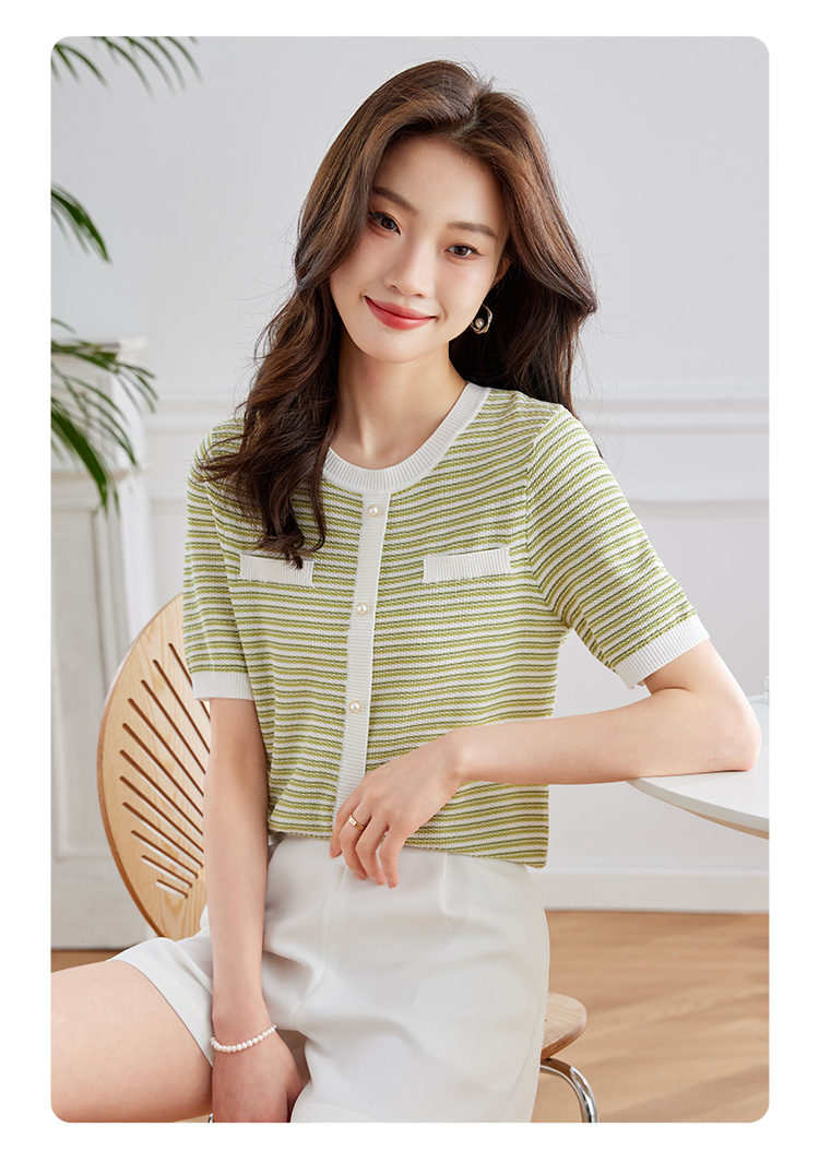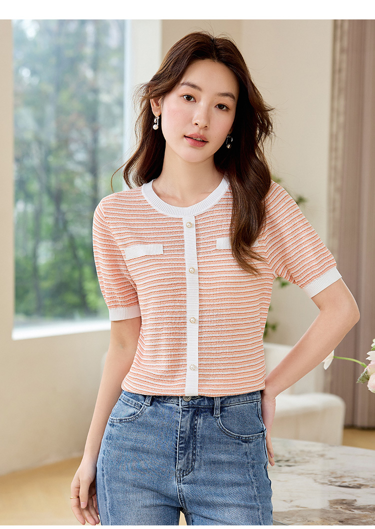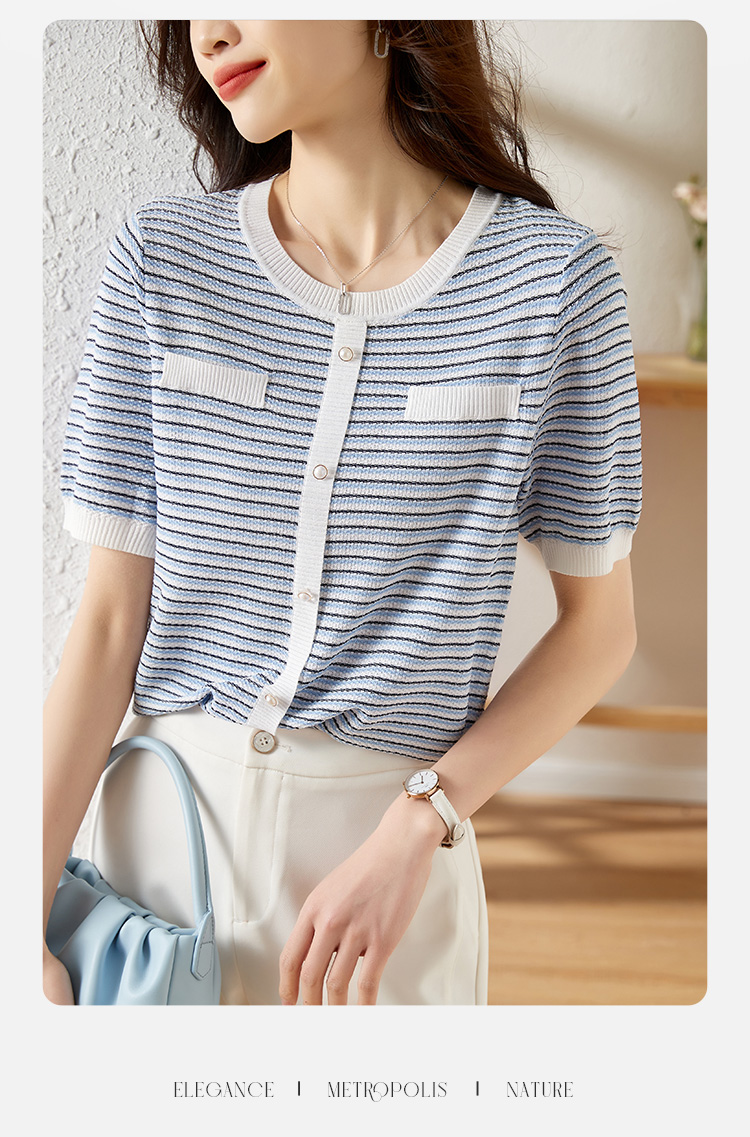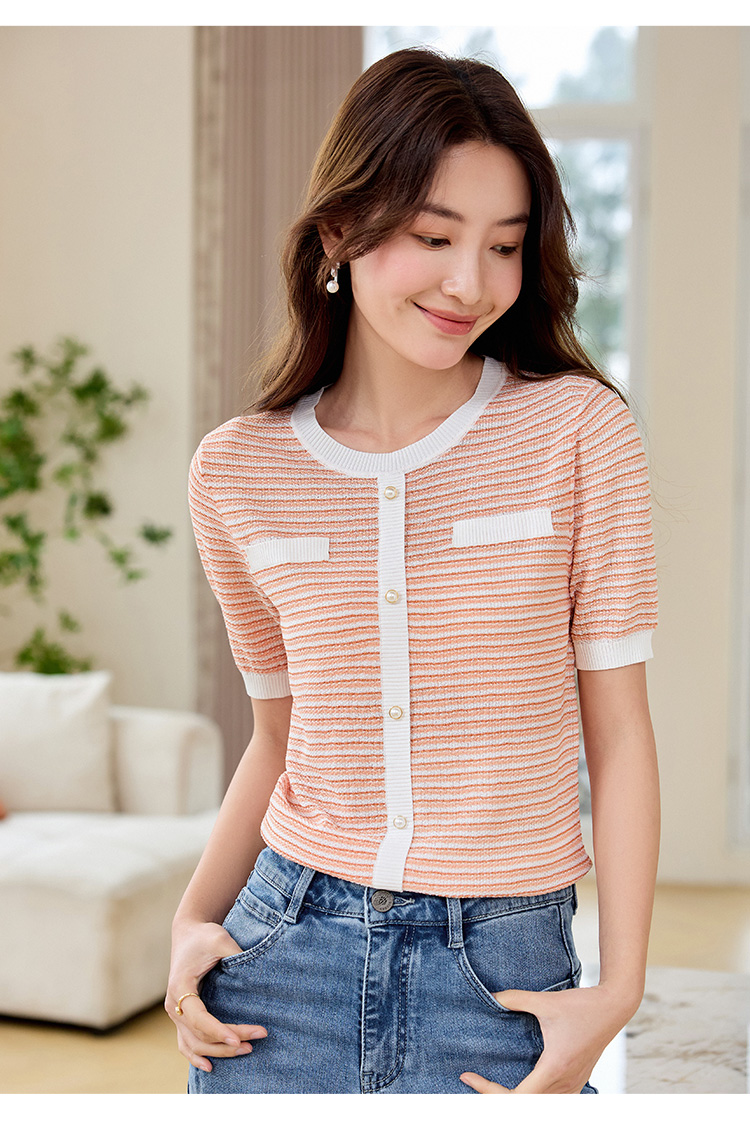 【专属特价】熙世界2025夏装新款小香风条纹针织衫薄款短袖宽松显瘦冰丝上衣