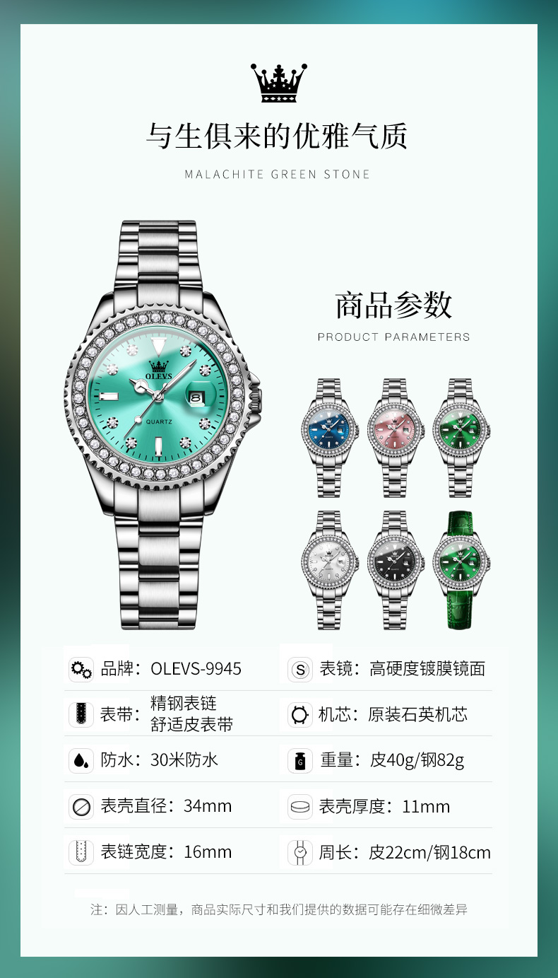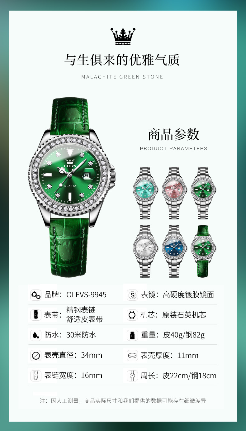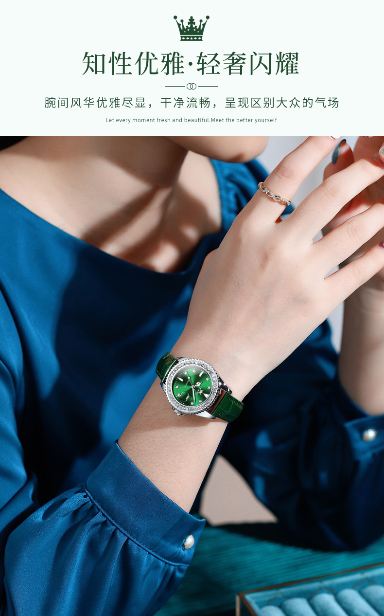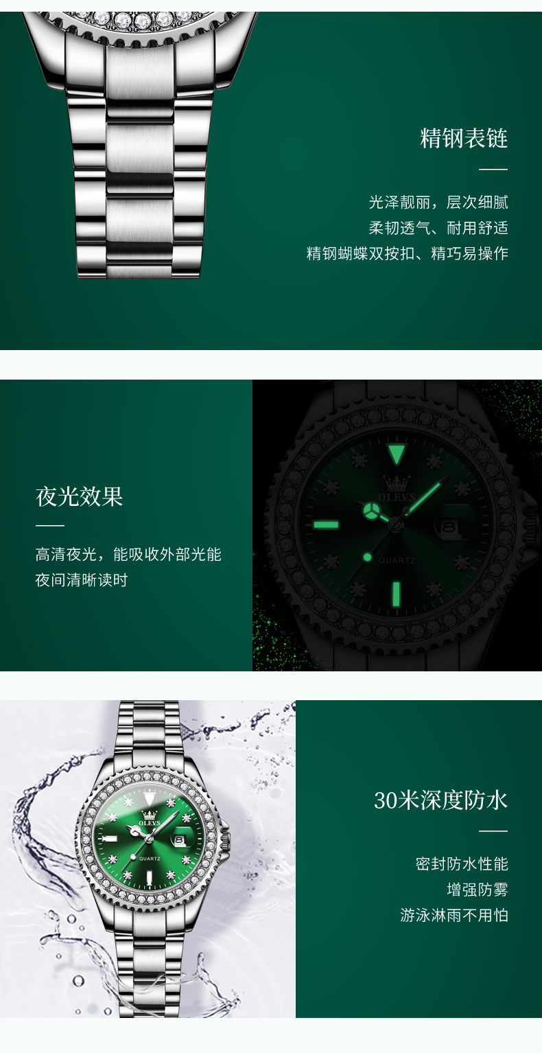 欧利时OLEVS 石英表 9945绿水鬼系列 瑞士认证品牌 女士手表瑞士认证