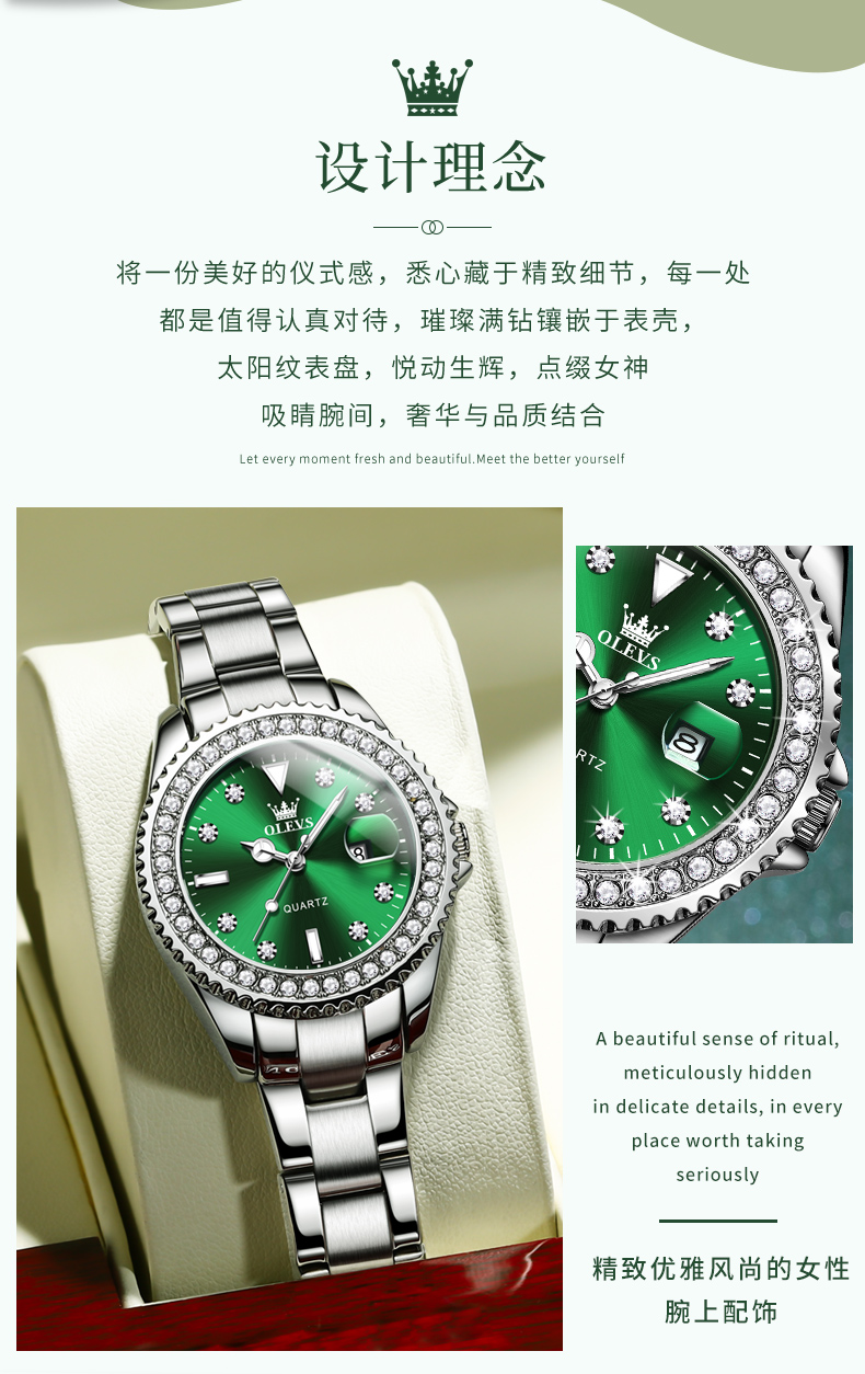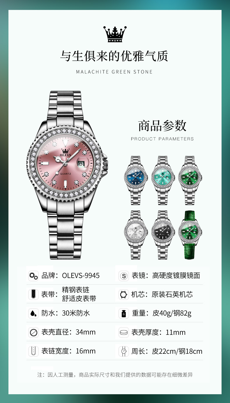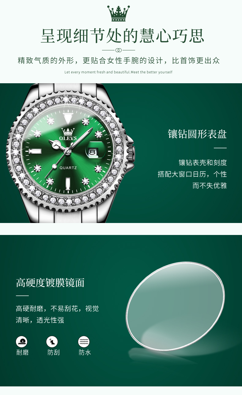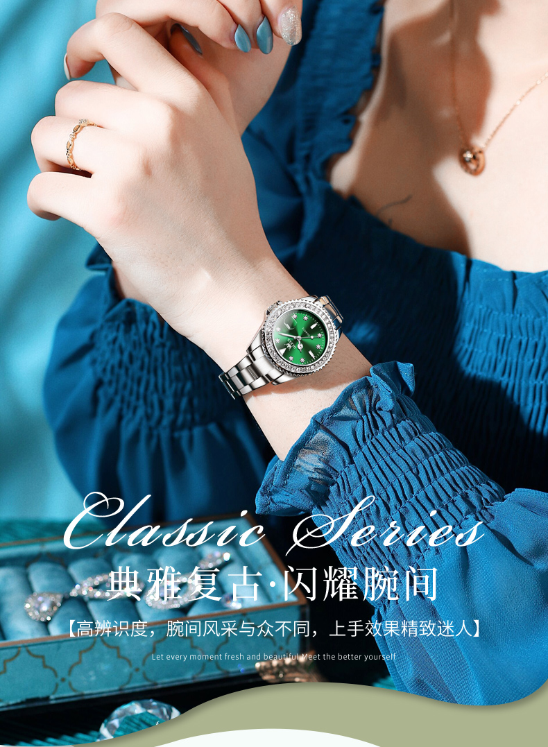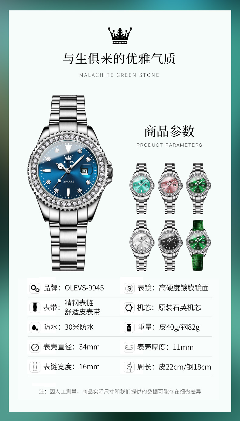 欧利时OLEVS 石英表 9945绿水鬼系列 瑞士认证品牌 女士手表瑞士认证