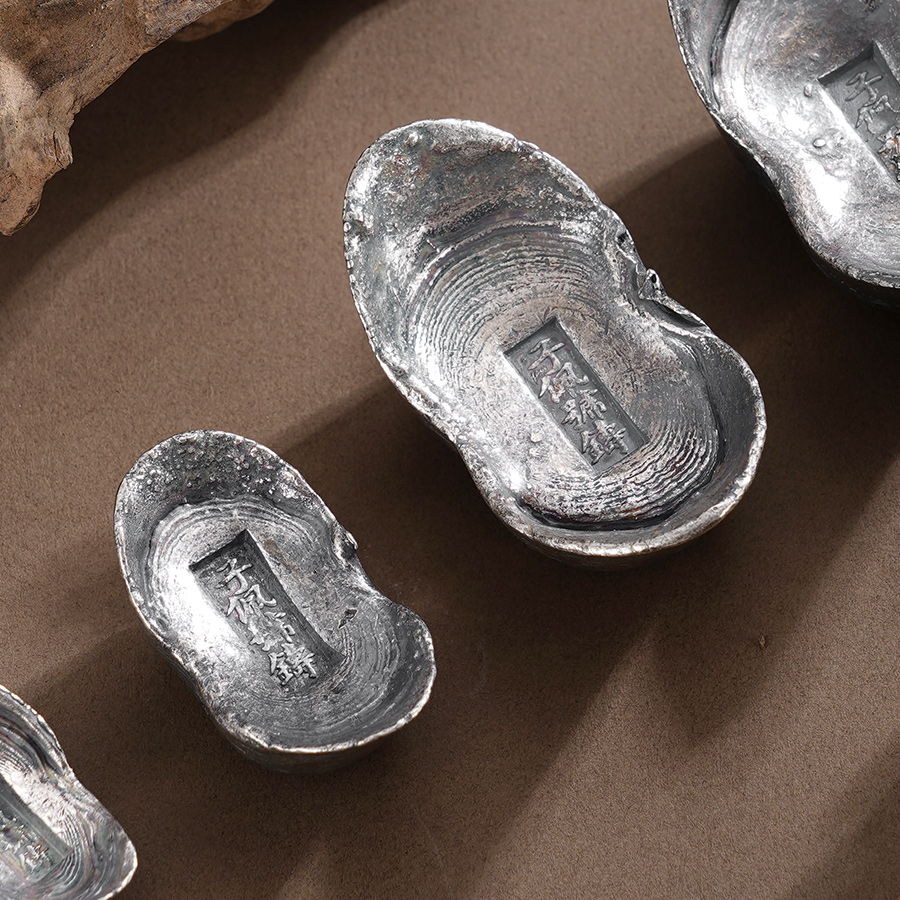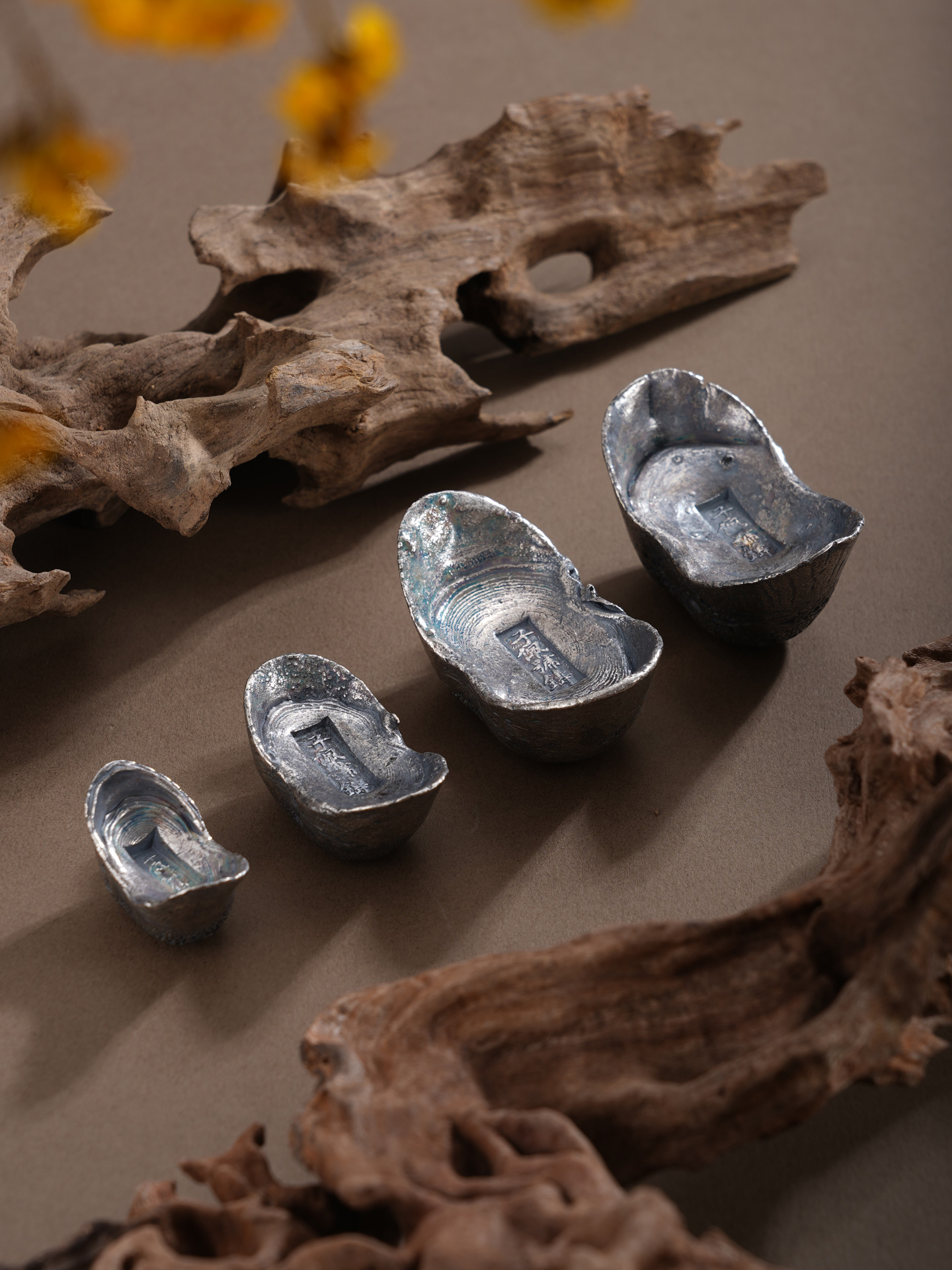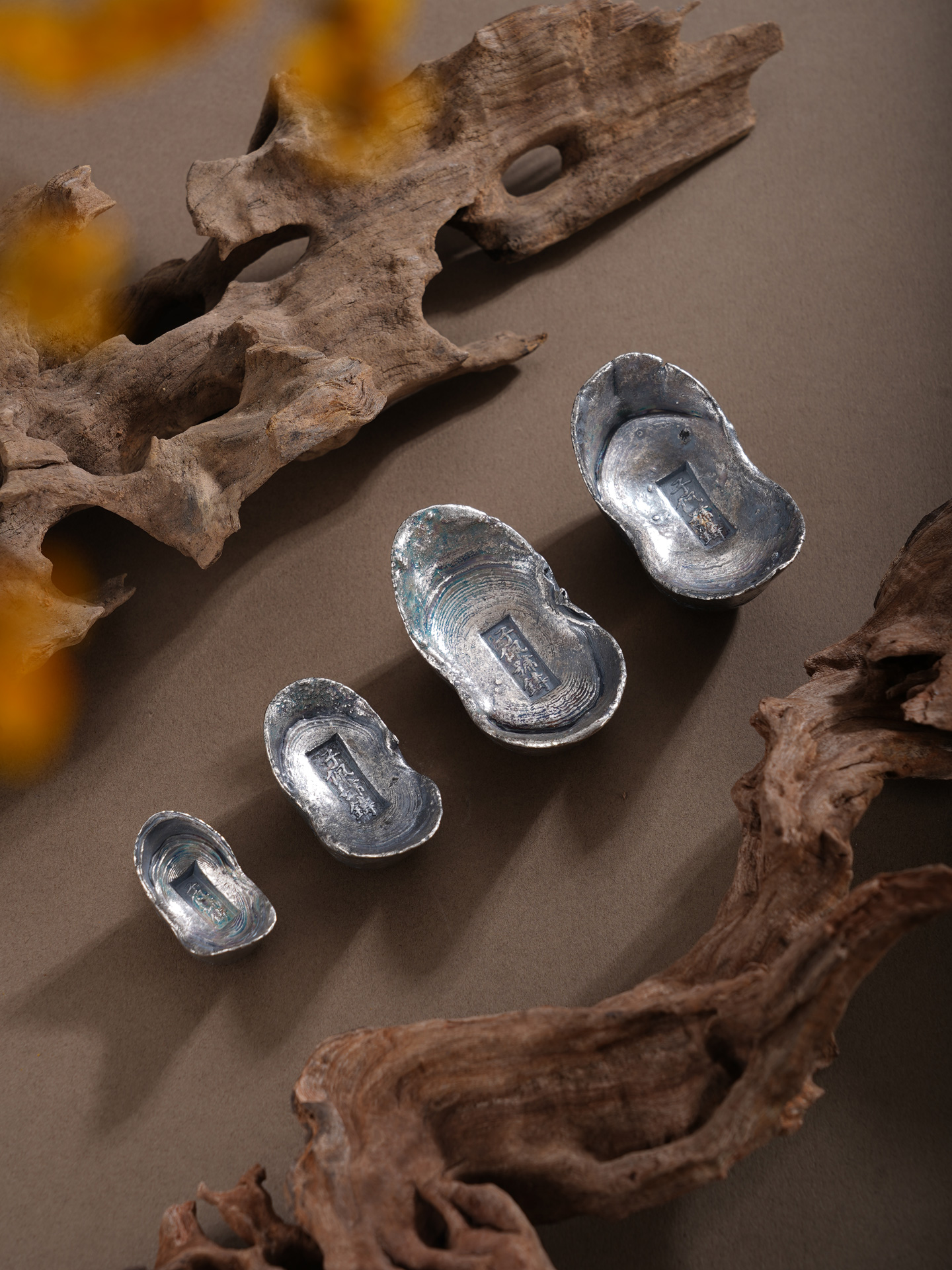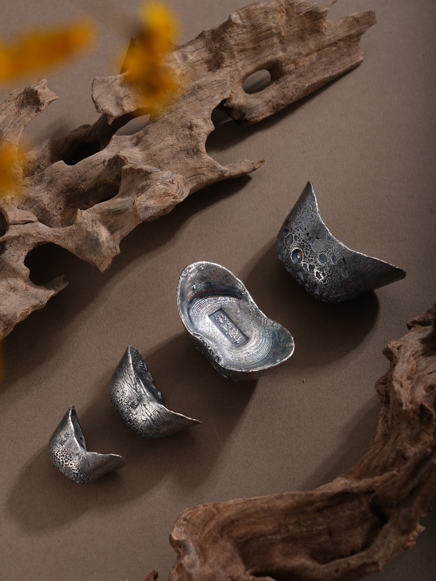 【寓意】:作品设计灵感源自清代陕西“西安省 足色纹银”,采用传统槽锭造型,篆刻“子佩号铸”标识铸造来源。银锭底部采“金珠挂底”设计:通过高纯度足银在特定湿度与蜂窝结构环境中自然氧化,形成均匀的氧化层,既印证银锭的卓越纯度,亦寓意,财源如珠串汇聚。整体寓意福运长存、家业恒昌。