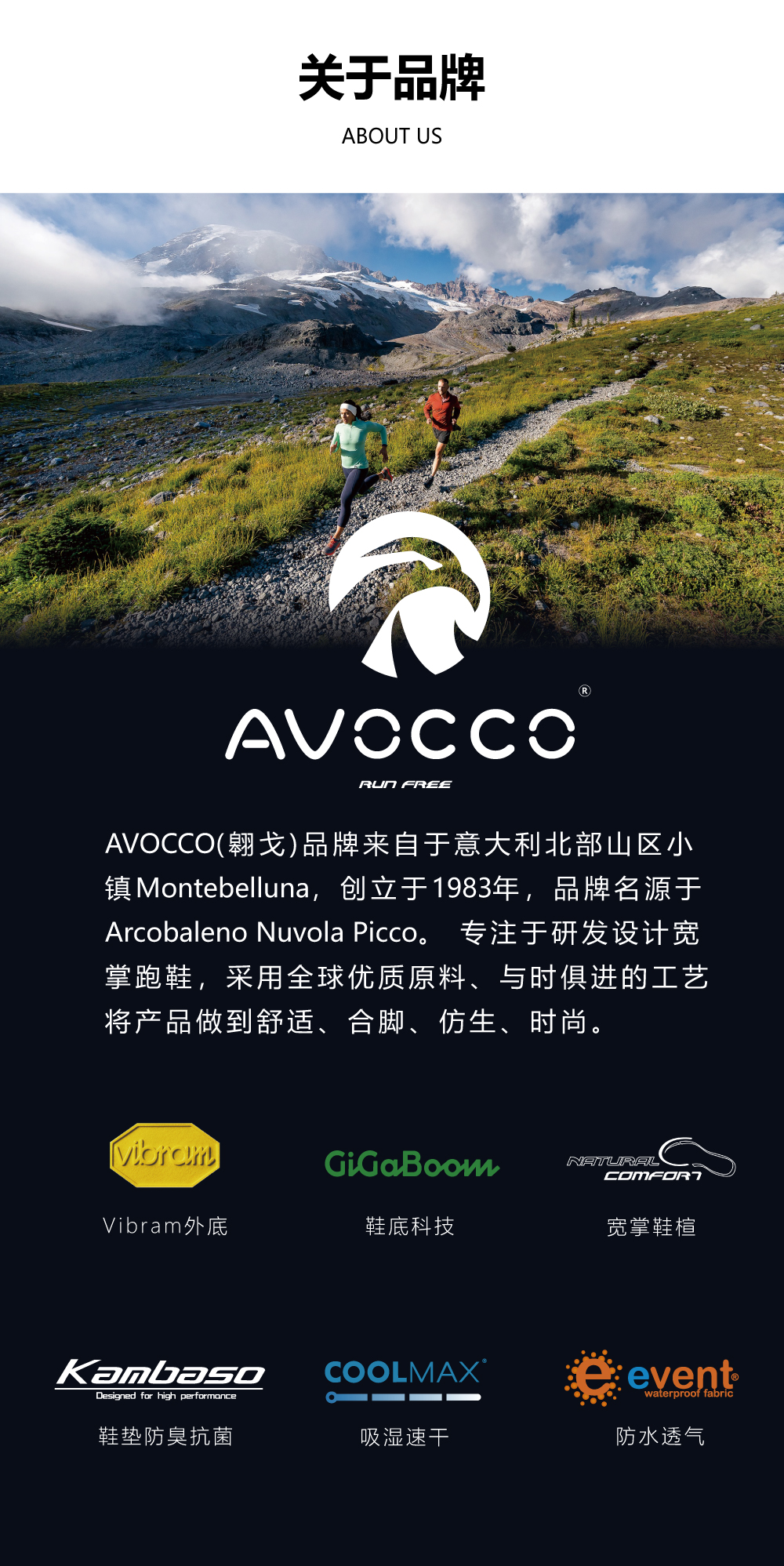AVOCCO品牌来自于意大利著名制鞋小镇—Montebelluna,创立于1983年。秉承旅旅行和运动的基因,采用全球优质原料、与时俱进的工艺将产品做到舒适、合脚、仿生、时尚。