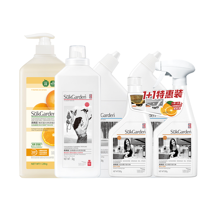 蔬果园家庭清洁大礼包(1kg手洗洗衣液1239+2243洁厕剂500g*2瓶+2120橘彩餐具净1.28kg+2137油污净500g*2瓶)赠送4D凝珠两袋