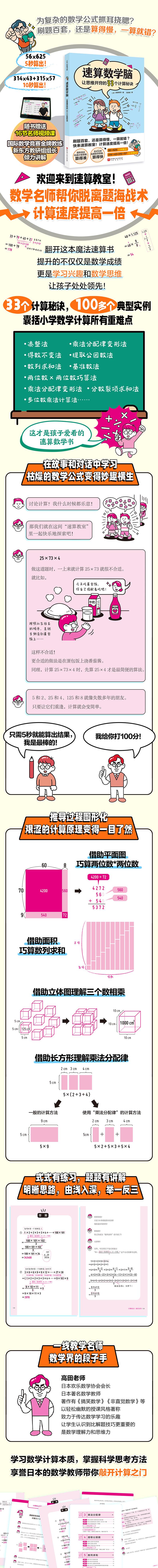 《速算数学脑》里面有风靡日本的八堂数学思维课,分别是凑整法、得数不变、乘法分配律、提取公因数、数列求和、基准数、两位数*两位数、神奇公式。内含33个计算秘诀,100多个精讲实例,几乎囊括小学数学计算所有重难点。每一堂课都用幽默风趣的故事和对话引入,用一问一答的方式提出问题,引发小读者思考,然后一步步讲解计算技巧。每个计算技巧都有精讲精练的例题和复习巩固的练习题。相应题目由浅入深,形式多变,让小读者学会举一反三。最后图形结合深入剖析计算原理,让小读者直击数学计算本质,掌握数学思维方法。本书中,主人公加利最终在计算对决中取得了胜利!你也快来读读吧。和加利一起,享受算得又快又准的乐趣!