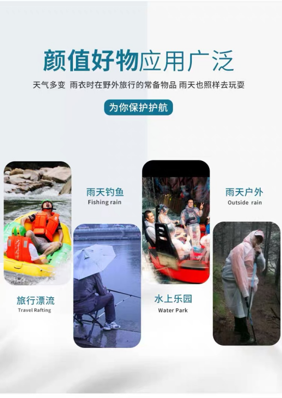 【穿上这件雨衣,雨天也能元气满满】 想象一下,漫步在绵绵细雨中, 你身着我们这款EVA加厚雨衣,任凭雨水狂舞, 始终保持滴水不沾的干爽状态! 别犹豫,赶快抢购你的专属“移动小晴天”, 让每一场雨都成为展现你从容风采的独特舞台!