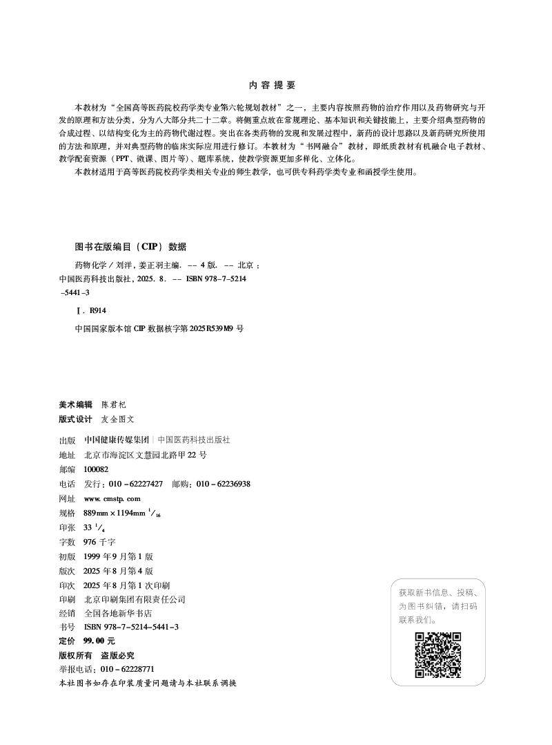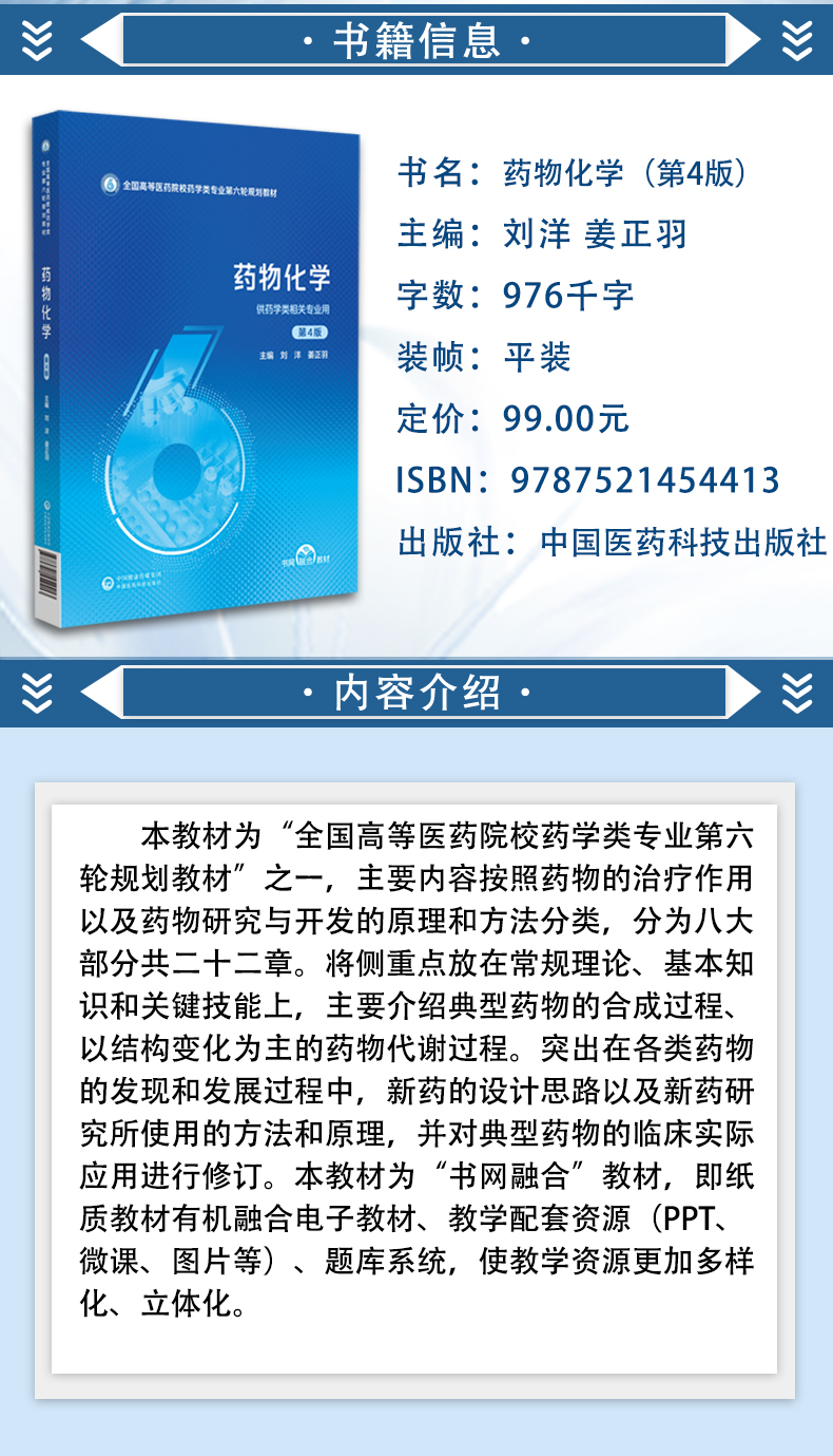药物化学 第4四版(全国高等医药院校药学类专业第六轮规划教材)刘洋 姜正羽 供药学类相关专业用9787521454413中国医药科技出版社