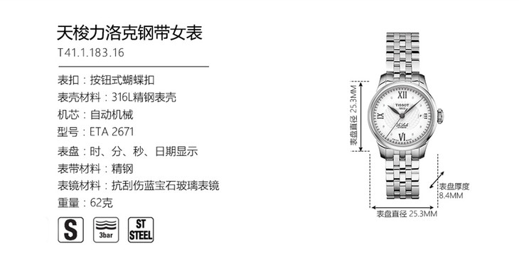 | 防水 | 30 m | 表带 | 精钢表链 按钮式蝴蝶扣 |