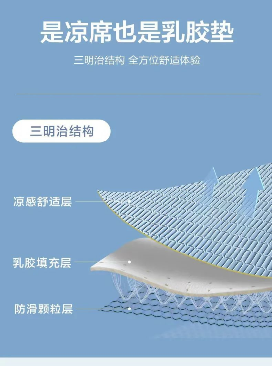 乳胶凉席由 凉感舒适层➕乳胶填充层➕防滑颗粒层构成 三层结构,层层透气,Q弹柔软☁️ 可以很好的缓冲人体压力