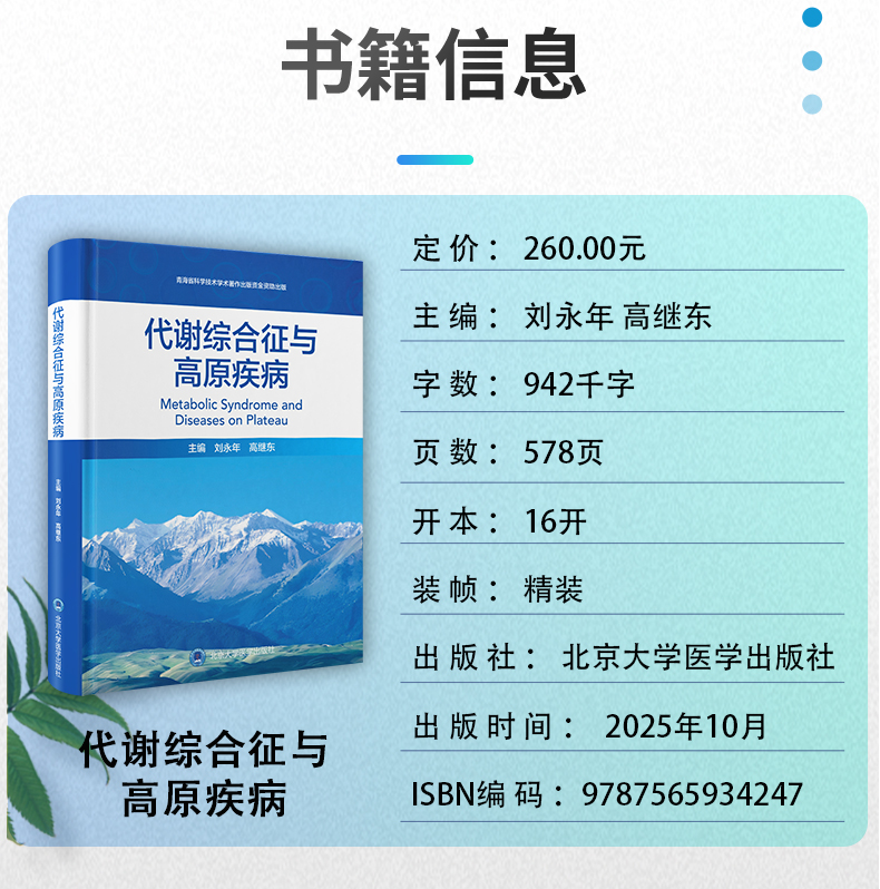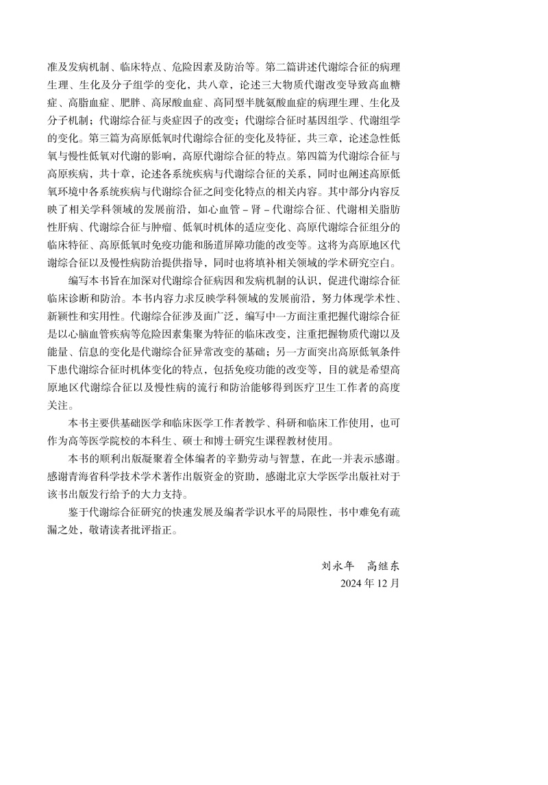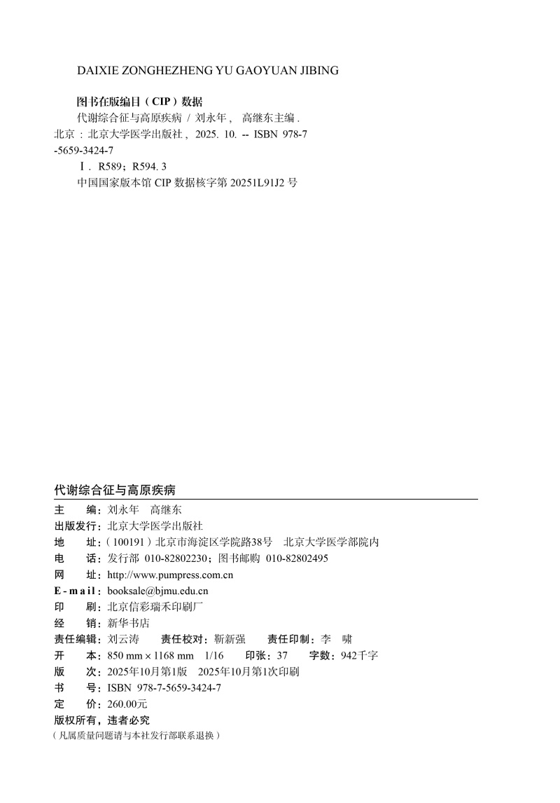 代谢综合征与高原疾病 刘永年 高继东 为高原地区代谢综合征及慢性病防治提供指导 填补相关领域学术研究空白 北京大学医学出版社