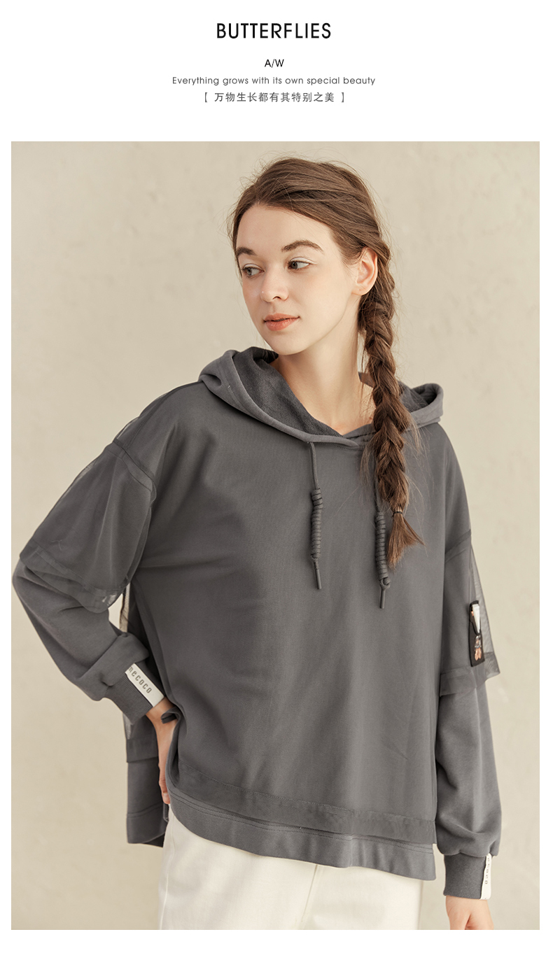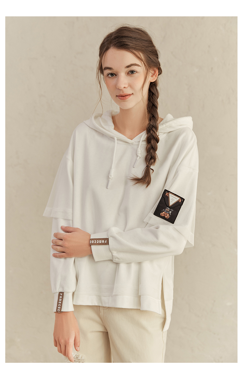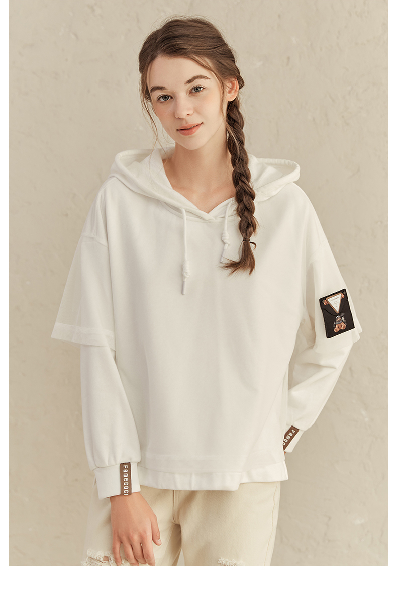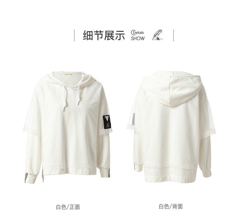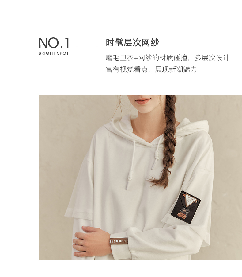 Famecoco范可儿白色连帽卫衣女款ins网纱拼接上衣F221BL008