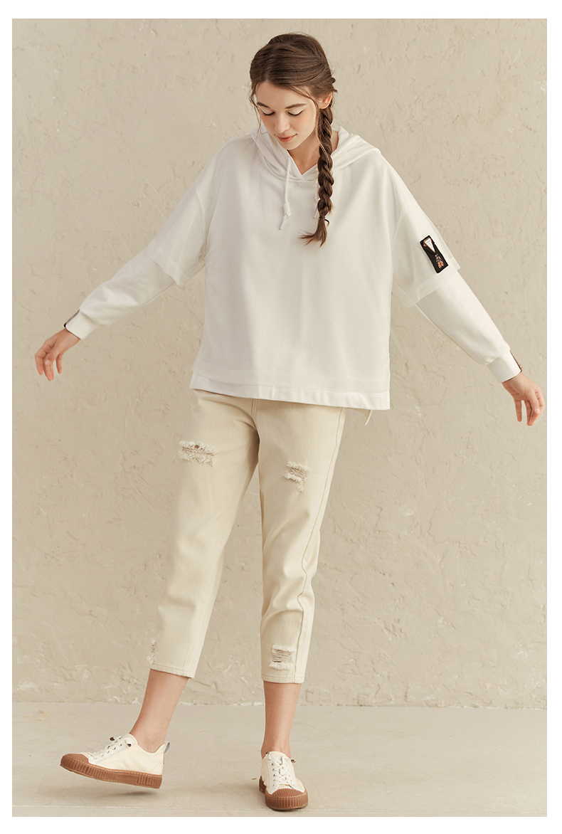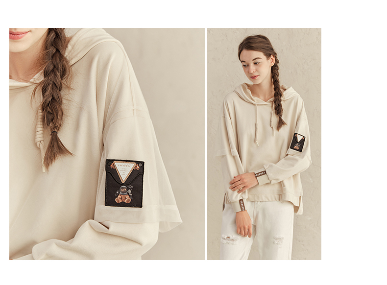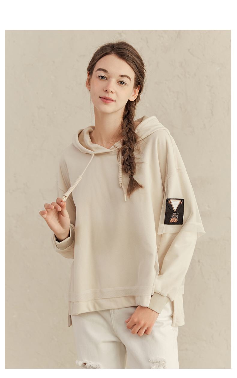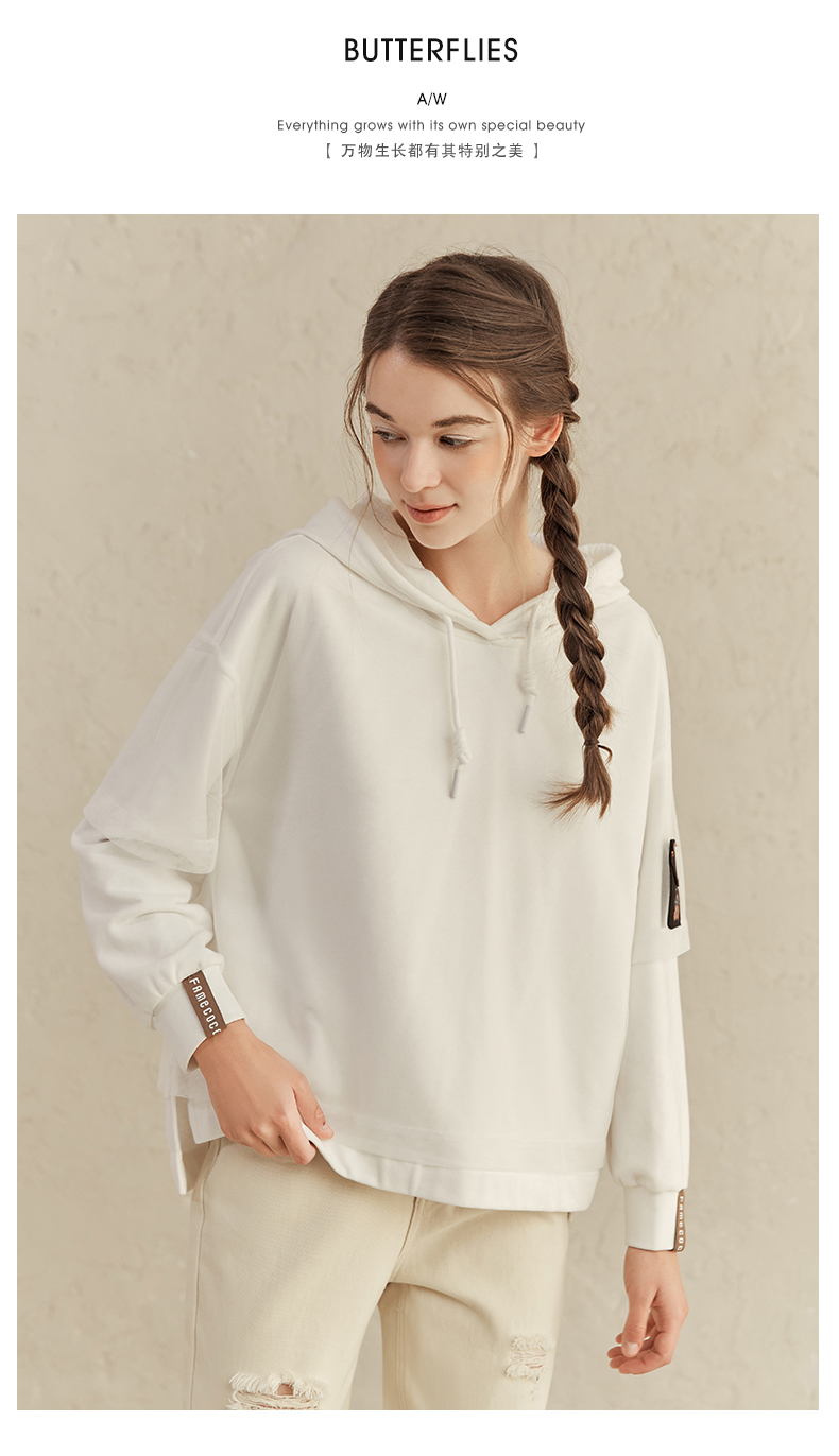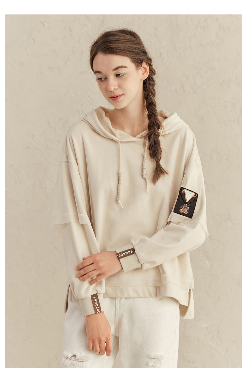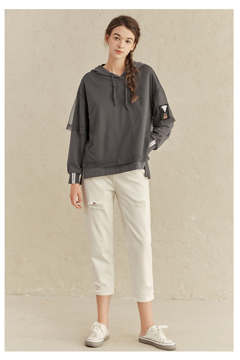 Famecoco范可儿白色连帽卫衣女款ins网纱拼接上衣F221BL008