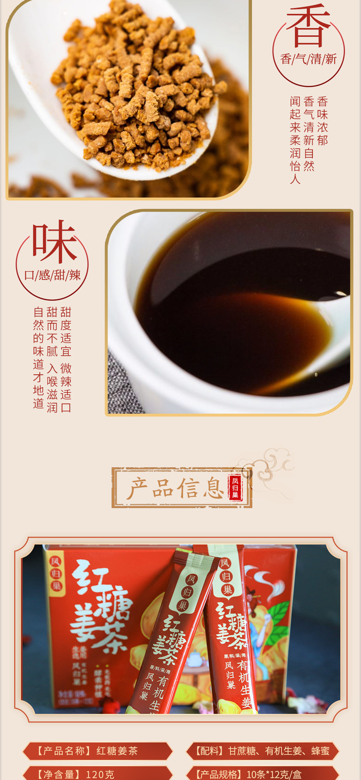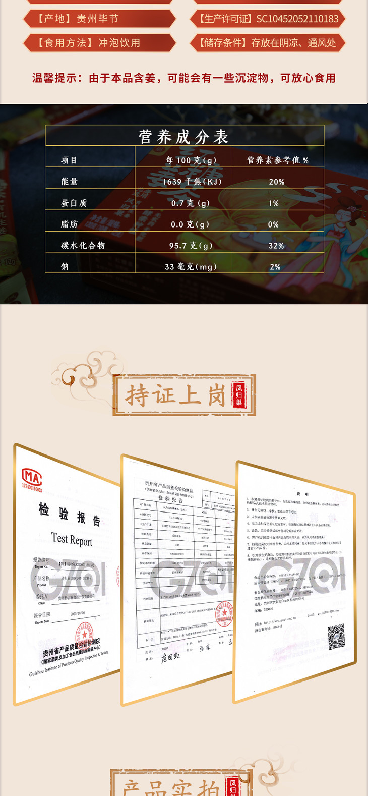原材料选自凤归巢有机种植基地自产生姜,不含麦芽糊精。口感微辣,色泽暗红,生姜味道浓郁,是驱寒除湿、暖胃、风寒、月经期间佳品。