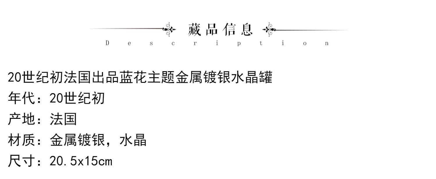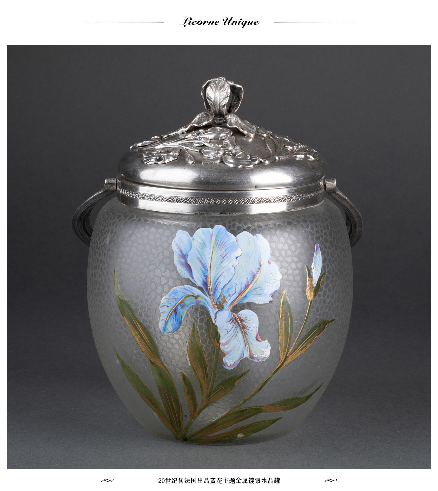独角鹿西洋古董20世纪初法国出品蓝花主题金属镀银水晶罐饼干桶