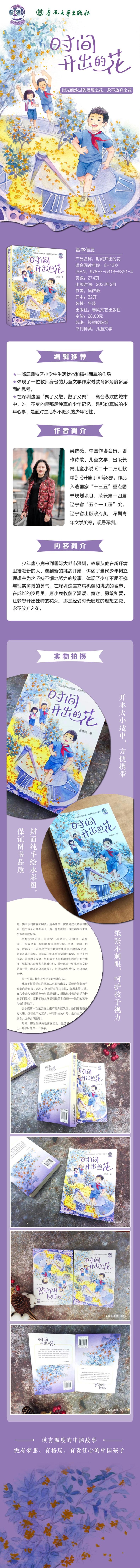 《时间开出的花》是一部原创长篇儿童小说。少年唐小鹿来到国际大都市深圳,故事从他在新环境里接触新的人、遇到新的挑战开始,讲述了当代少年树立理想并为之坚持不懈地努力的故事,体现了少年不屈不挠与现实拼搏的勇气。在深圳这座充满机遇和挑战的城市,在飘满桂花味道的桂花香小学,在成长的岁月里,唐小鹿收获了温暖、宽容、勇敢和爱,让梦想开出独特的花朵。那是经受时光磨炼的理想之花,永不放弃之花。作者吴依薇是一名人民教师,也是一位儿童文学作家,她在儿童文学创作中深入生活,刻画复杂的生活环境以及当下孩童所面临的困难,使人物角色在环境中体悟人生,完成自我的蜕变和成长。 读者对象:小学中高年级学生。