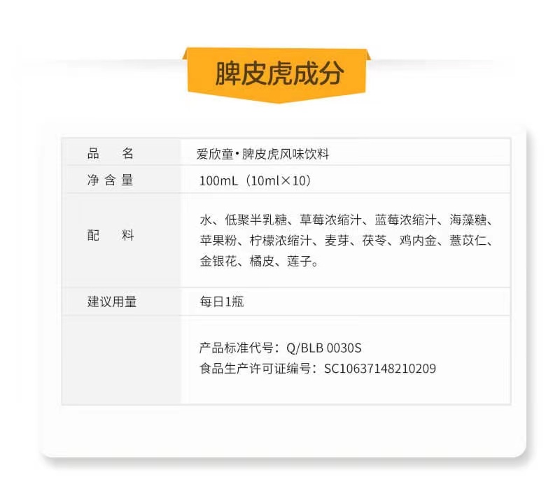 爱欣童脾皮虎饮品10ml*10支 添加益生元鸡内金