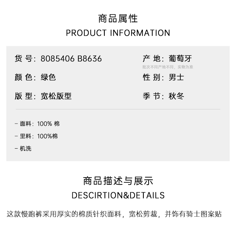 BURBERRY 巴宝莉 男士马术骑士设计贴花棉质慢跑裤 绿色 8085406 B8636