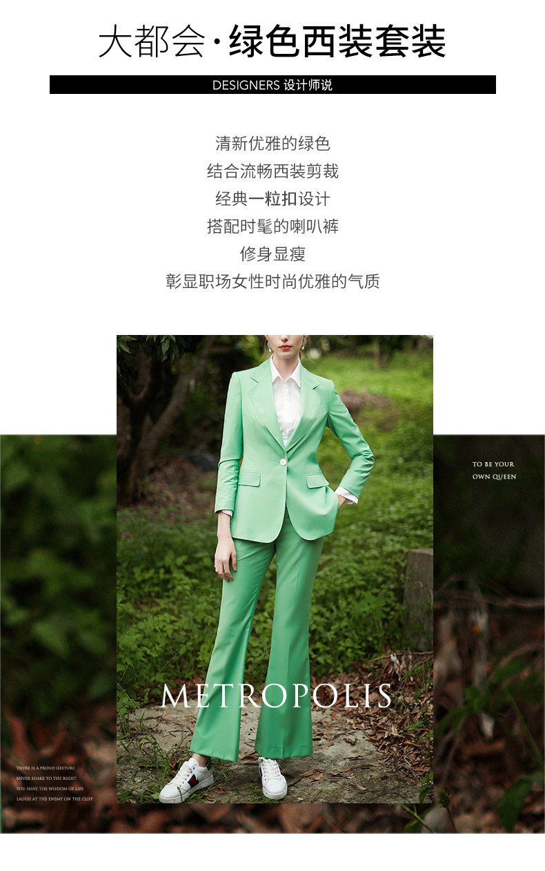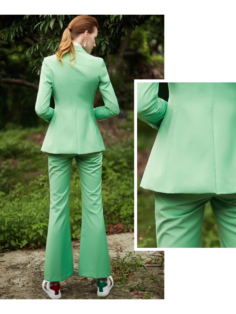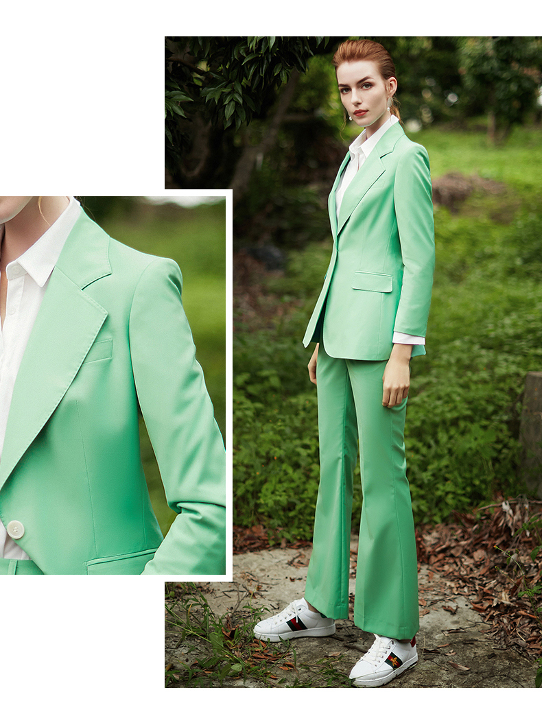 IWY/时尚职业装女装清新绿色西服套装经典喇叭裤两件套修身正装CP9333