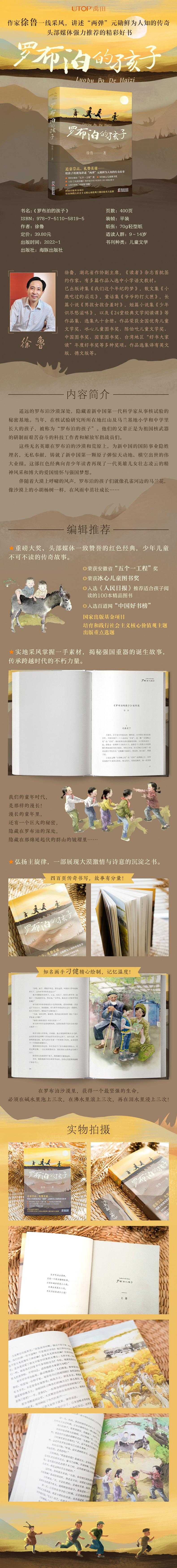 著名作家徐鲁曾获有关部门批准,进入罗布泊腹地和孔雀河边,深入马兰基地和当年的核试验研究所所在地红山,以及第一颗原子弹的爆心现场,实地考察和体验生活,采访到了许多生动鲜活的故事细节,获得了第一手创作素材,并最终创作完成长篇小说《罗布泊的孩子》。南疆军区戎边老战士唐传林先生为本书题写书名。