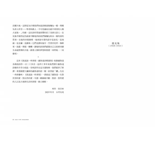 《我述說一些事情》一書敘述了聶魯達一生對世界的愛,對自然的愛,可謂一闕綿綿不斷,對詩、對所愛的人以及大地與生活的深情、動人戀歌。──陳黎