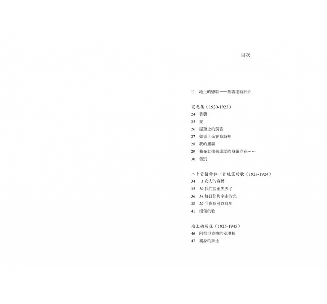 從情感豐沛、積極樂觀的聶魯達,用充滿自信的宏亮聲音對我們說話;到生命將盡「夕陽下的老人」,他對孤寂、時間發出喟歎,並企圖攔阻歷史的洪流以及生命流逝的軌跡。本書呈現了聶魯達人生各階段,從第一本詩集《霞光集》,就倍受矚目。第二本詩集《二十首情詩和一首絕望的歌》則是情詩詩句「愛是這麼短,遺忘是這麼長」的出處,也是最為人所知的作品之一,充滿耐人玩味的美麗與哀愁。之後他輾轉從南美洲來到東方,在仰光、可倫坡和爪哇等地生活,因語言的隔閡、文化的差距、剝削和貧窮的異國現象,使他感受到孤寂而寫下了《地上的居住》。隨著年紀增長與局勢的變遷,他的創作有了變化。