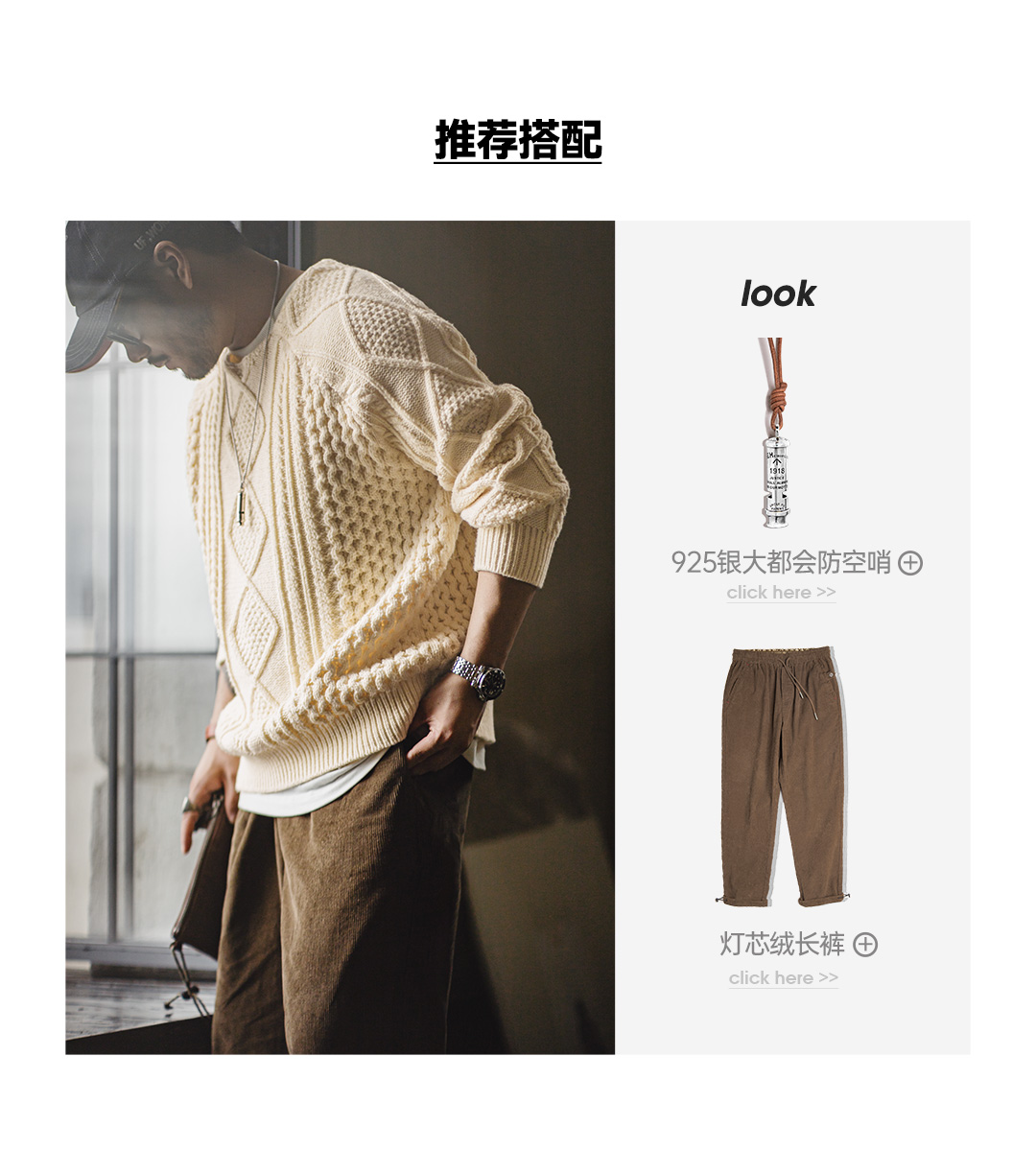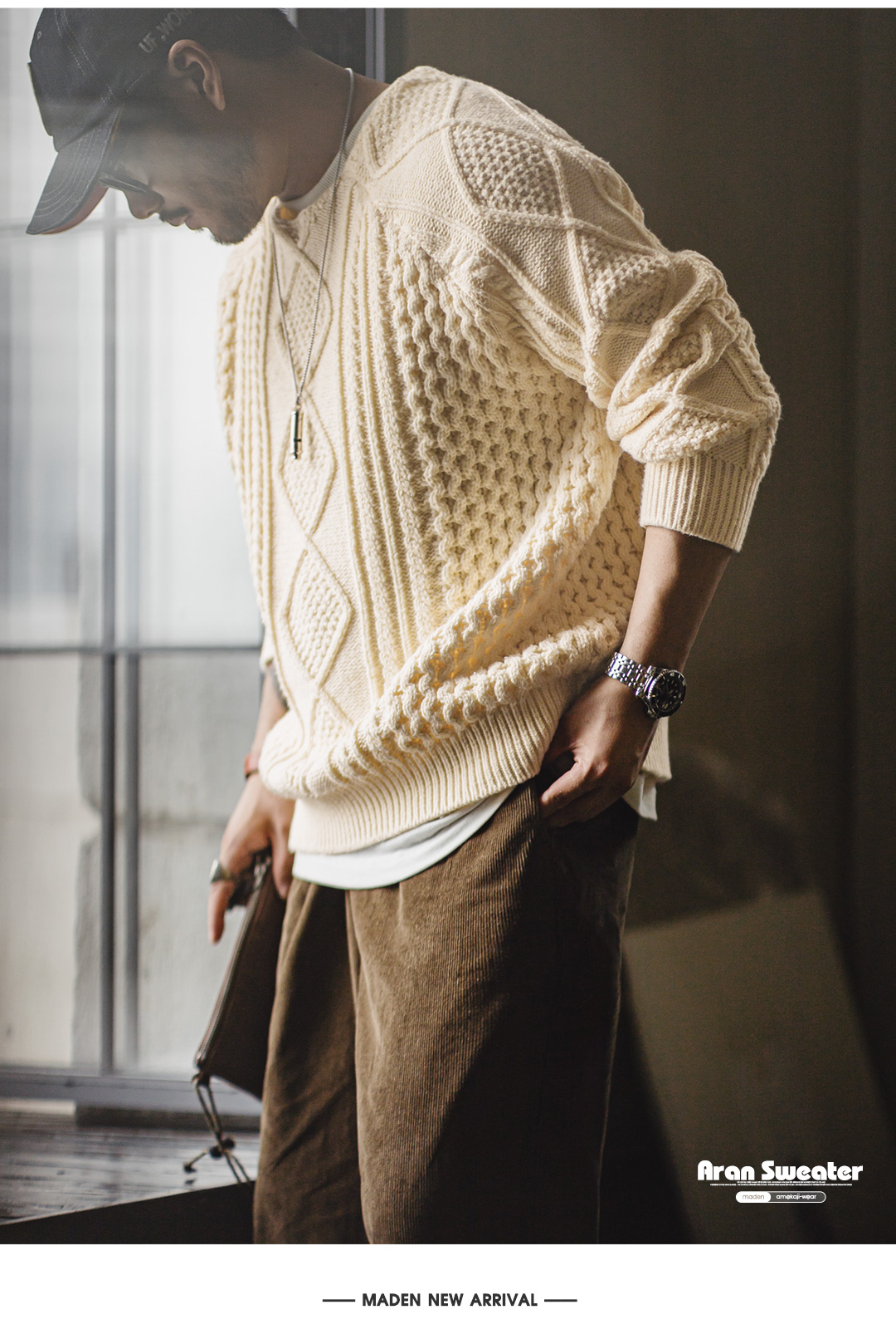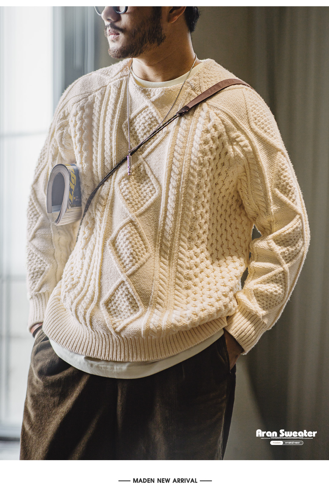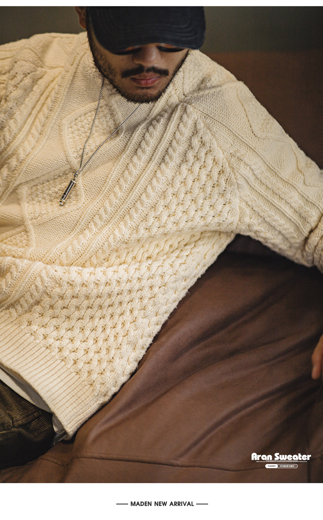 马登工装 美式复古绞花阿兰毛衣圆领百搭编织麻花针织衫男秋冬 米