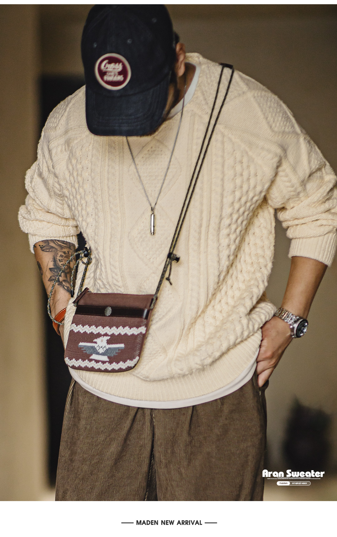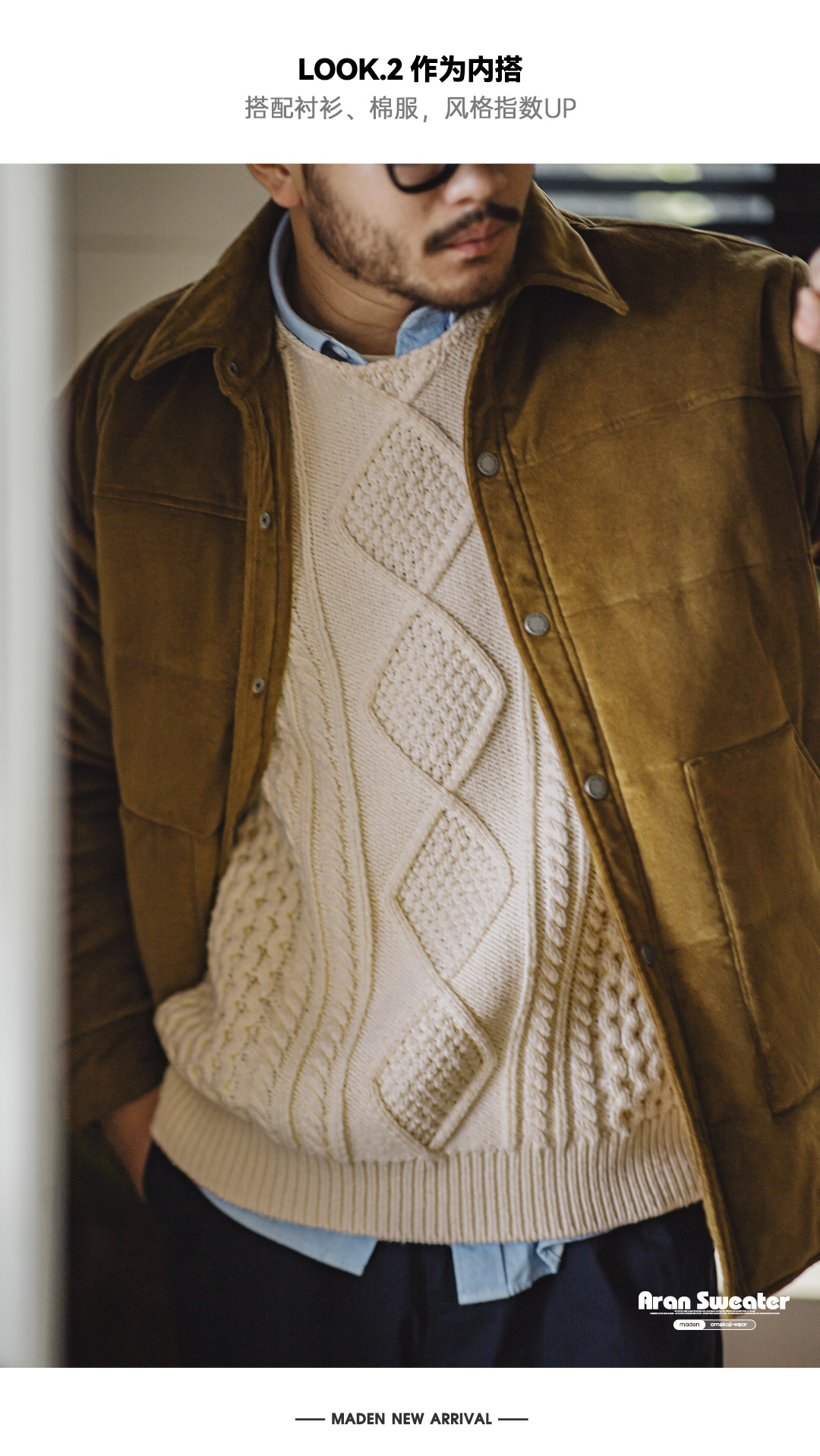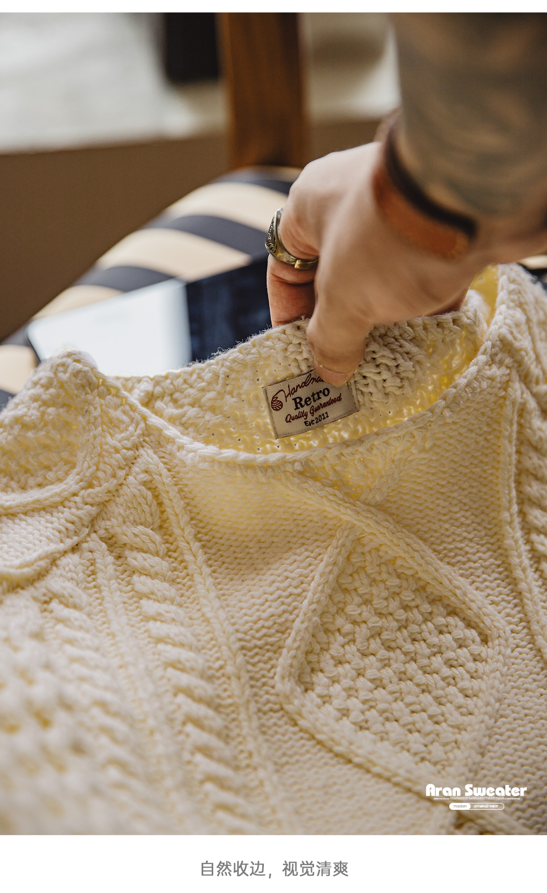 马登工装 美式复古绞花阿兰毛衣圆领百搭编织麻花针织衫男秋冬 米