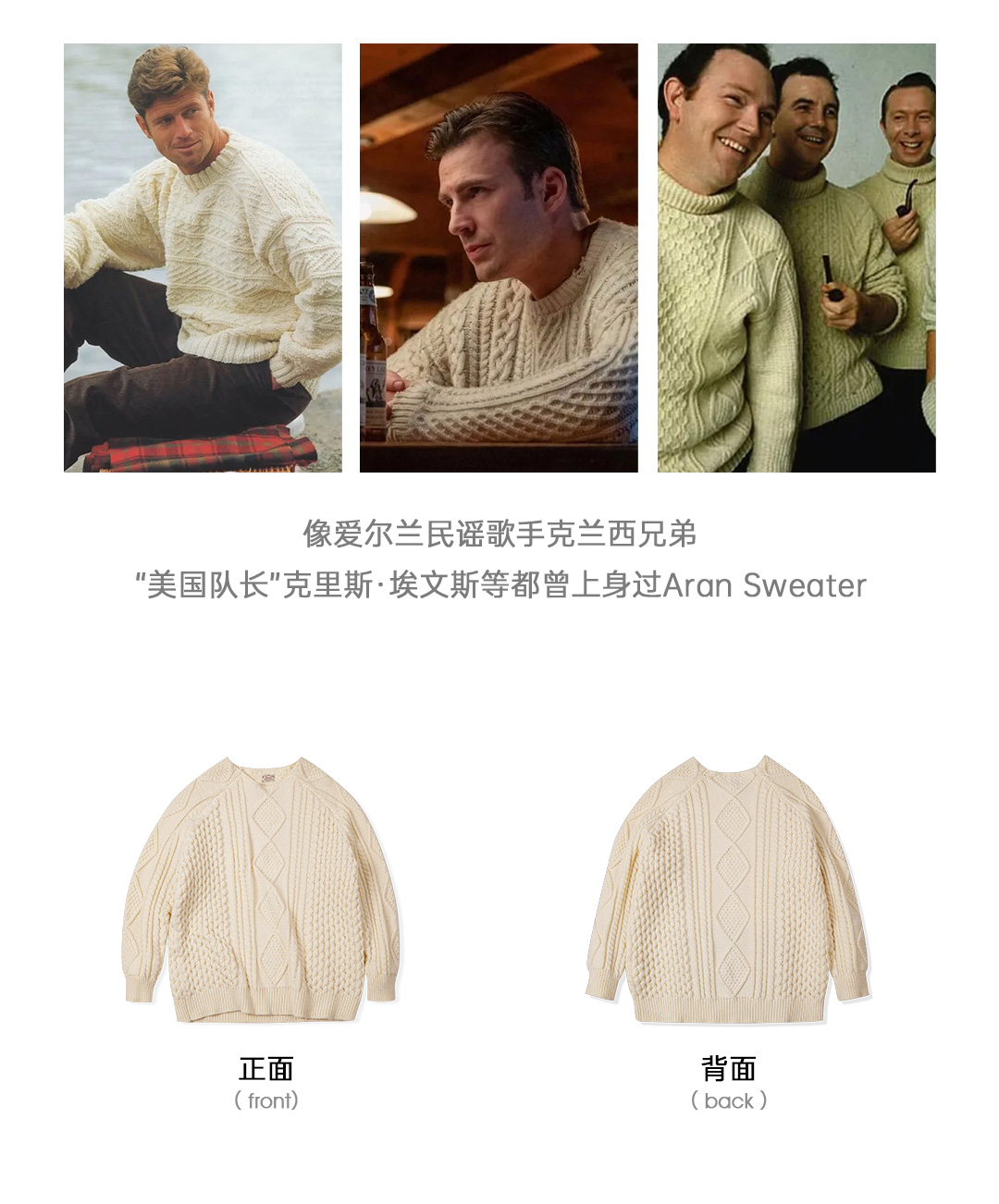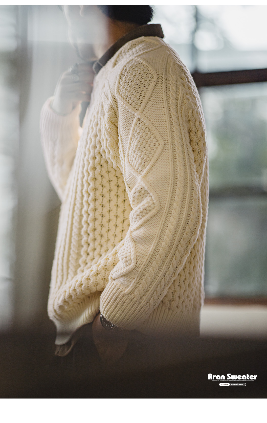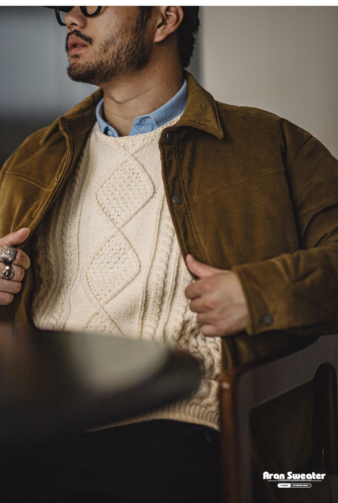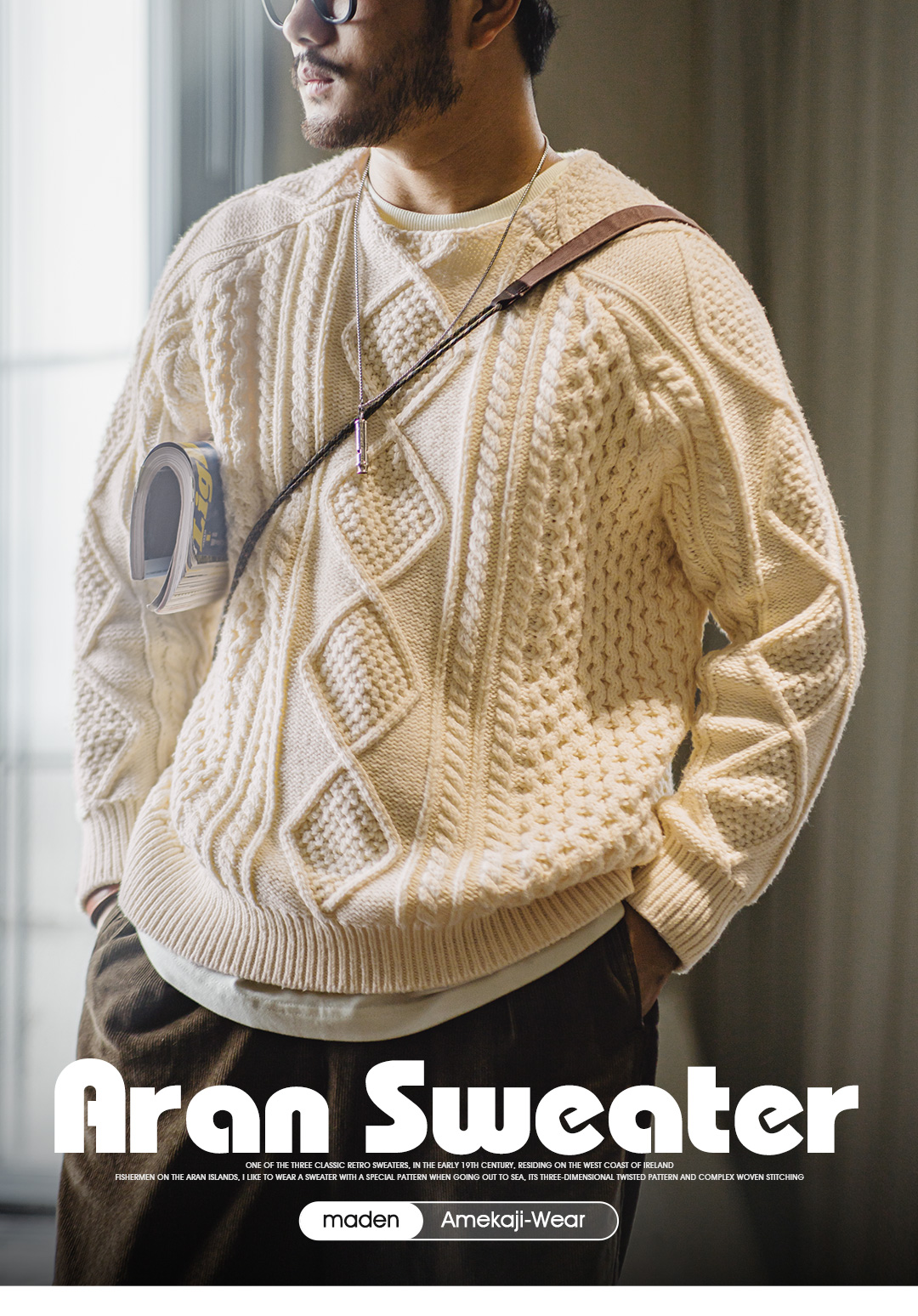 马登工装 美式复古绞花阿兰毛衣圆领百搭编织麻花针织衫男秋冬 米