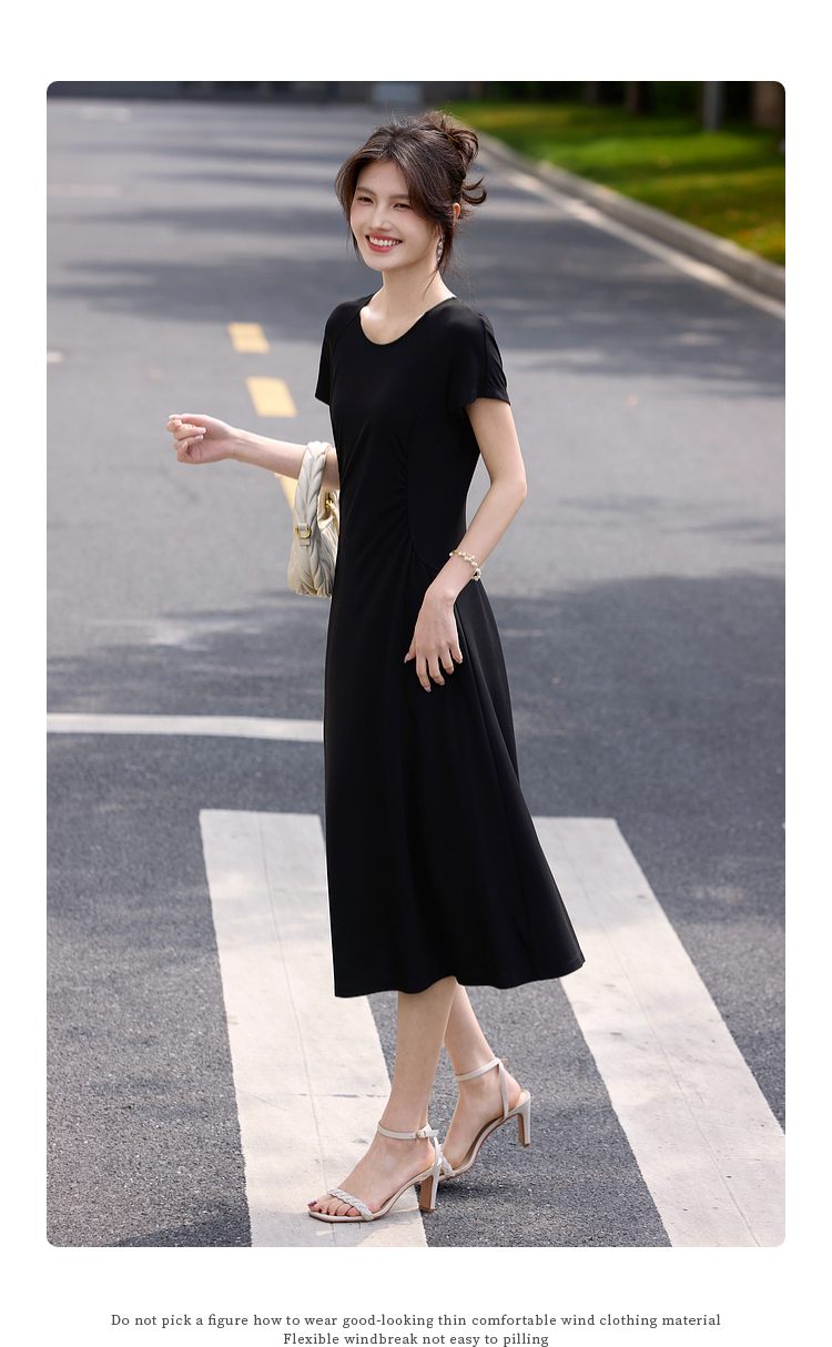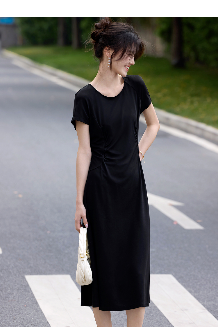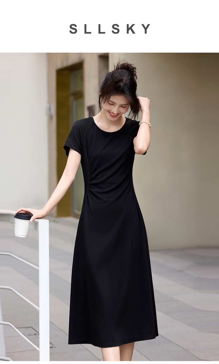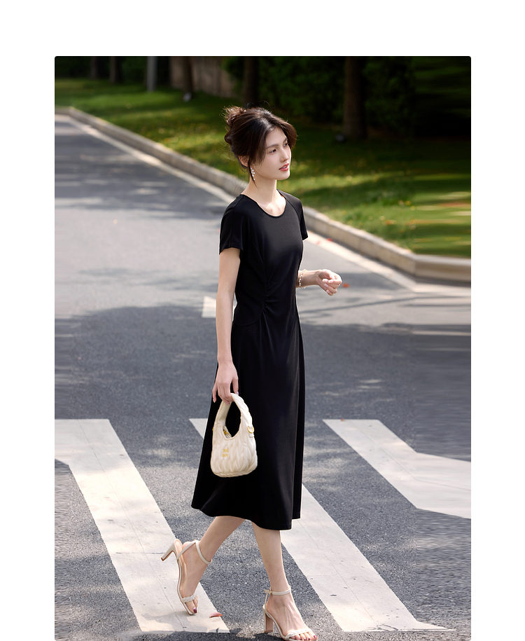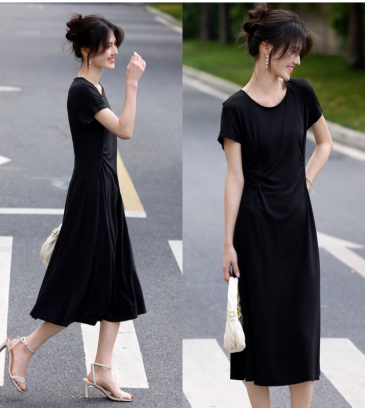 【周末秒杀】熙世界赫本风黑色连衣裙女收腰显瘦夏季针织冰丝T恤裙子2025新款