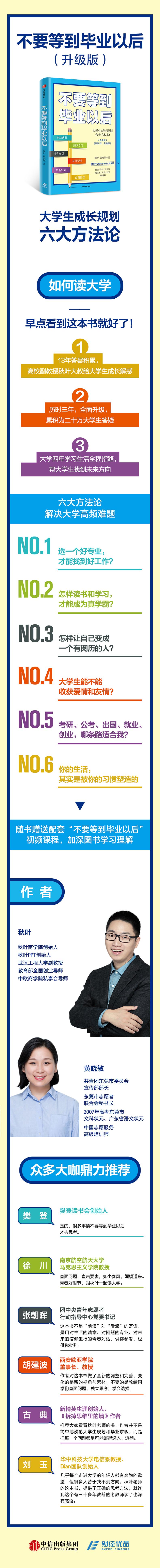 3.历时三年,全面升级。作者花费三年时间对老版的《不要等到毕业以后》做了全面调整,使其从原来的十章内容变成大学生非常关心的六大话题。