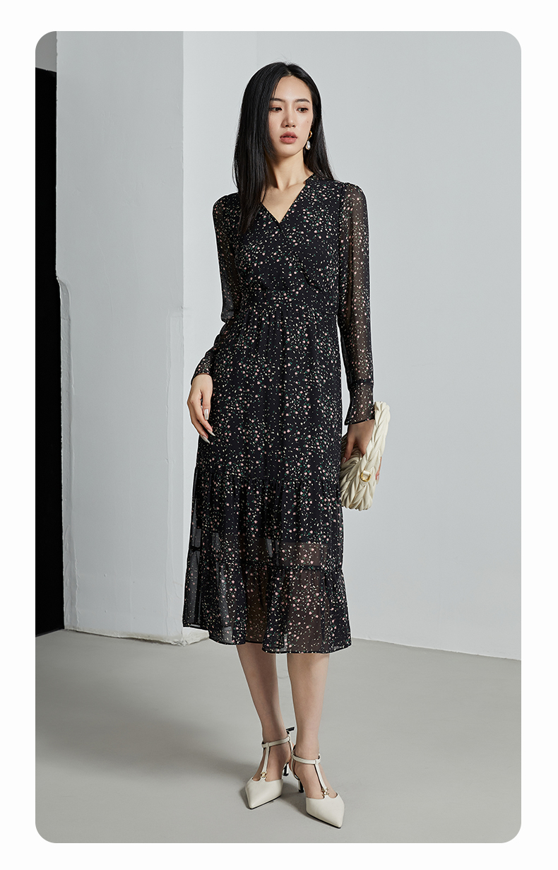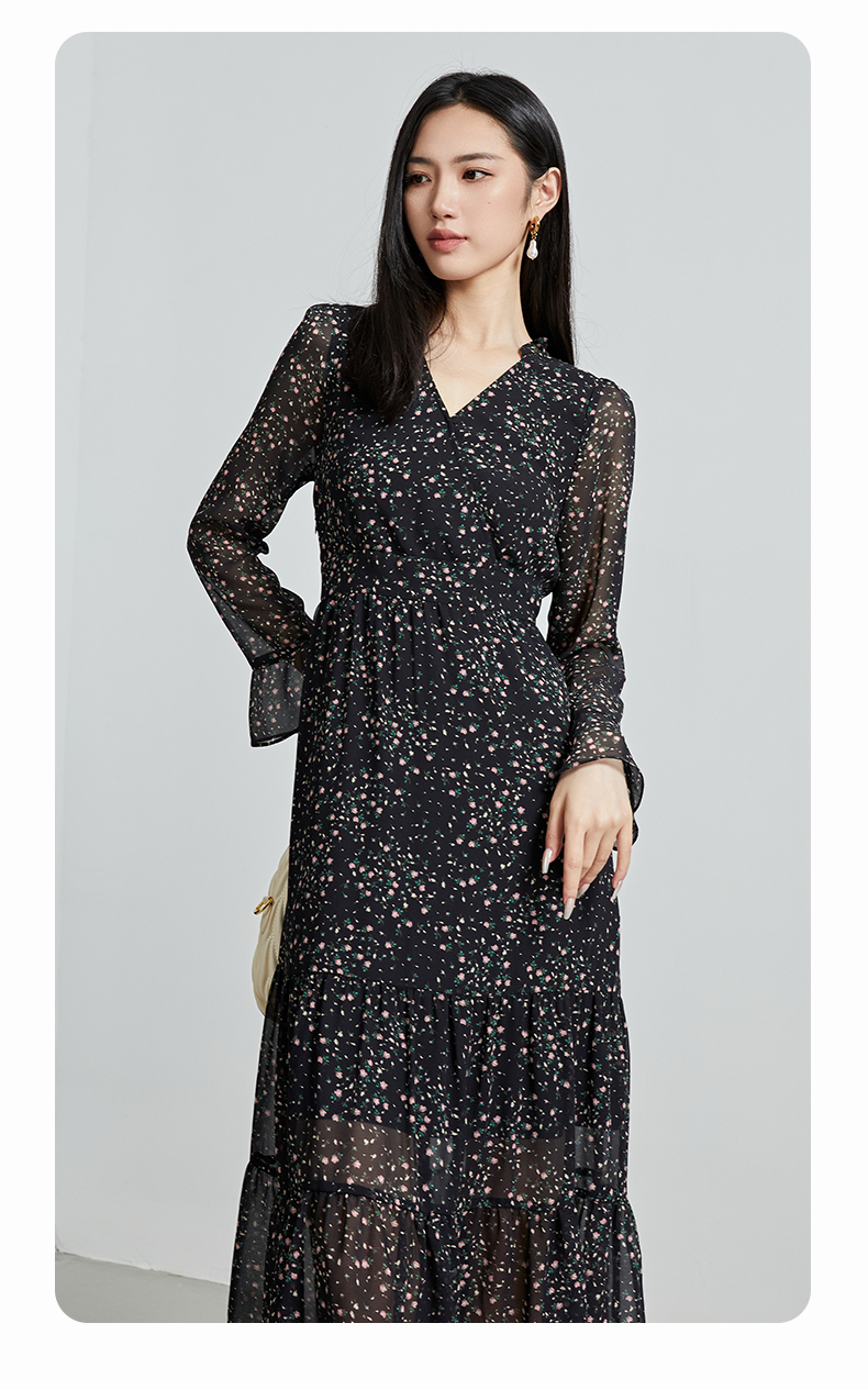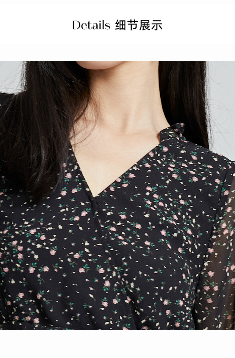 oldcolour秋季新款设计感显瘦时尚V领碎花长袖连衣裙女P321009A1
