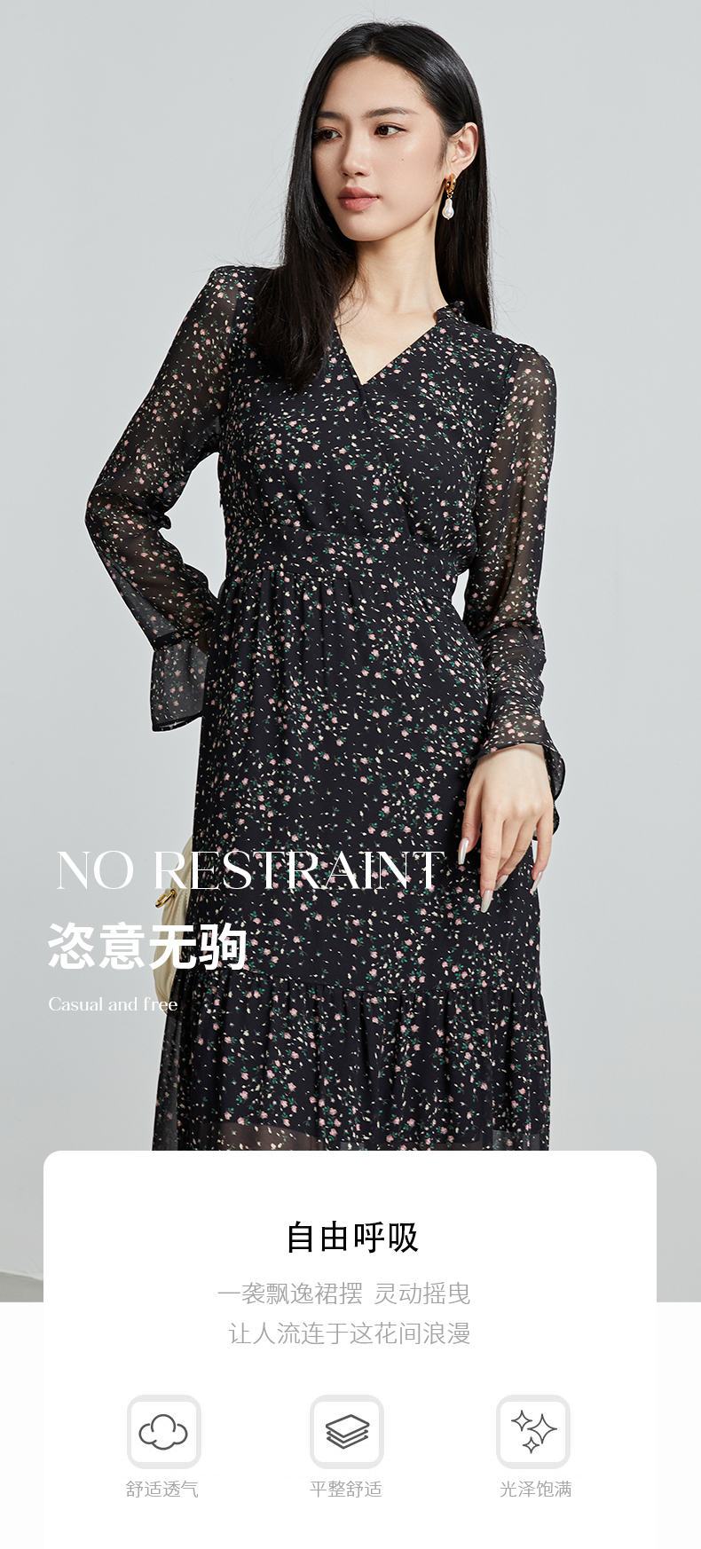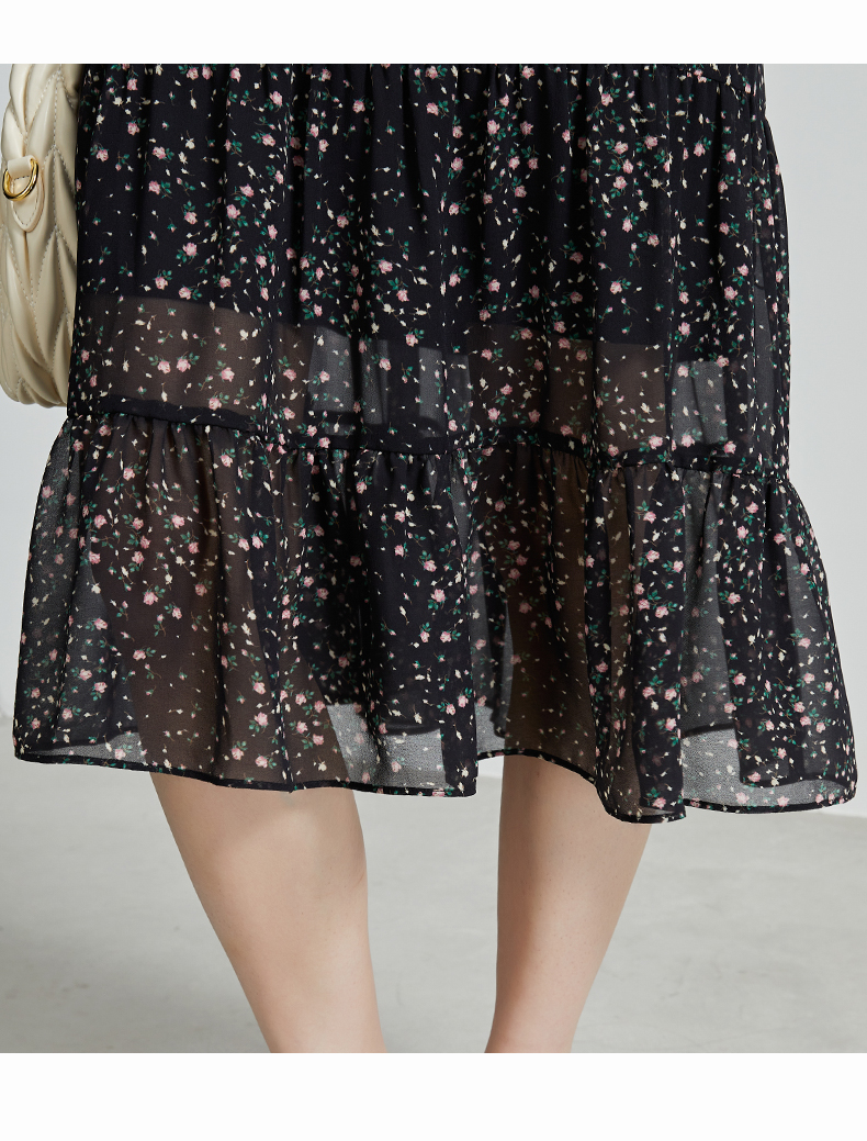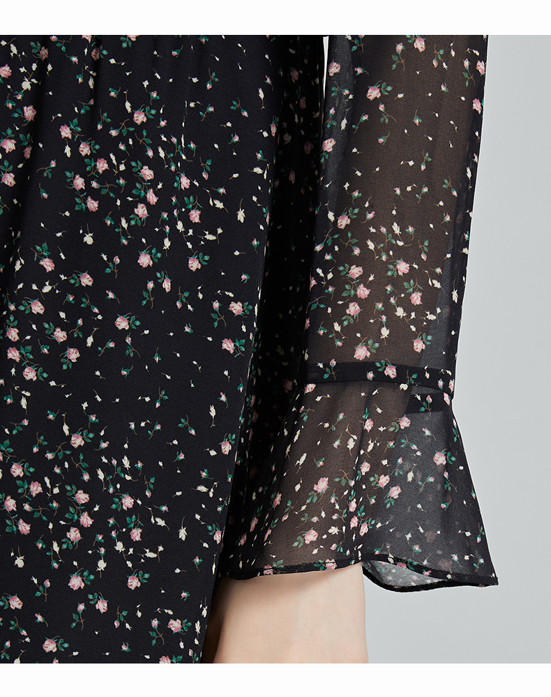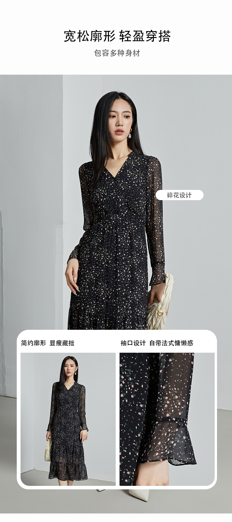oldcolour秋季新款设计感显瘦时尚V领碎花长袖连衣裙女P321009A1
