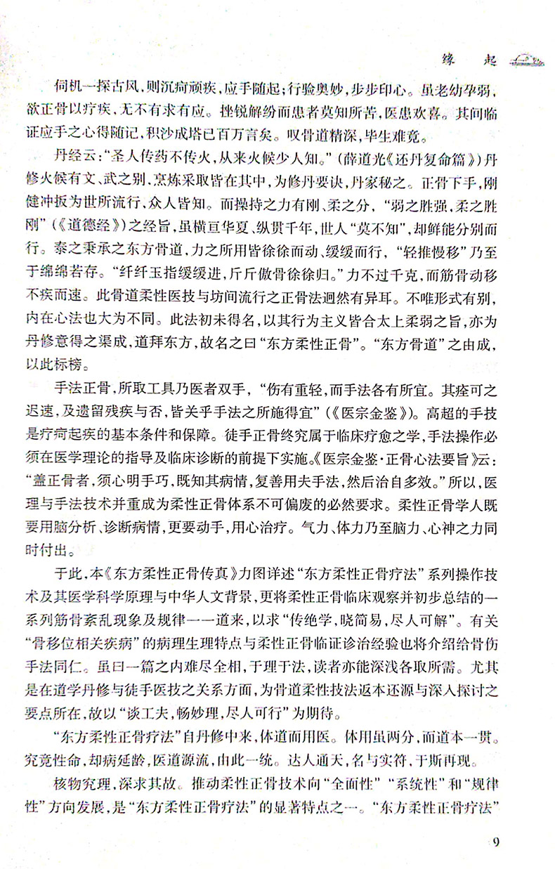 《东方柔性正骨传真》力图详述“东方柔性正骨疗法”系列操作技术及其医学科学原理与中华人文背景,更将柔性正骨临床观察并初步总结的一系列筋骨紊乱移位现象及规律一一道来,以求“传绝学,晓简易,尽人可解”。有关“骨移位相关疾病”的病理生理特点与柔性正骨临证诊治经验也将介绍给骨伤手法同仁。虽曰一篇之内难尽全相,于理于法,读者亦能深浅各取所需。尤其是在道学丹修与徒手医技之关系方面,为骨道柔性技法欲返本还源与深入探讨之要点所在,故以“谈工夫,畅妙理,尽人可行”为期待。