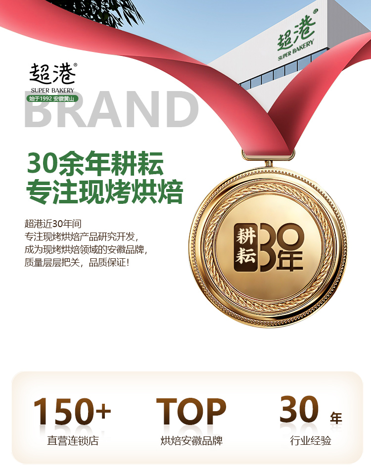 超港创立于1992年,是一家集生产销售面包、蛋糕、传统糕点、中西点于一体的全国性连锁烘焙企业,拥有百余家直营门店。超港以“玩味烘焙、文创美学”为经营理念。
