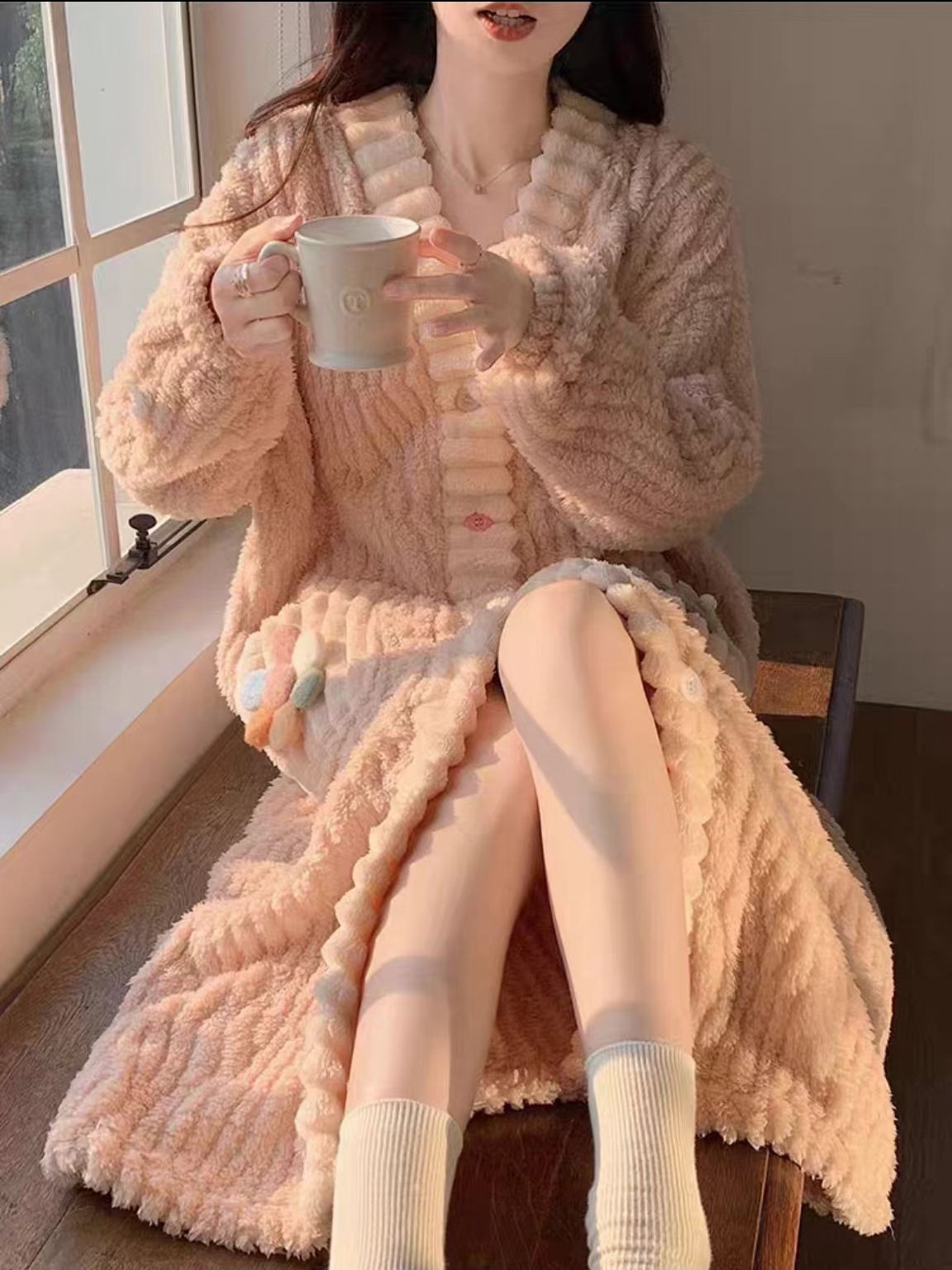 【蓬松柔软!防风蓄温】双面加厚,冬季珊瑚绒睡衣套装女秋冬加厚保暖开衫睡袍可外穿彩虹甜美睡衣家居服。rc